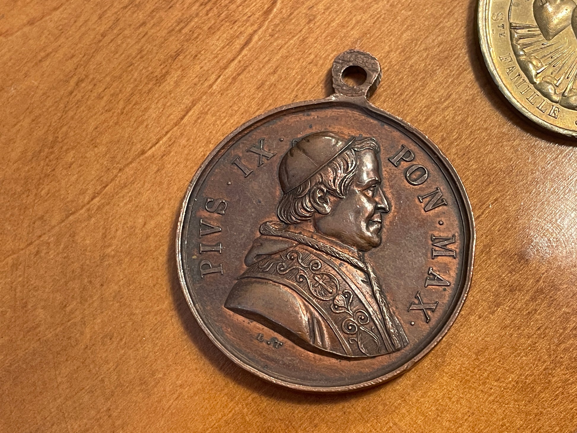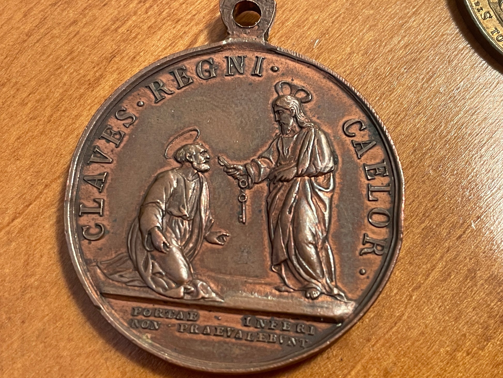 A bronze medal of Pope Pius IX, depicting St Peter receiving the Keys (Clavis Regni Caelor).