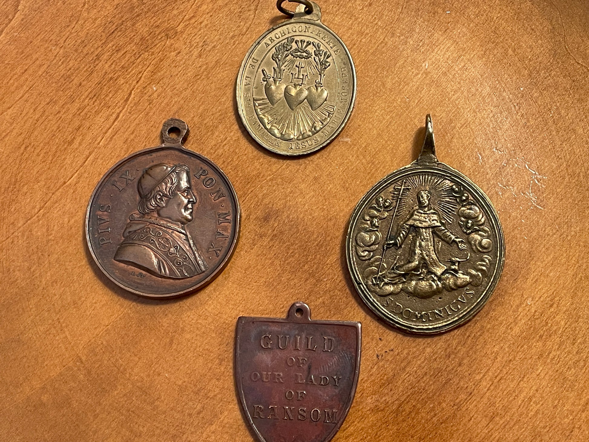Set of Four Antique Catholic Medals – Pius IX, Our Lady of Ransom, Sacred Heart & Our Lady of Mount Carmel, c.1870–1920
