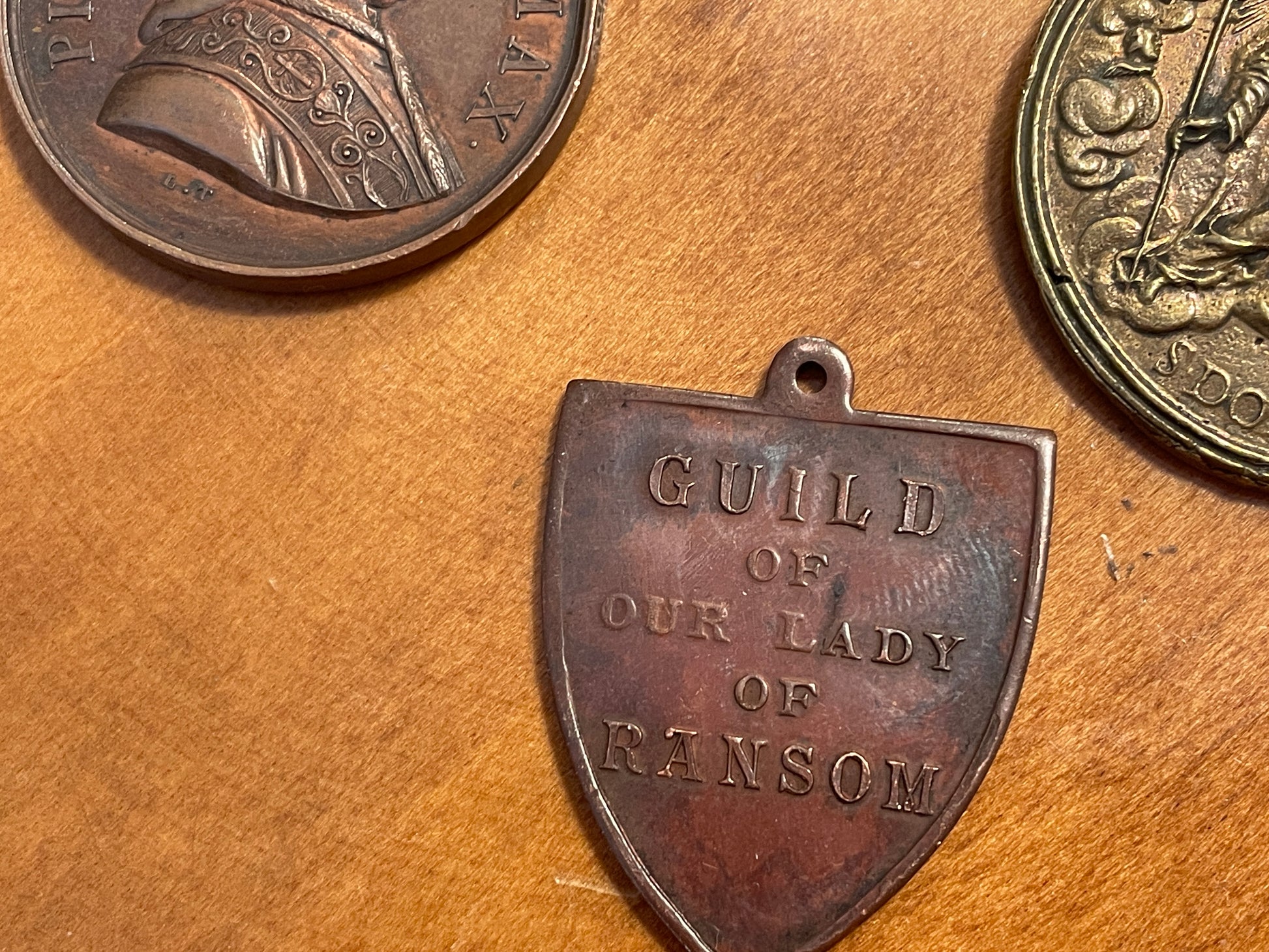A shield-shaped Guild of Our Lady of Ransom medal, an English devotional piece.