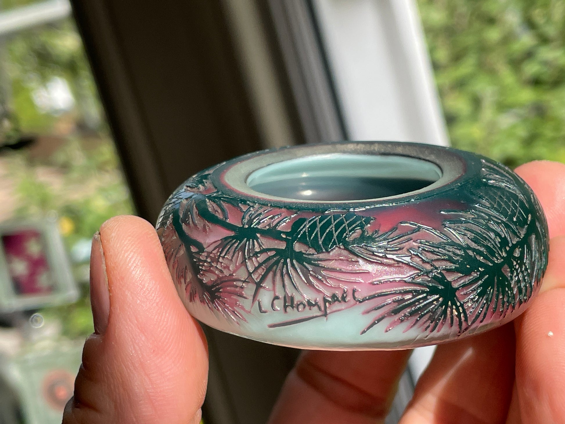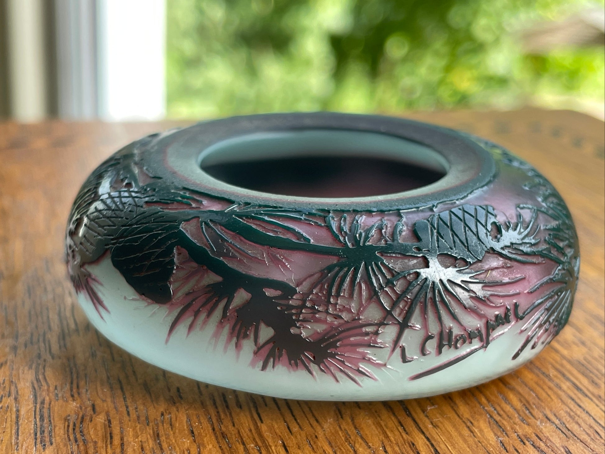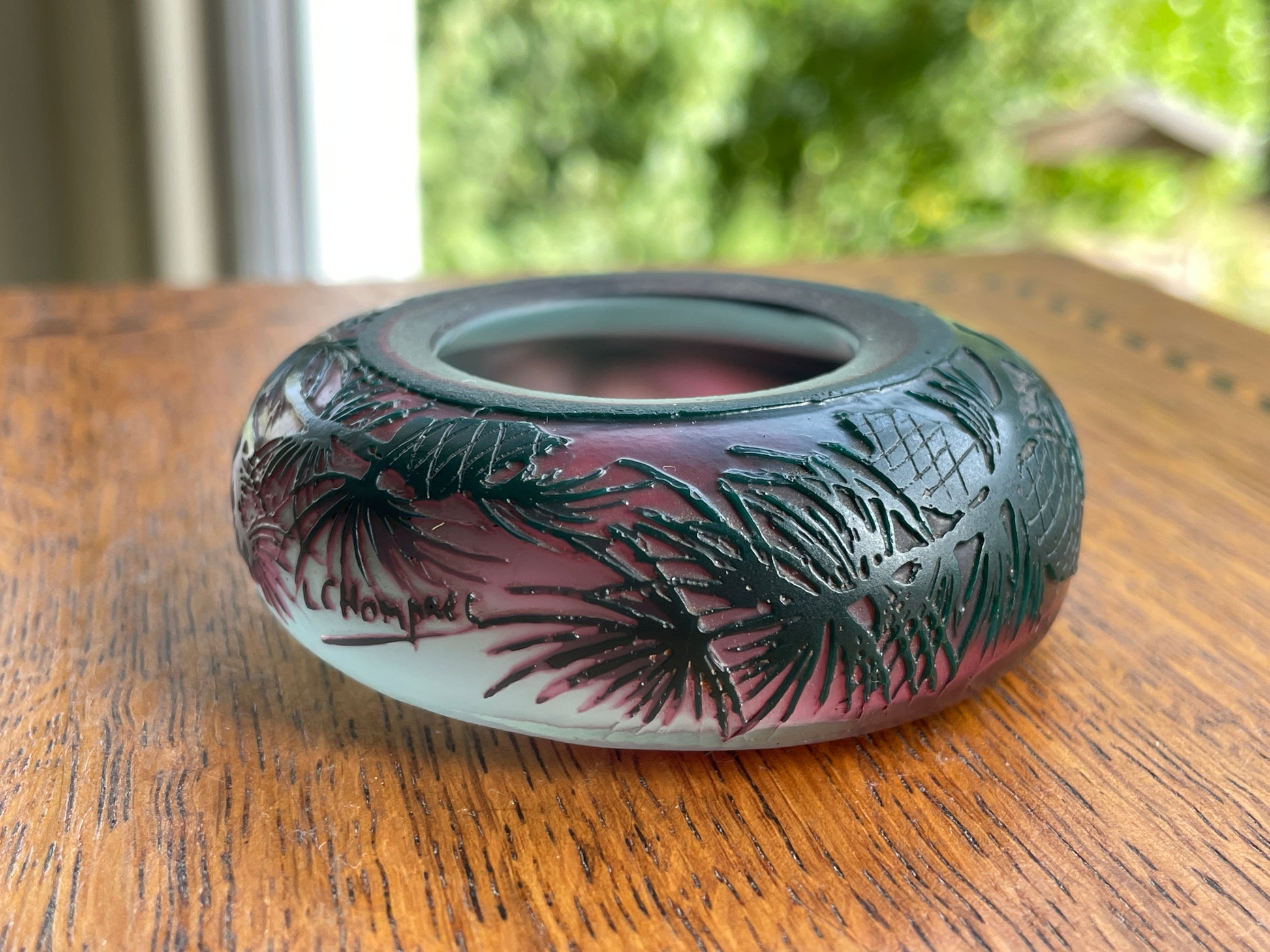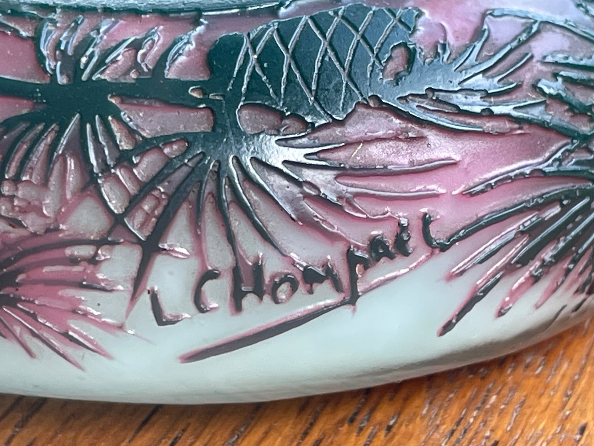 This finely worked piece is formed in layered glass of soft pink, amethyst, and deep forest green, acid-etched with a naturalistic pinecone and branch design. The decoration is finely detailed and bears the etched signature L. Chompret to the side.