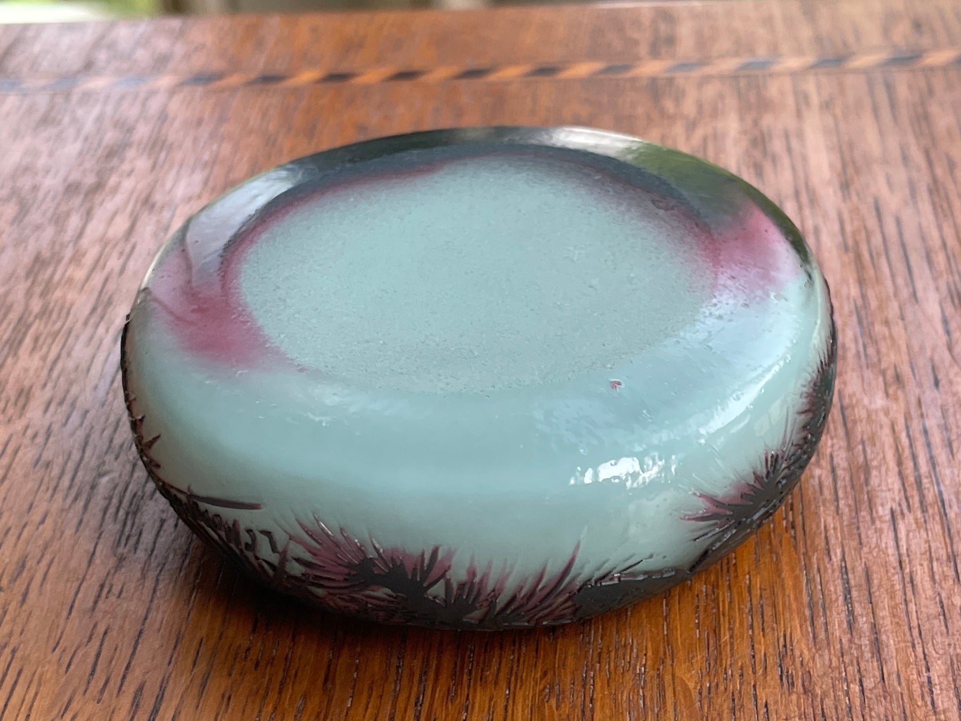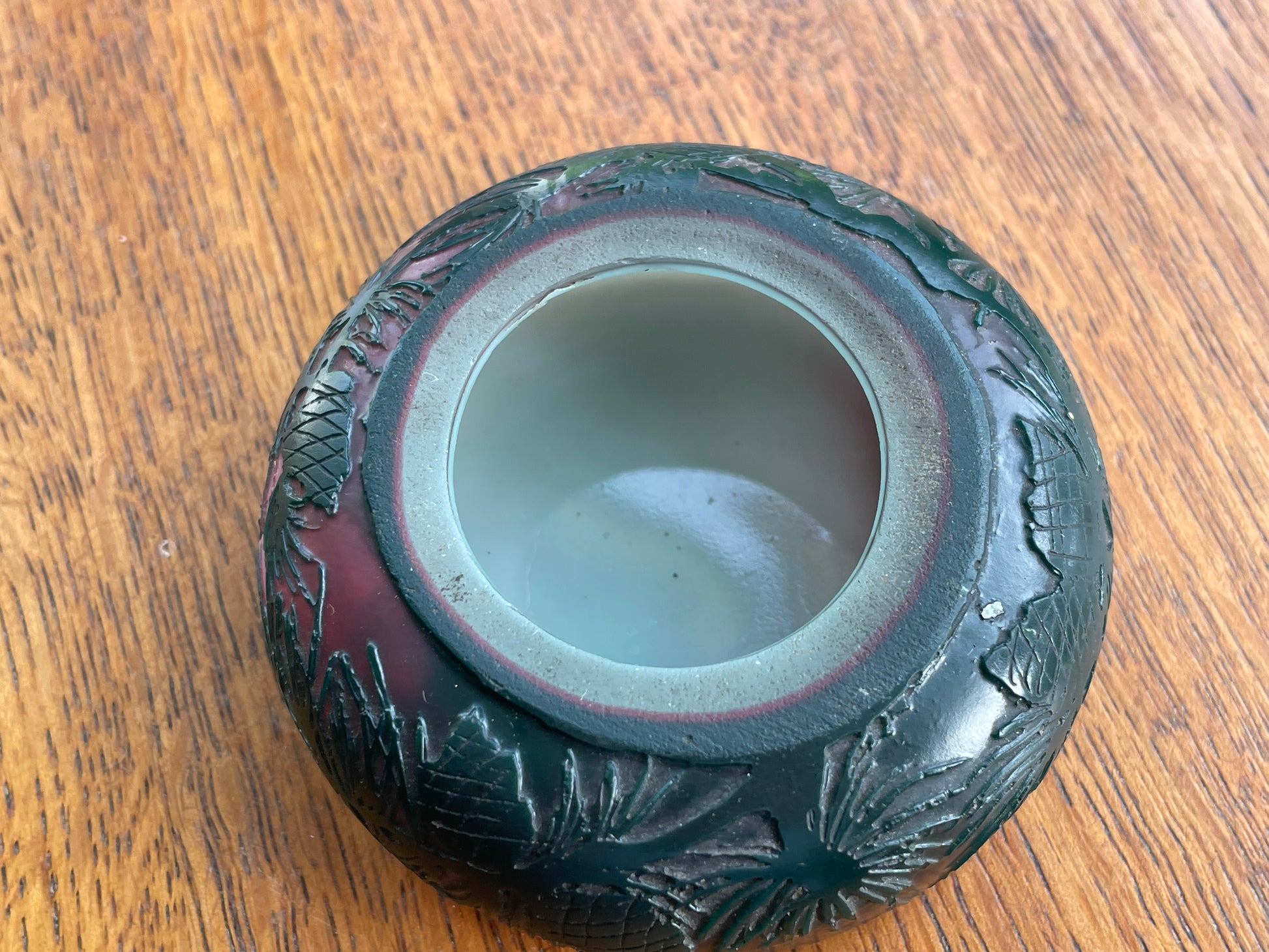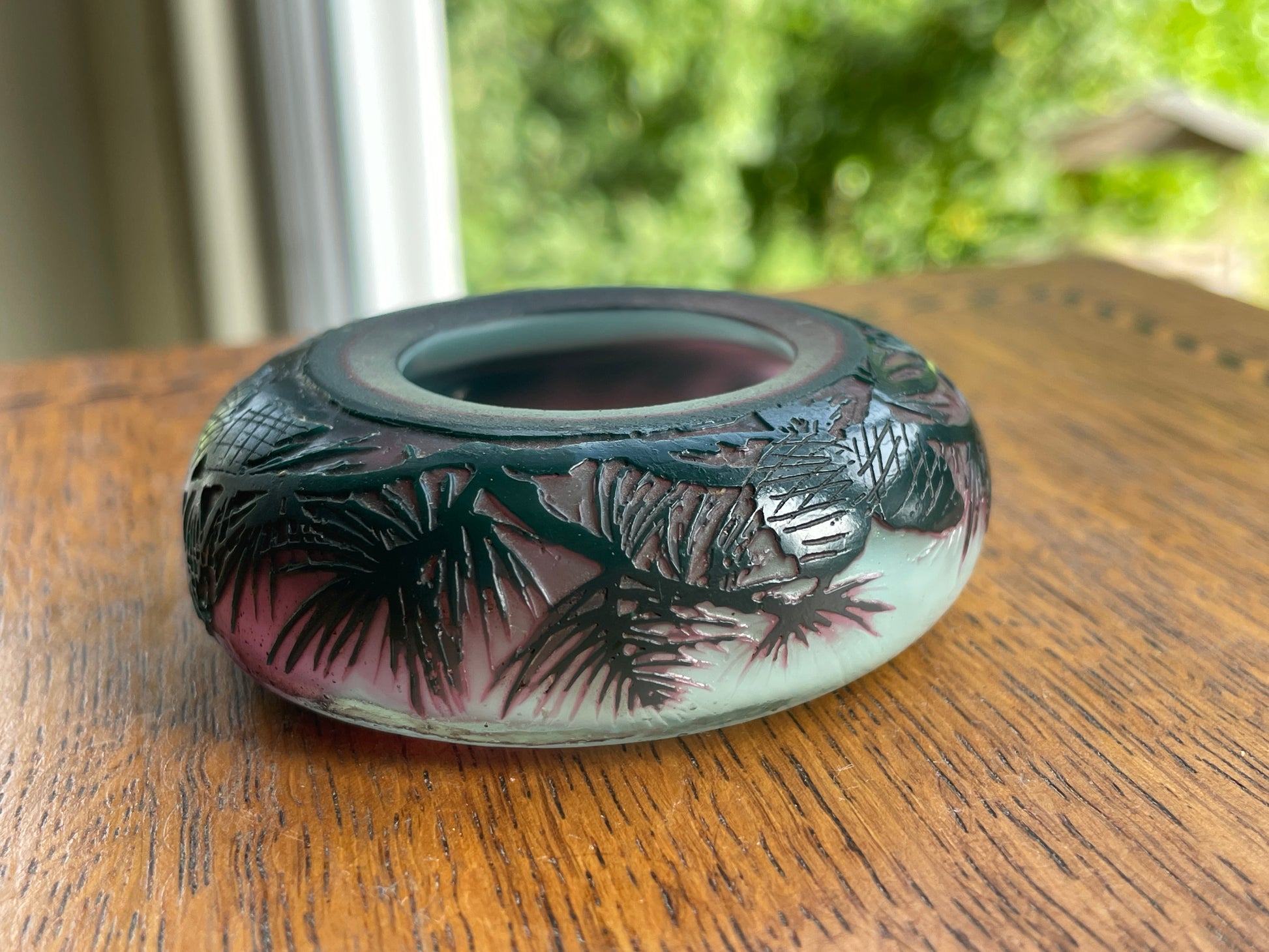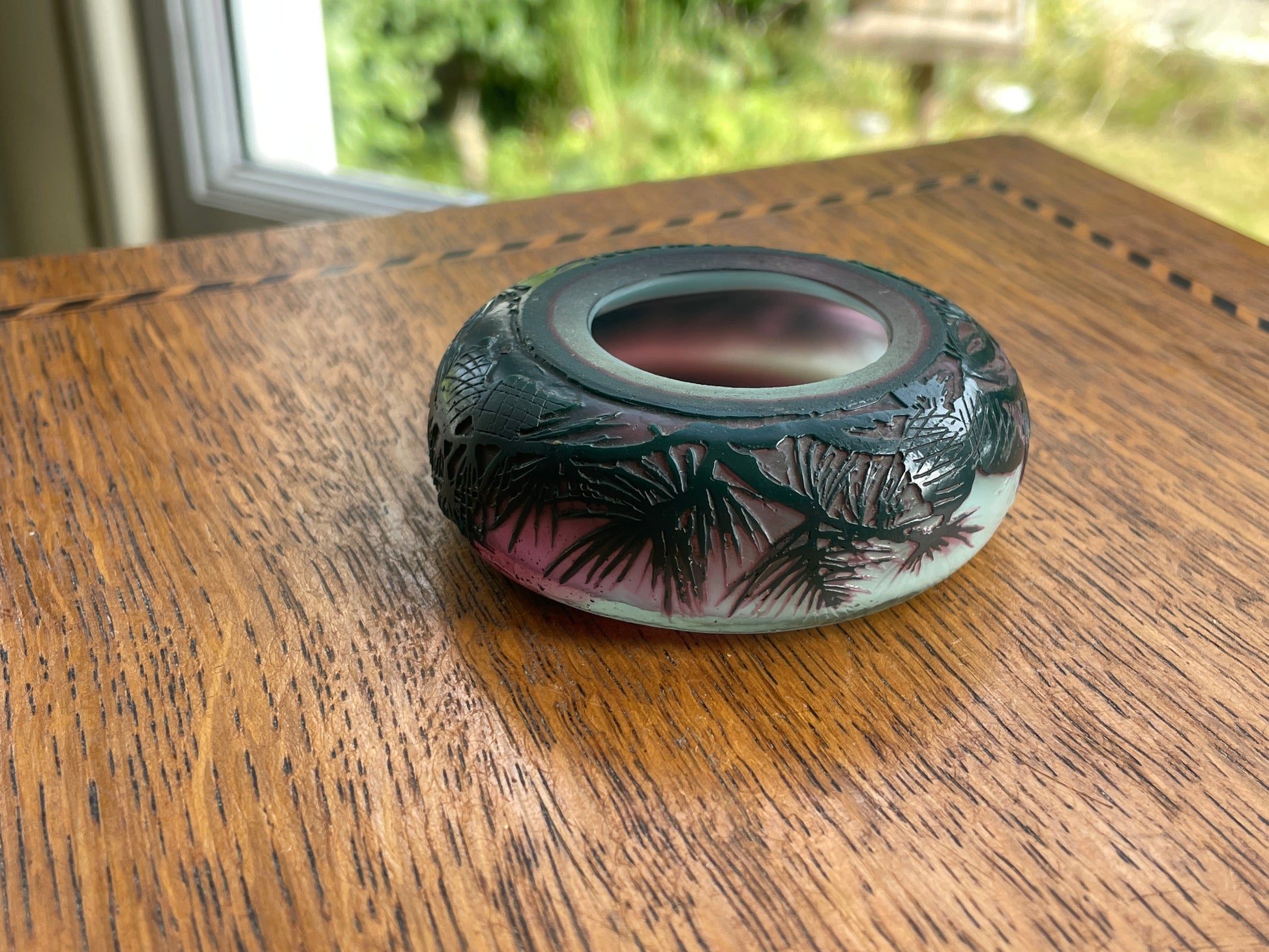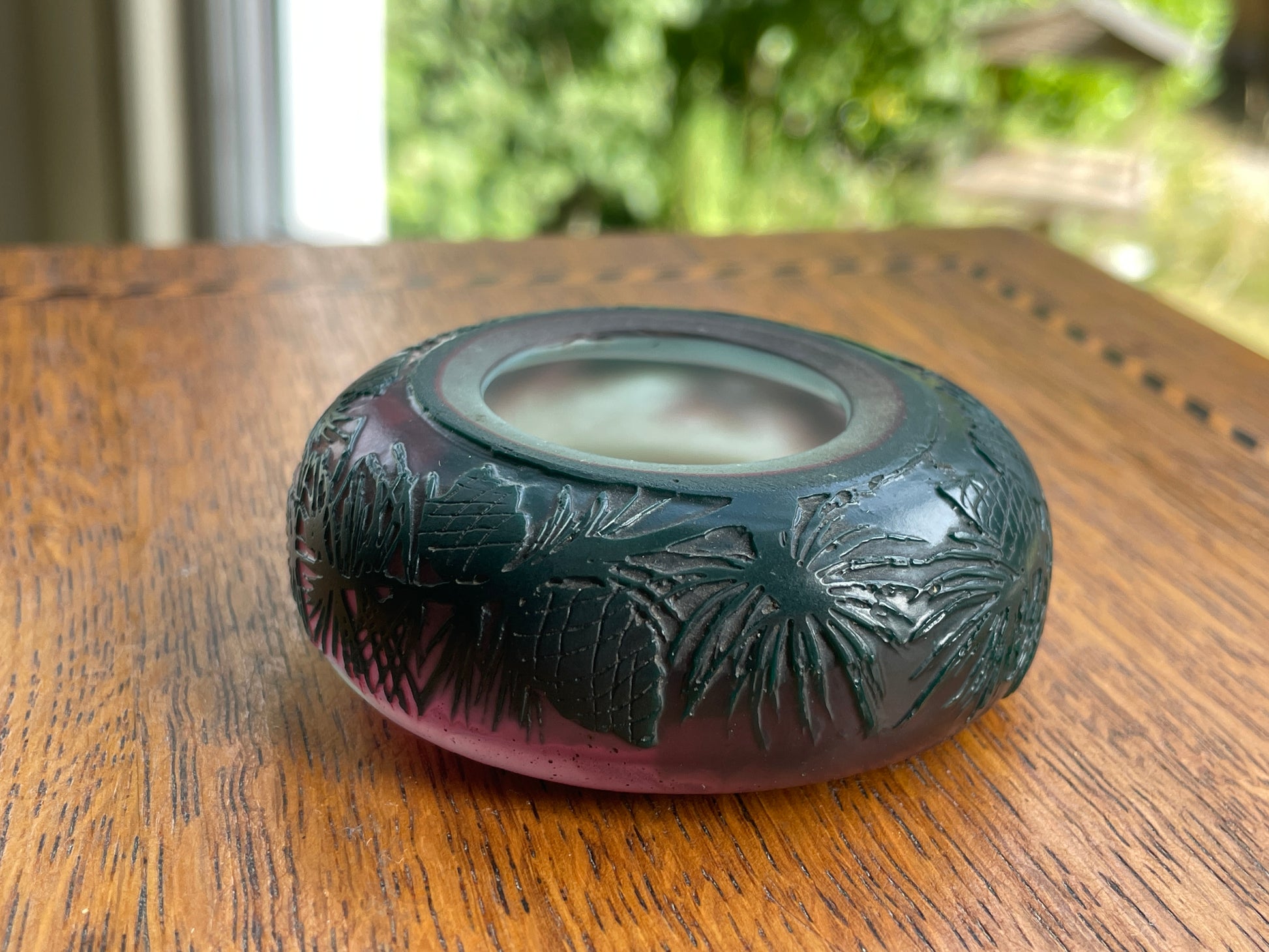 This finely worked piece is formed in layered glass of soft pink, amethyst, and deep forest green, acid-etched with a naturalistic pinecone and branch design. The decoration is finely detailed and bears the etched signature L. Chompret to the side.