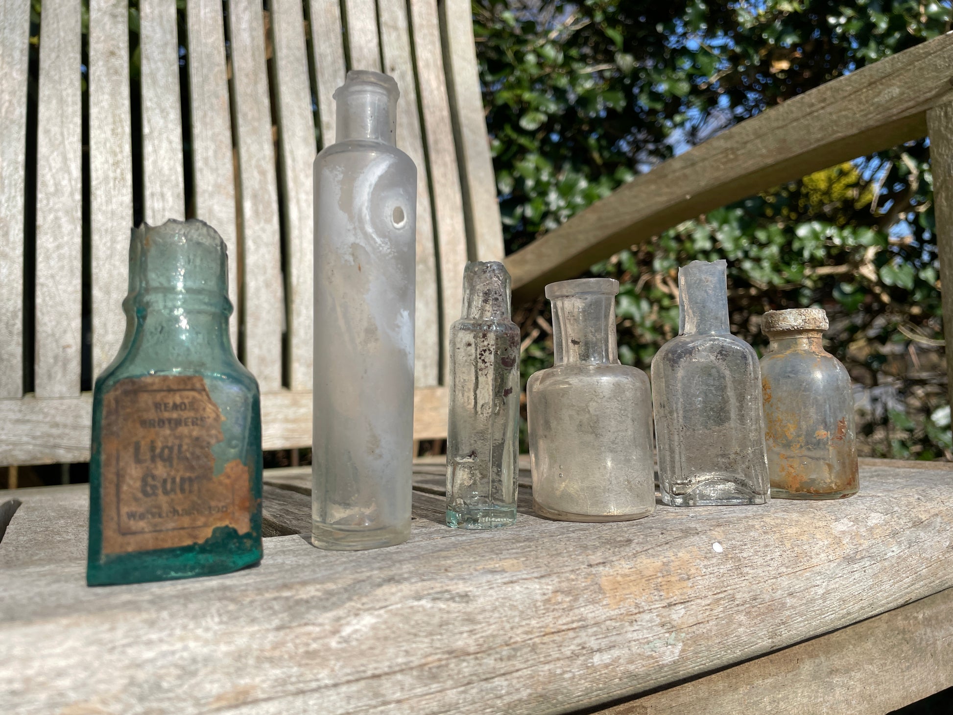 six 19th century glass bottles including Liquid gum Wolverhampton Reade Brothers and American examples