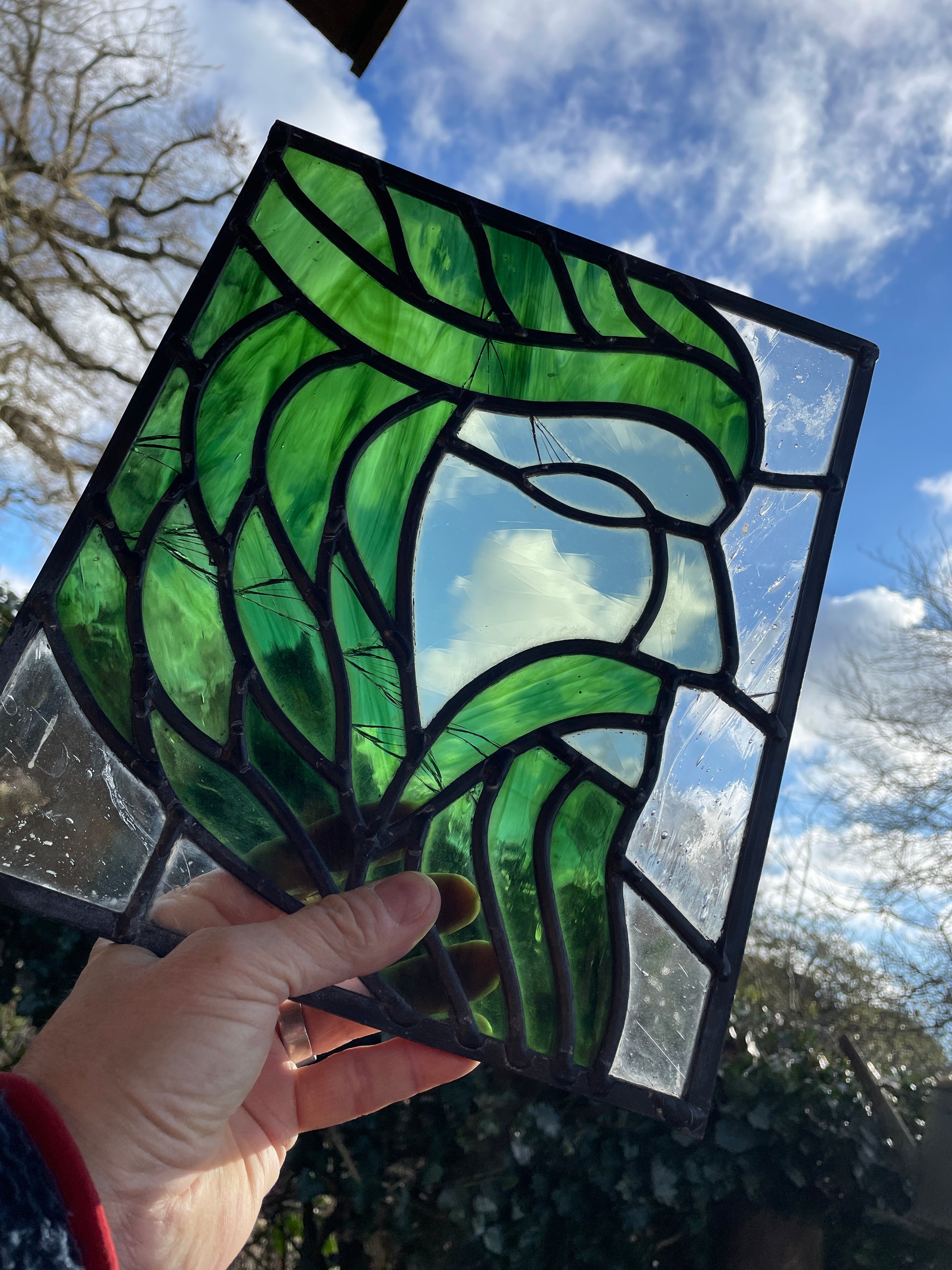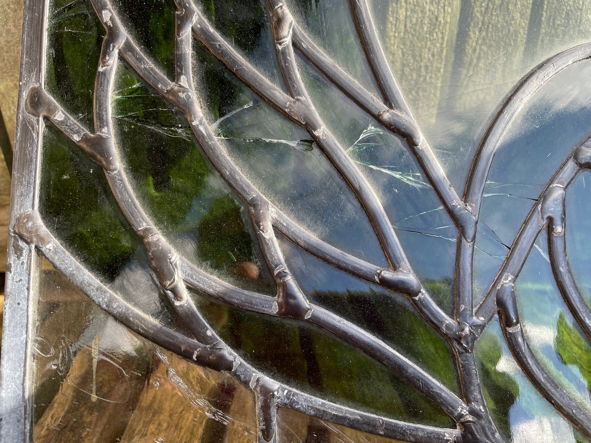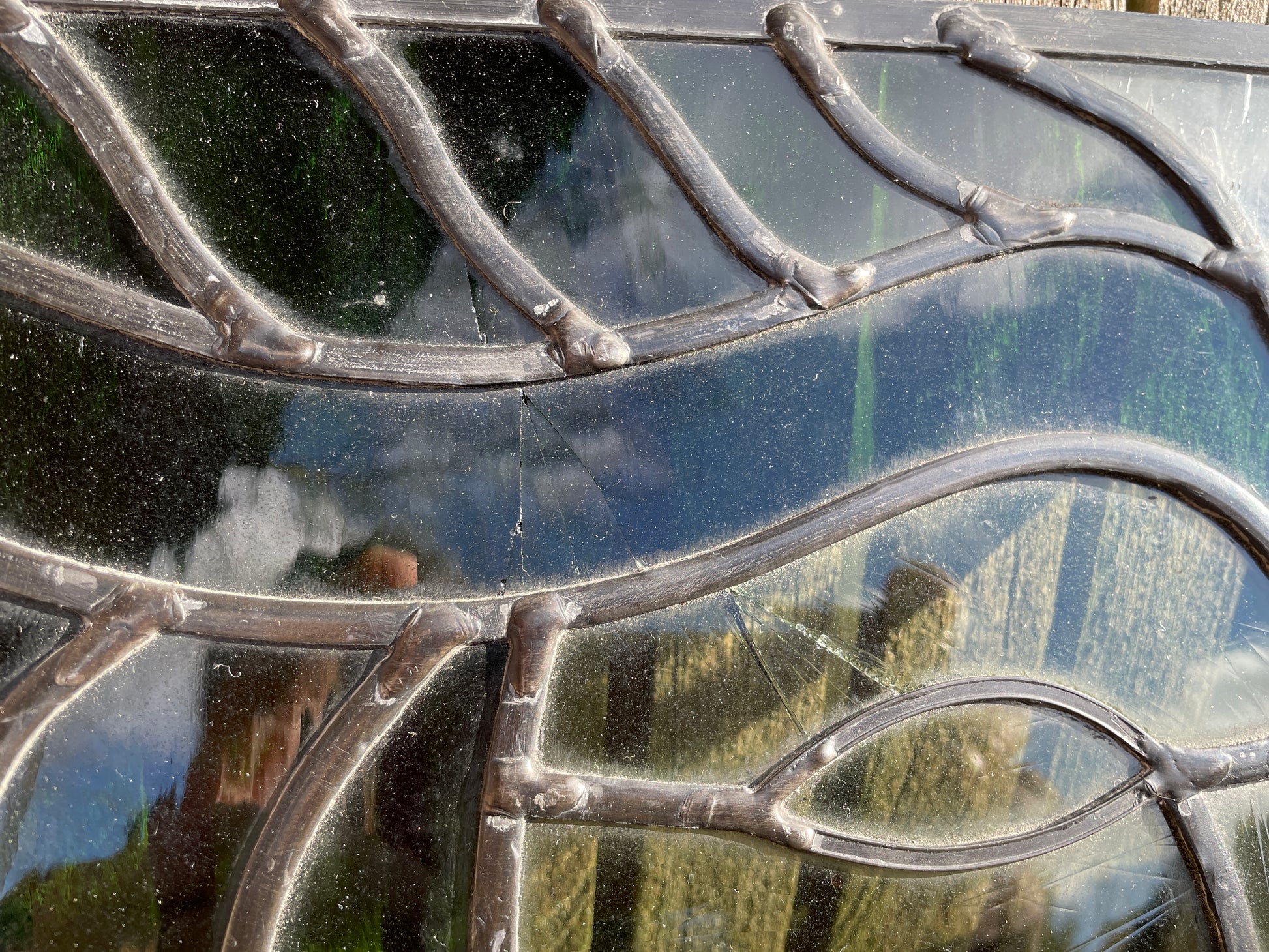This stained glass piece has some broken glass as seen in the images but as some of the glass has natural fissures and veins in it, it's actually not overly obvious