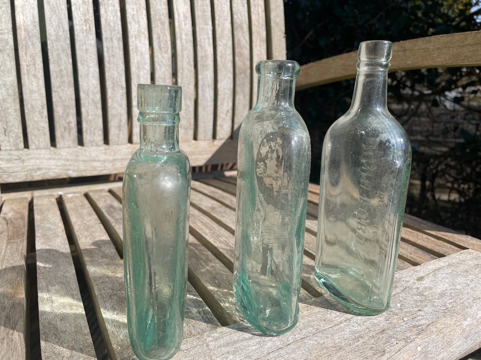 The third bottle is an unmarked 1880's liquor bottle 6860 to base - in good condition