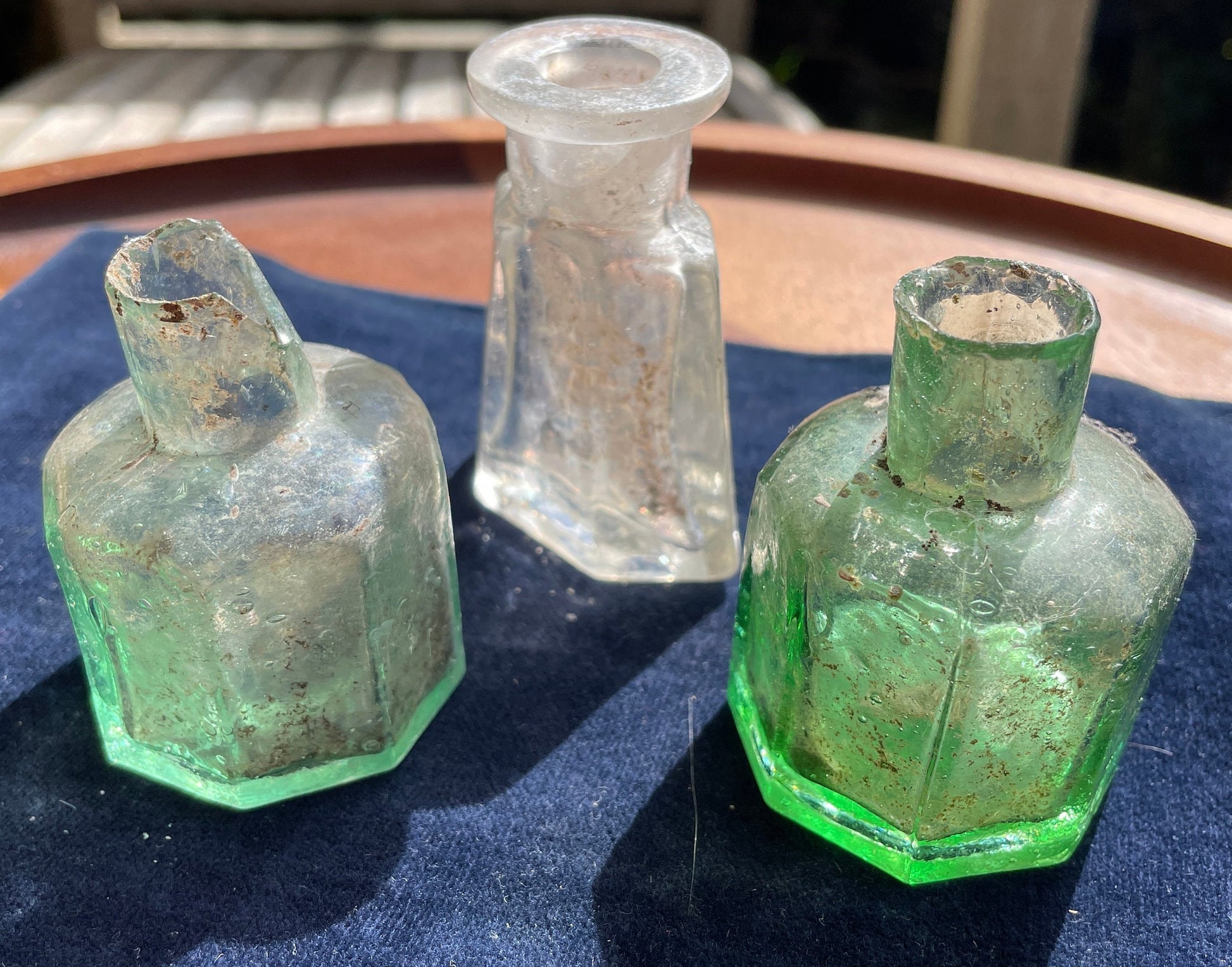 Two green one clear - uncleaned condition as per images - nibbles and break to top of two synonymous with these types of glass bottles