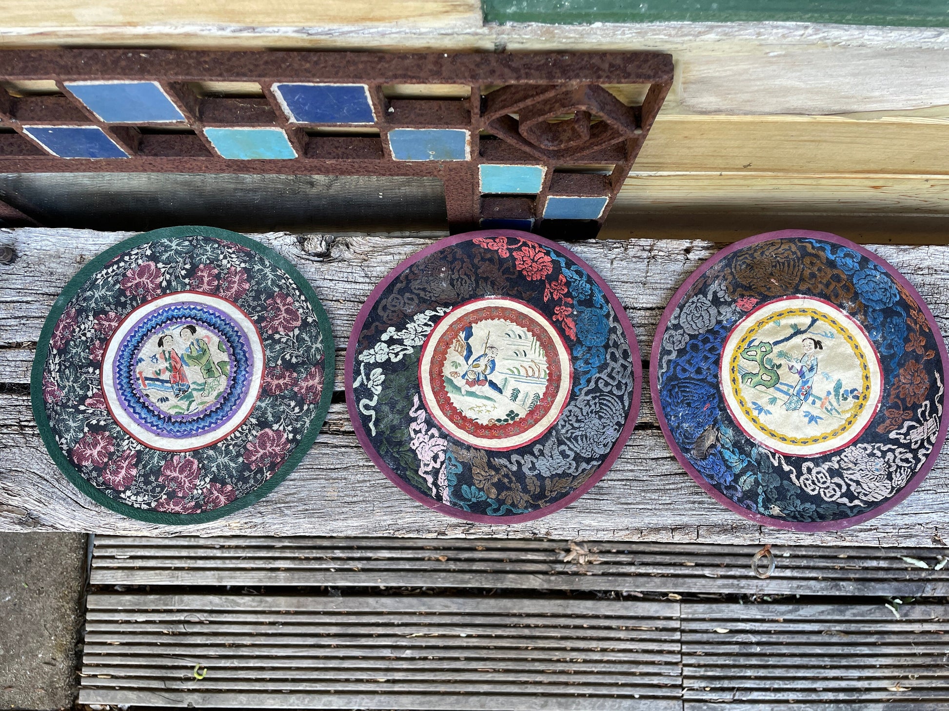 Three Vintage Chinese hand Embroidered Satin Silk Round Mats 21cm diameter