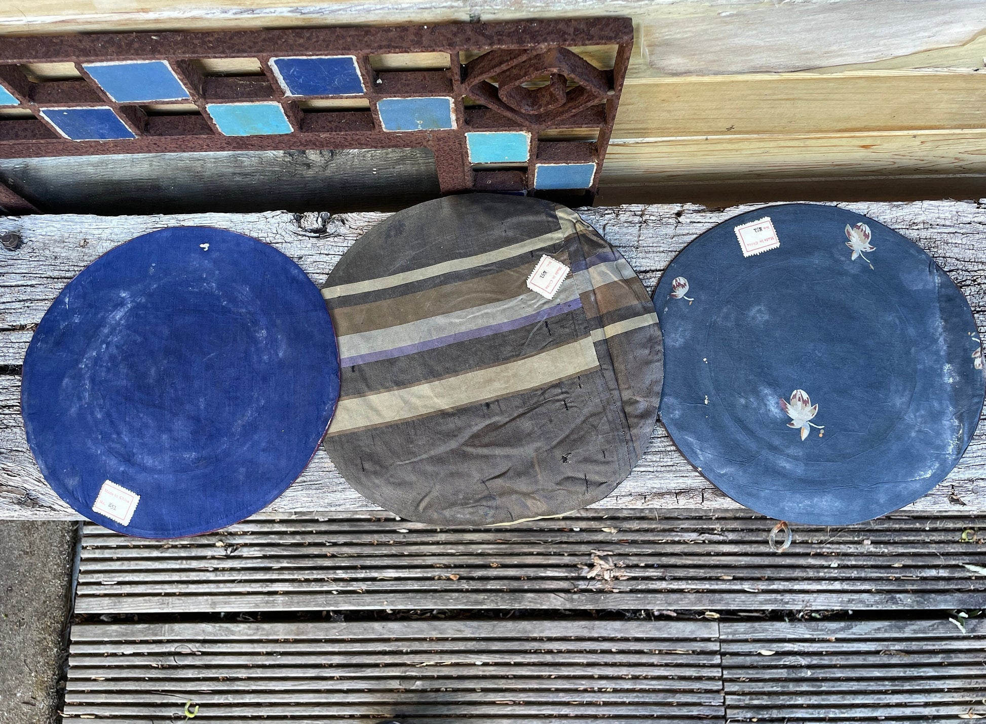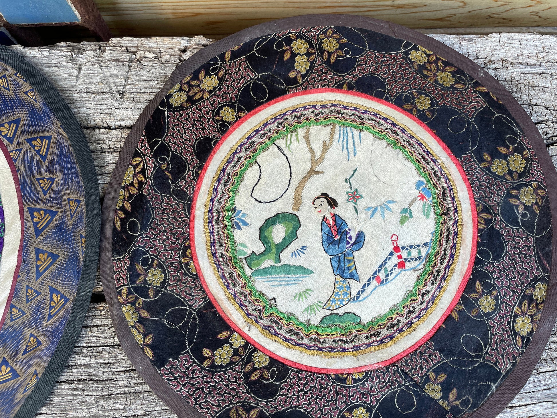 Three Vintage Chinese hand Embroidered Satin Silk Round Mats 23cm diameter