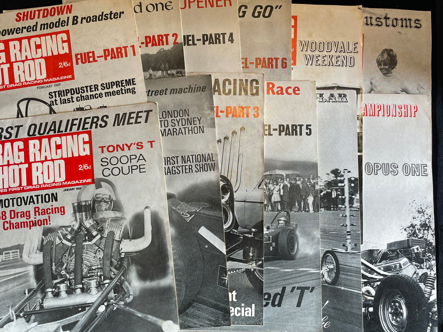 Twelve original vintage Drag Racing and Hot Rod magazines from 1969