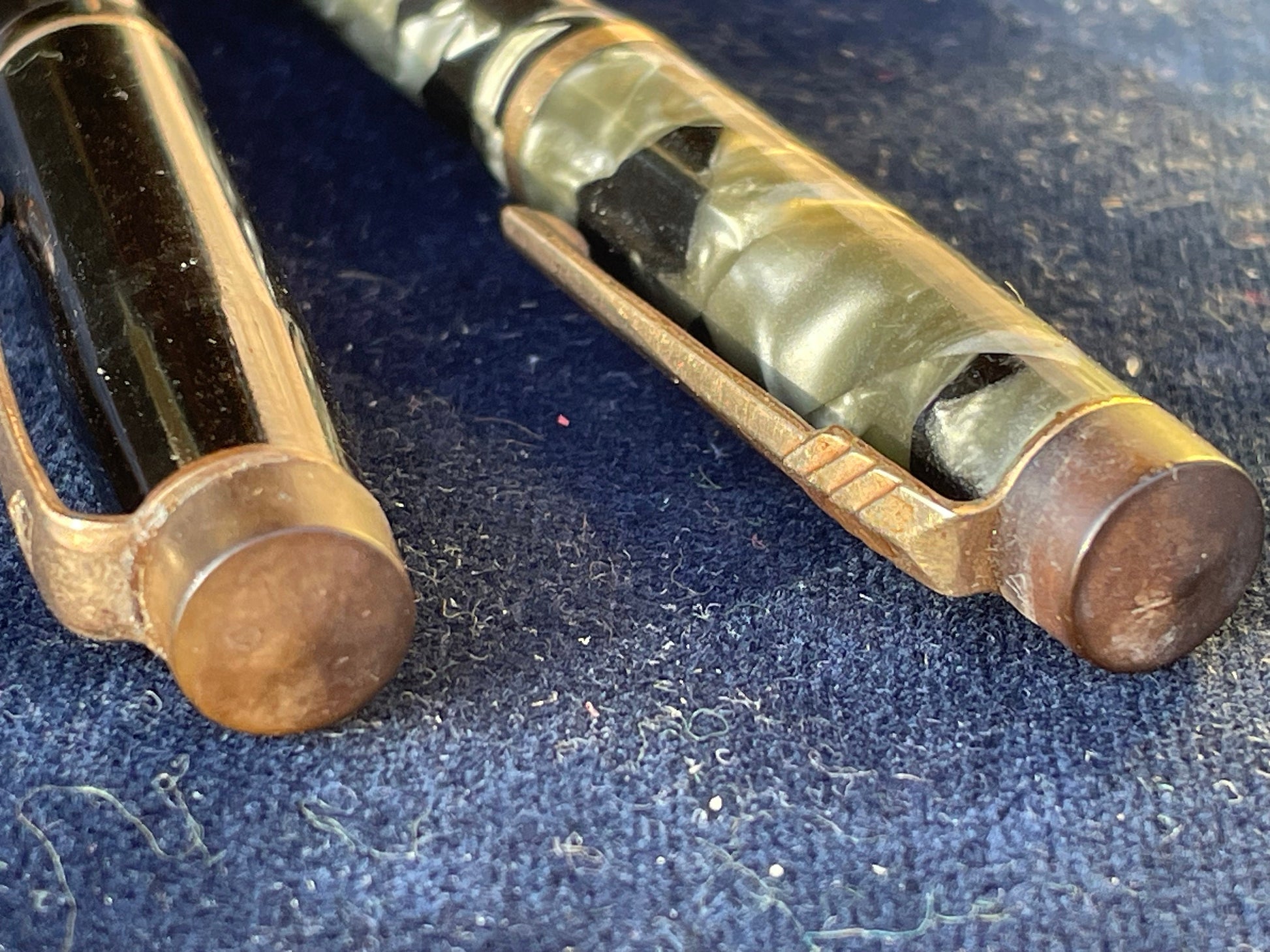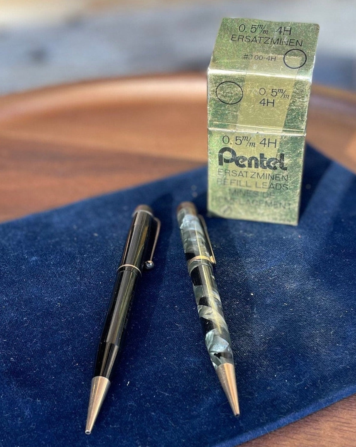 There is one grey and black marbled and one all black with gold trim propelling pencil up for grabs here both 125mm long