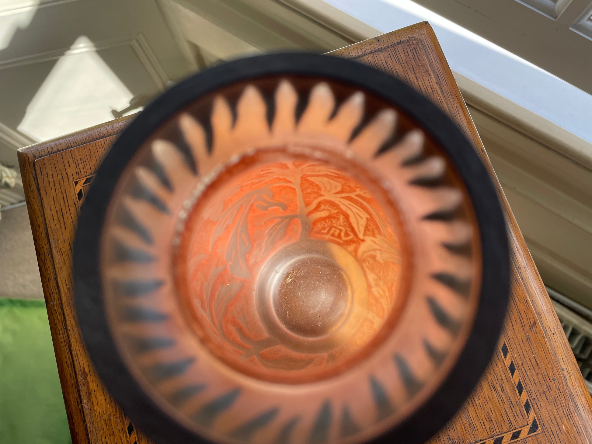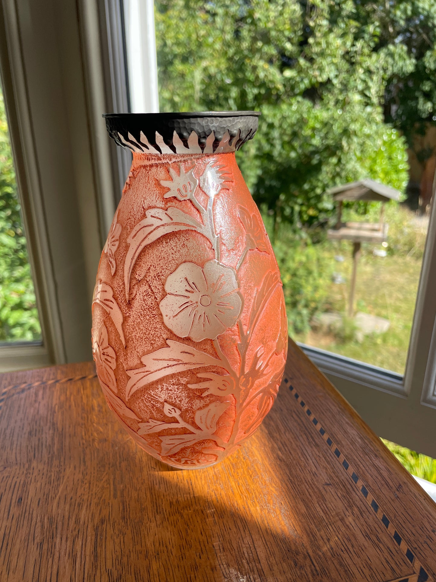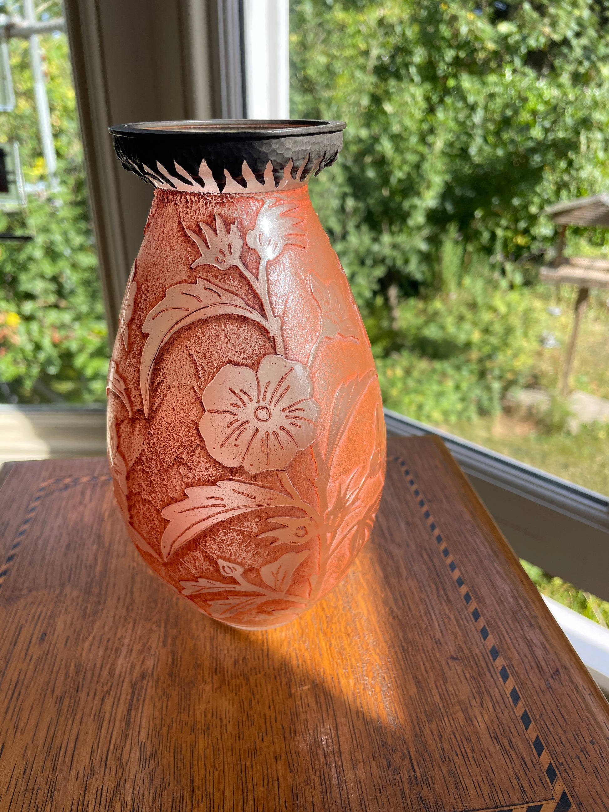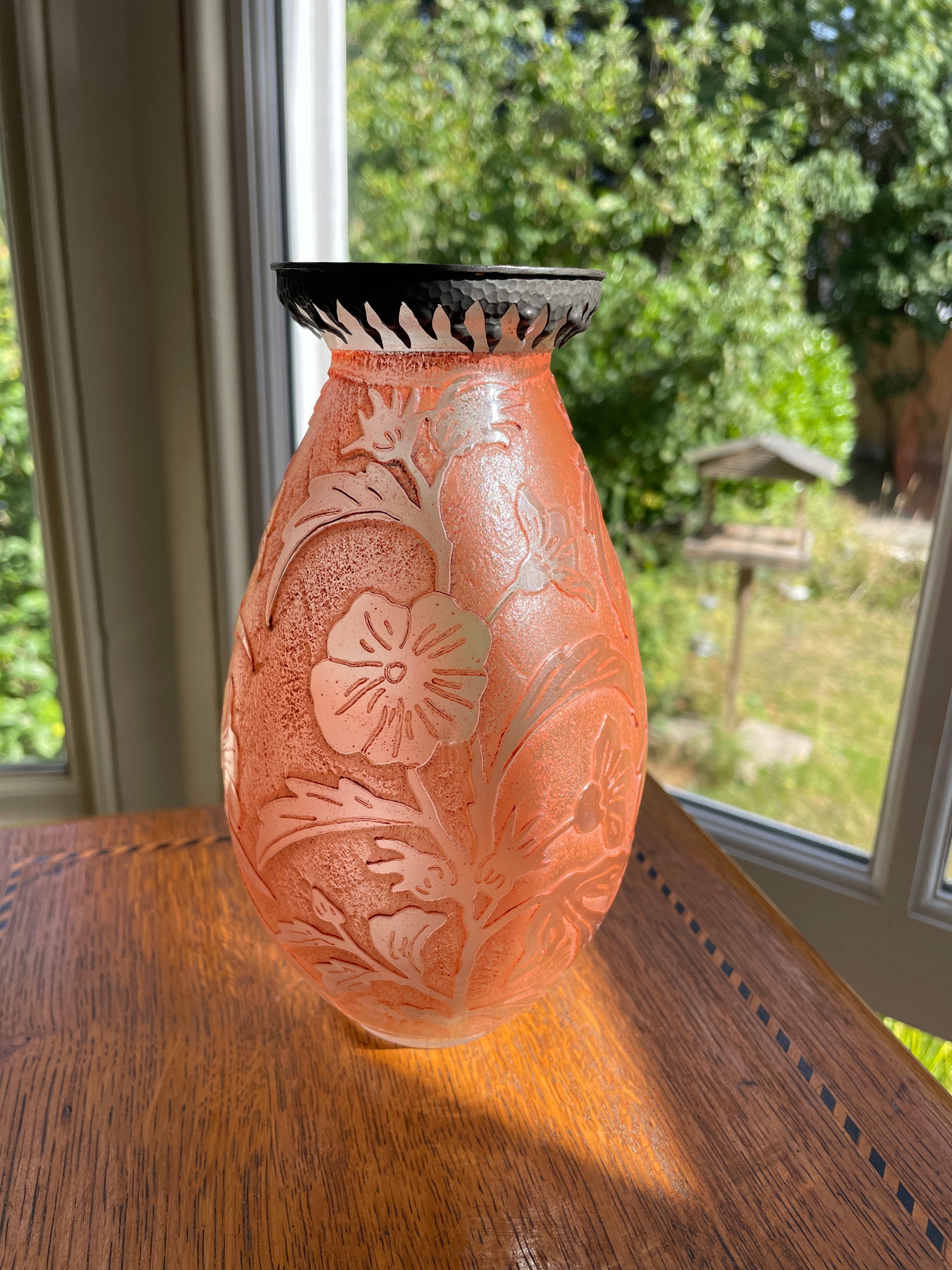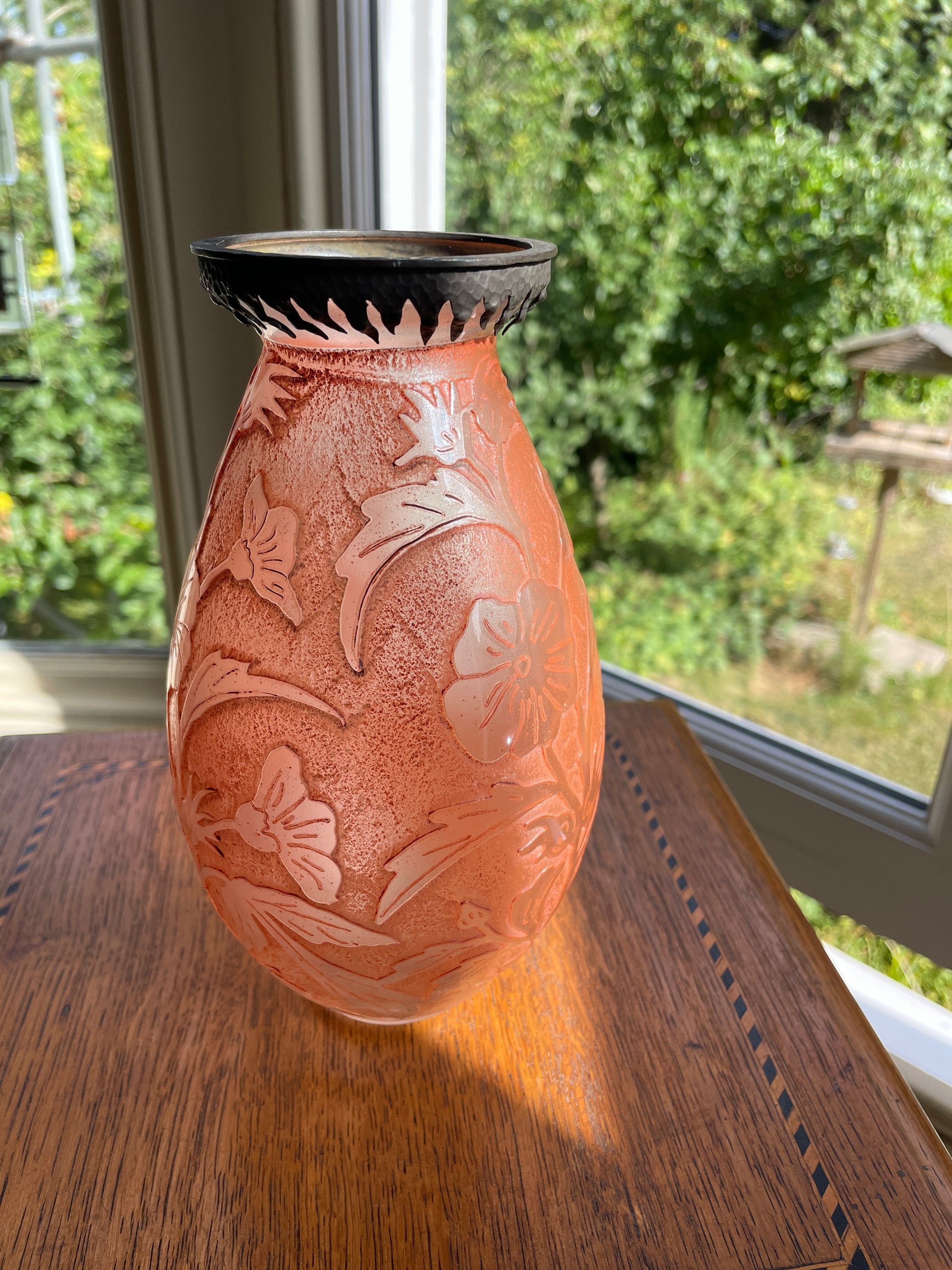 A fine mid-20th century cameo glass vase signed VAL (Verreries d’Art Lorrain), France. This striking piece features a soft frosted orange ground with acid-etched floral decoration, giving depth and contrast to the design.