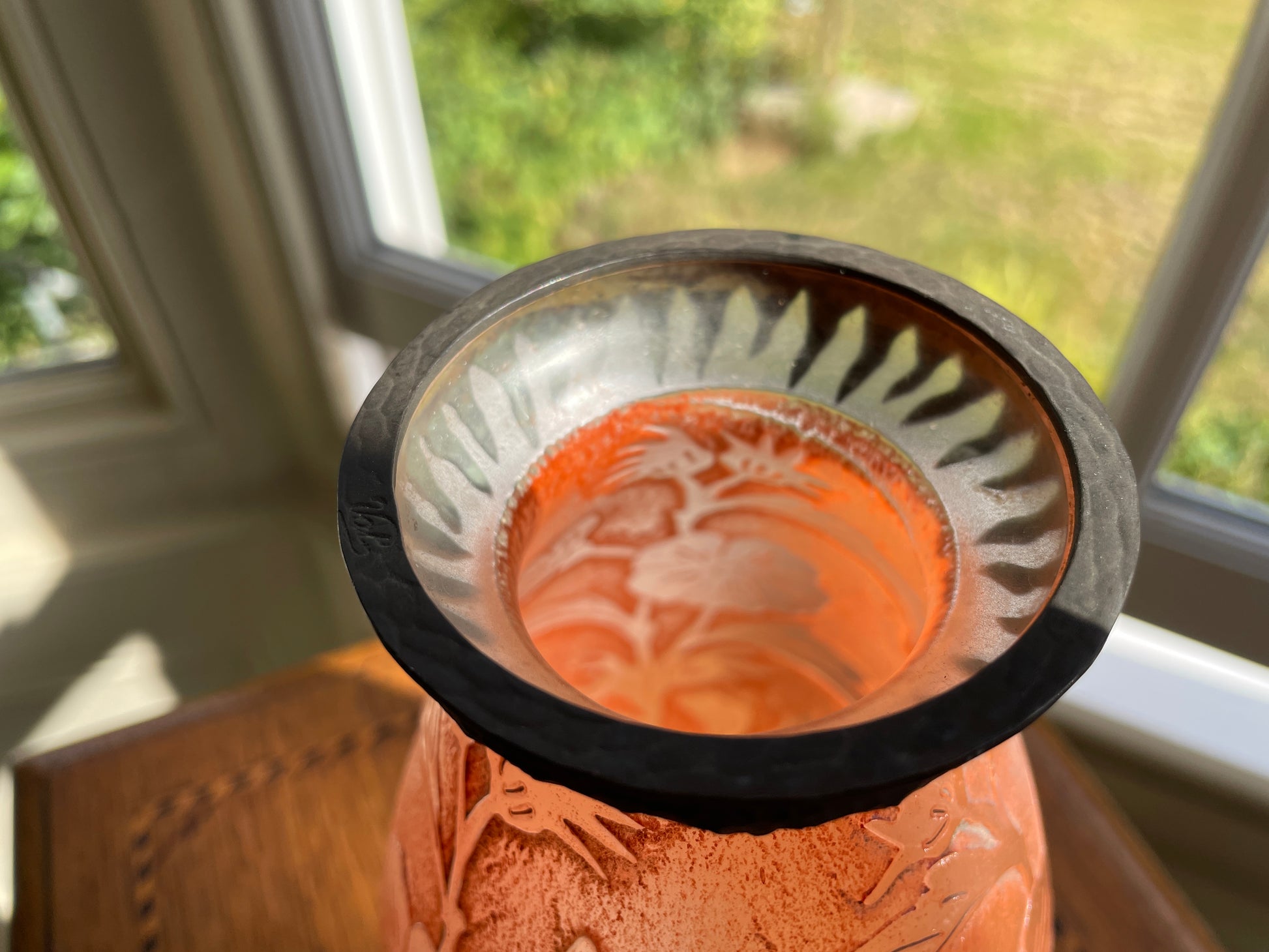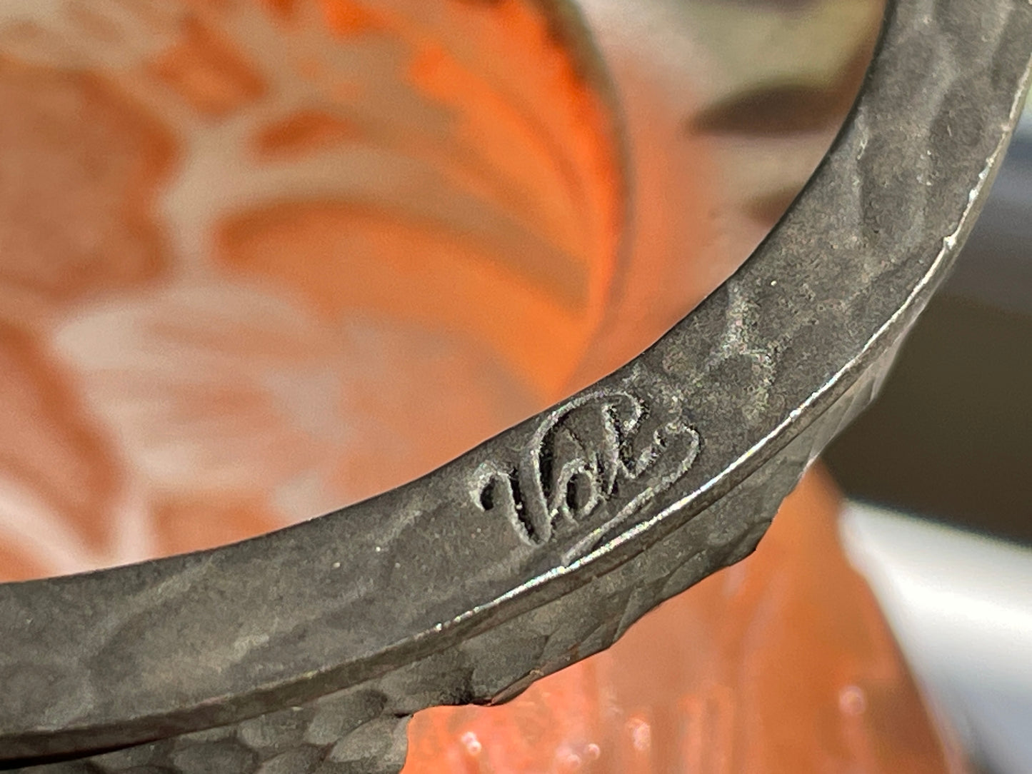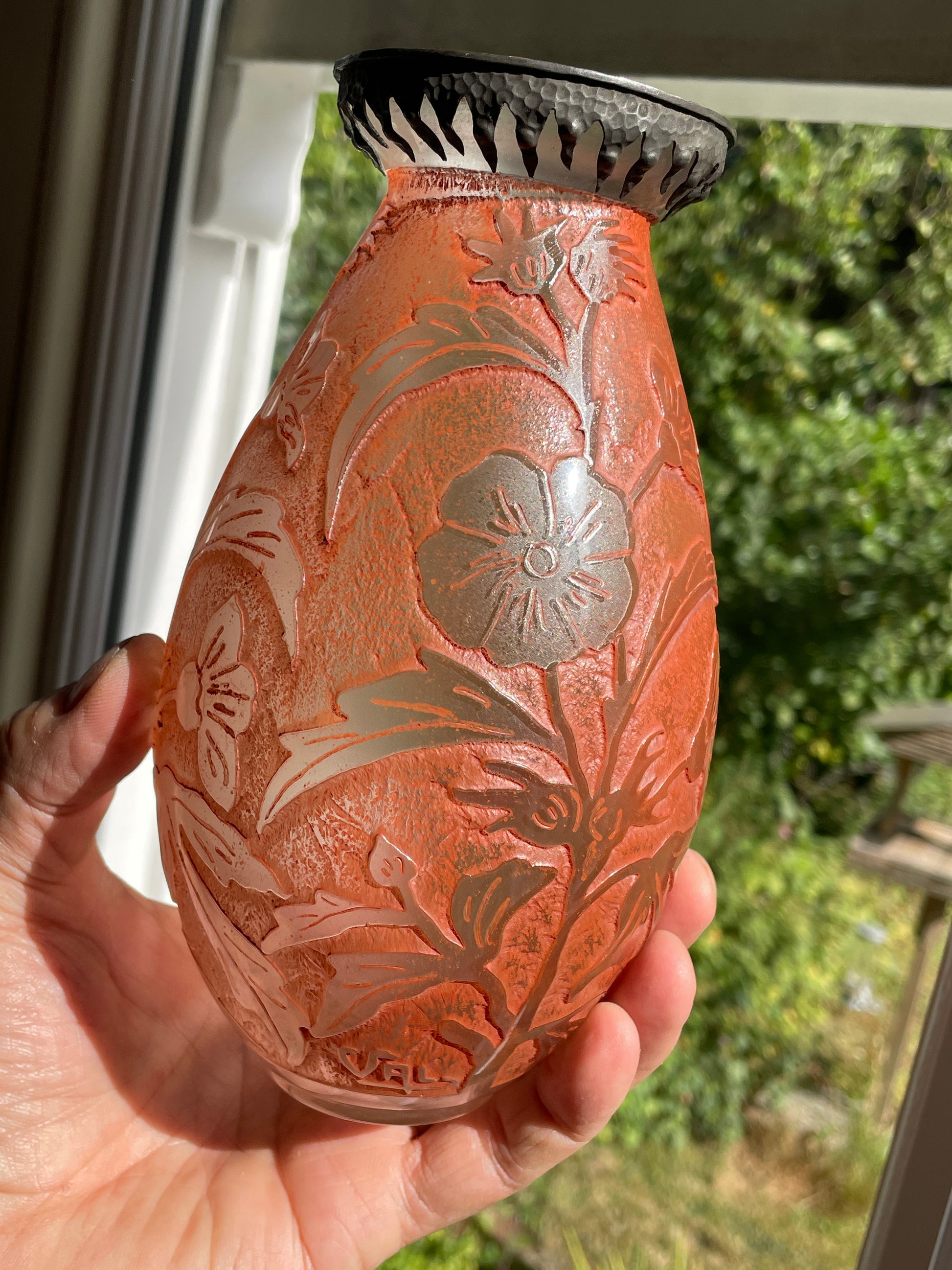 Adding to its uniqueness, the vase retains its original hammered metal collar, also signed Val, an uncommon feature that enhances both its decorative appeal and collector value.