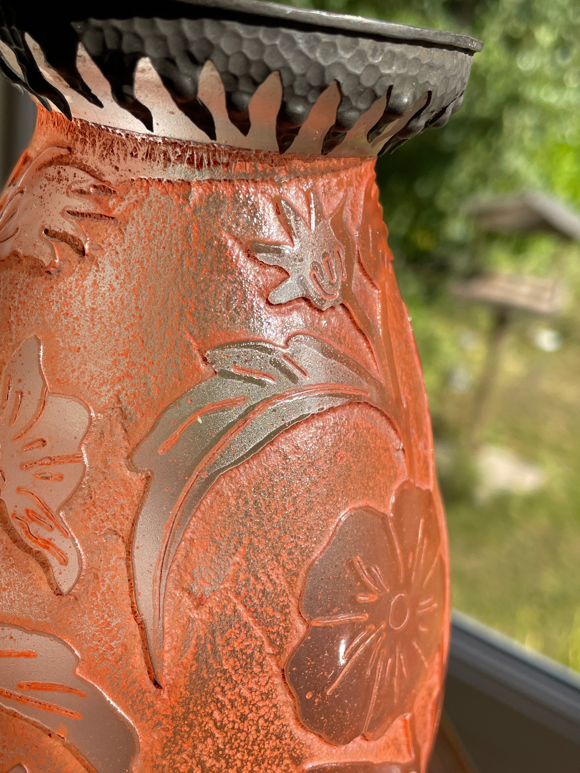 Verreries d’Art Lorrain produced these vases in the 1950s–1970s, following in the tradition of Émile Gallé and the Nancy School, whose Art Nouveau cameo glass pieces inspired this revival. The combination of bold colour, textured surface, and metal-mounted rim makes this a standout decorative object from the period.