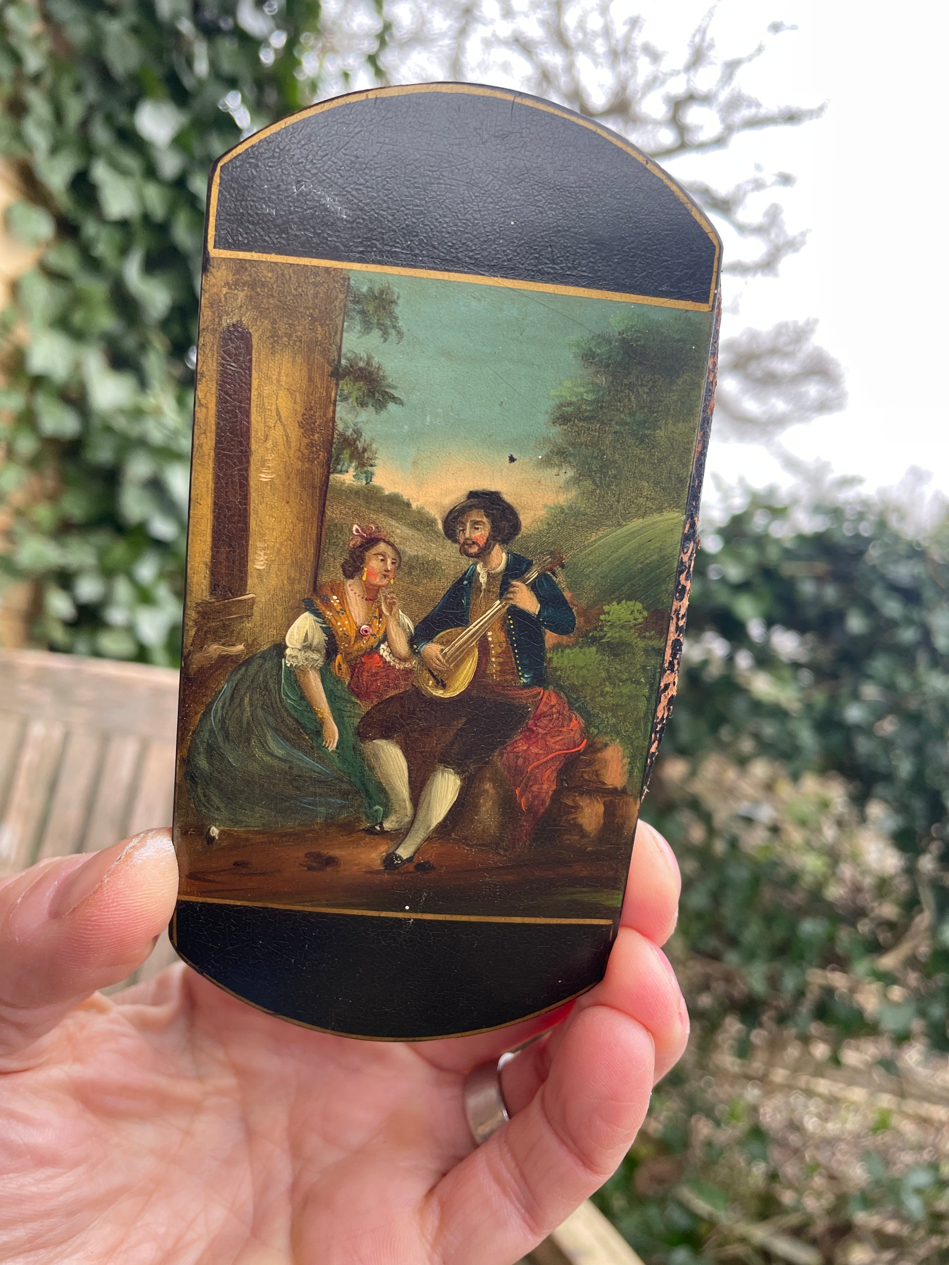This is a wonderful piece of everyday Victoriana - they were so flamboyant; taking the time and effort to decorate something that could be construed as mundane with such a lovely romantic painting