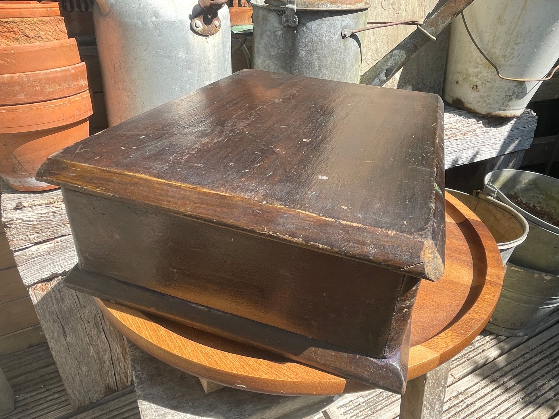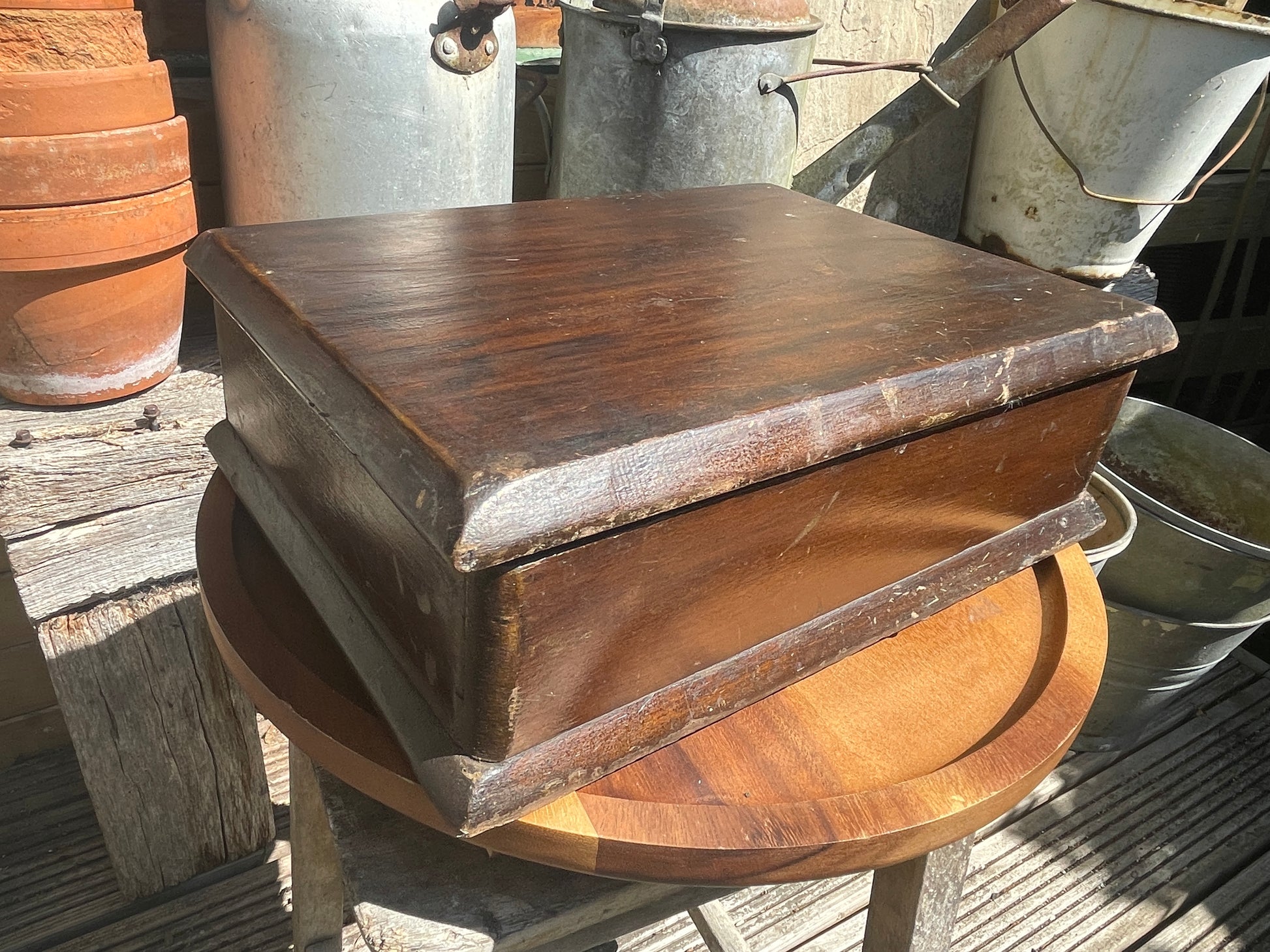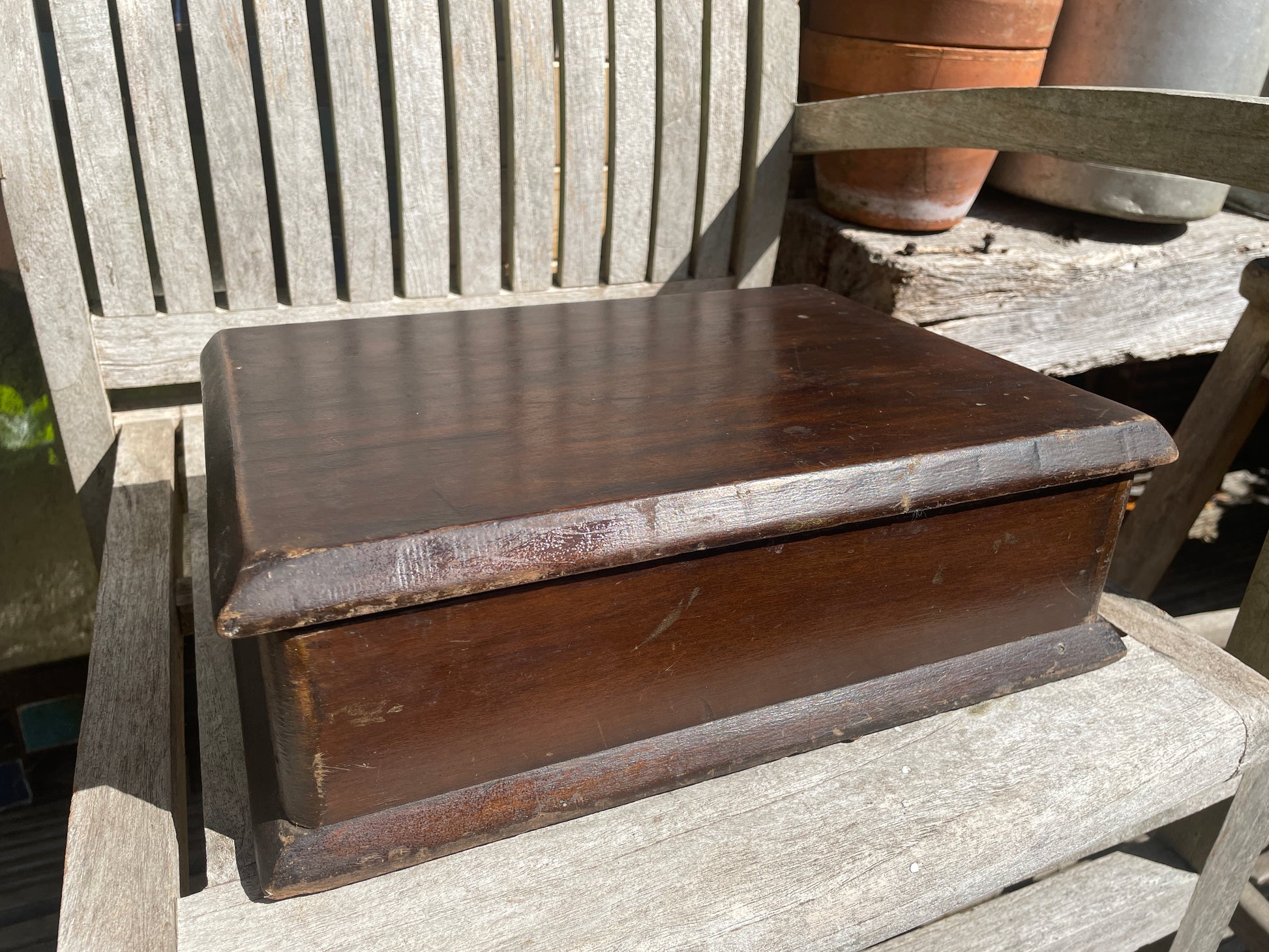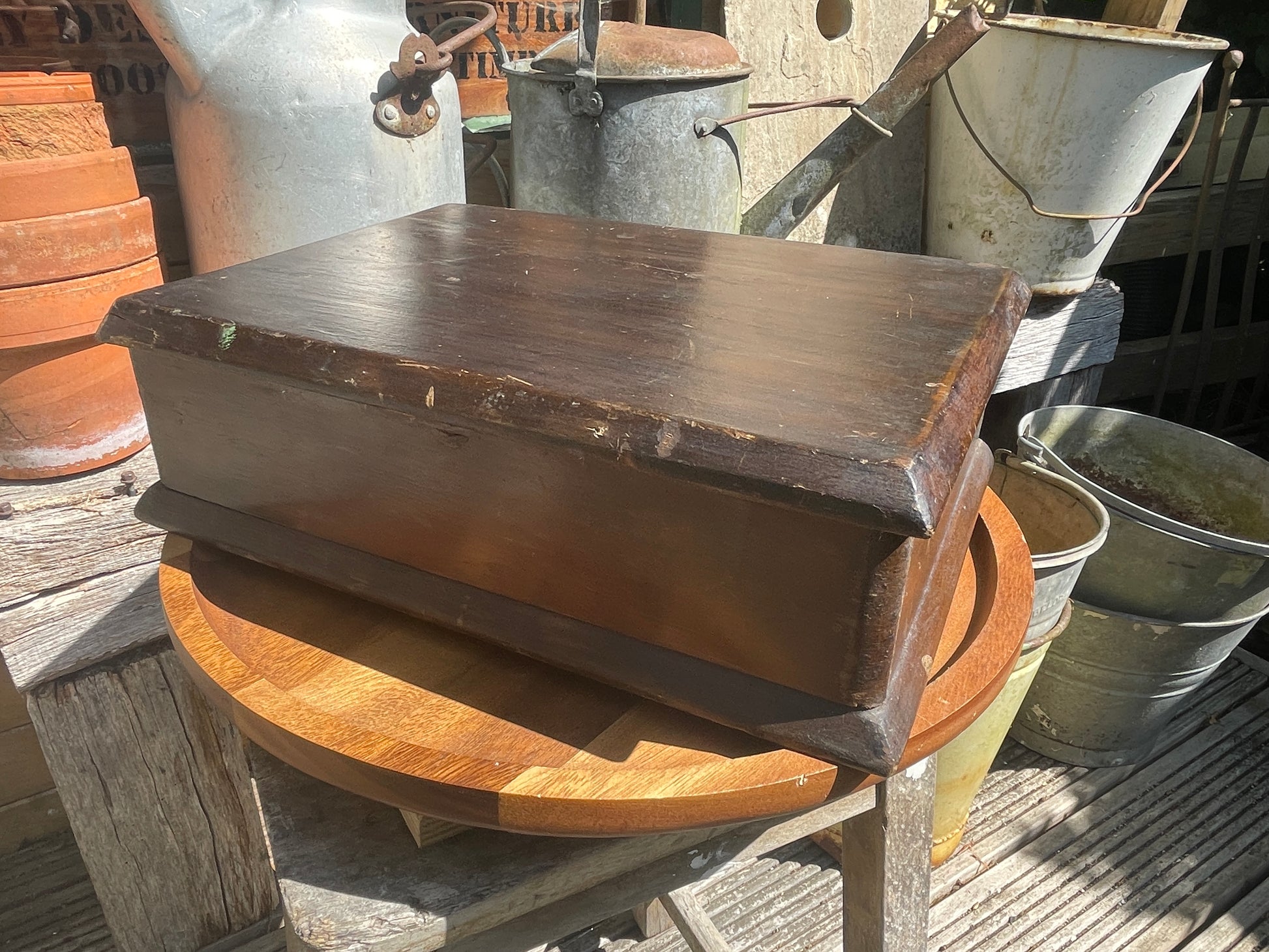 The solid wooden box features a hinged lid and tiered inner compartments that keep the bottles neatly organised. The wood has a rich dark finish and displays age-appropriate wear and patina, adding to its authentic vintage charm.