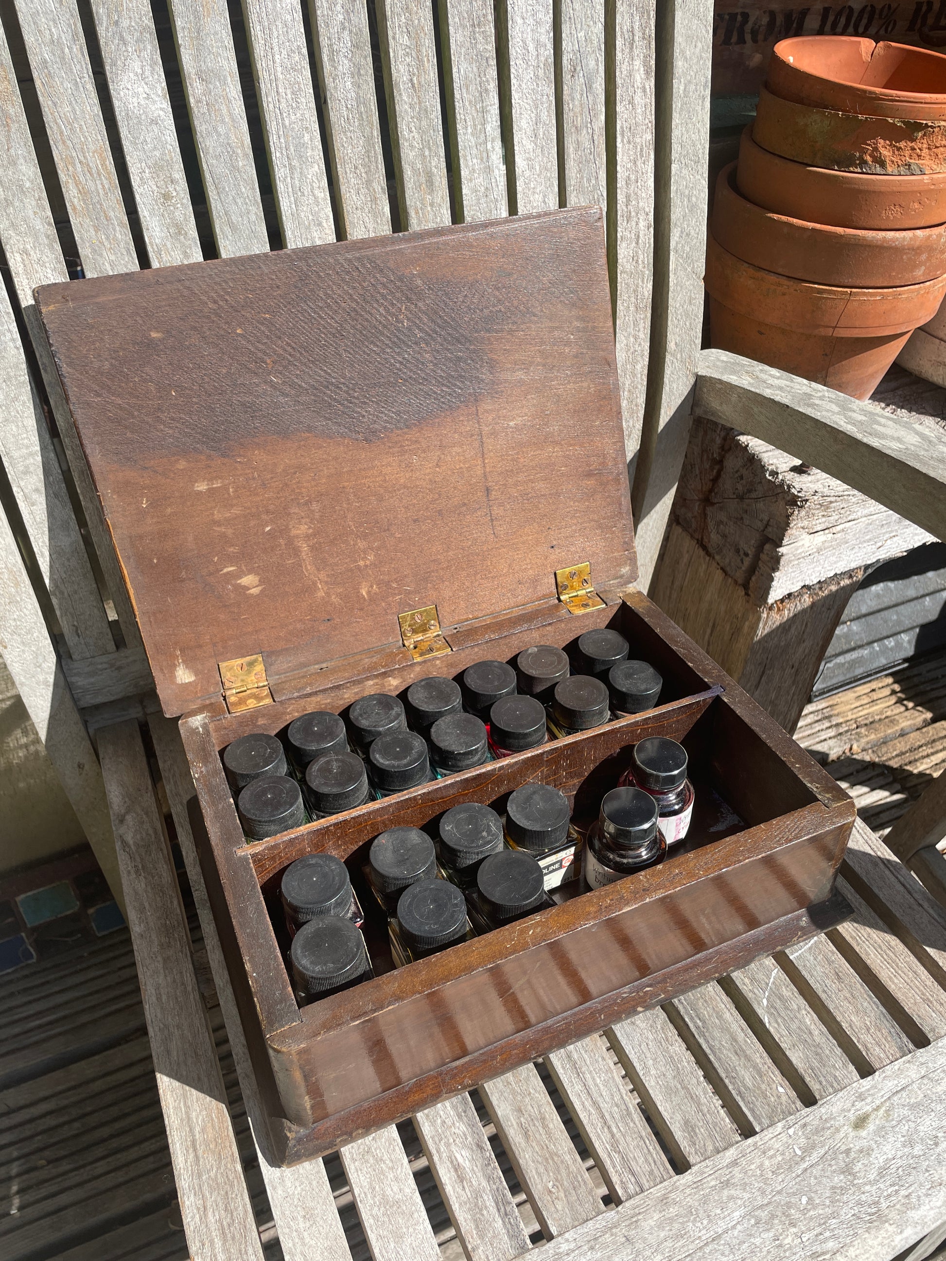 A charming and practical vintage artist’s paint box, complete with a full set of Talens Ecoline watercolour inks housed in a handcrafted wooden case.