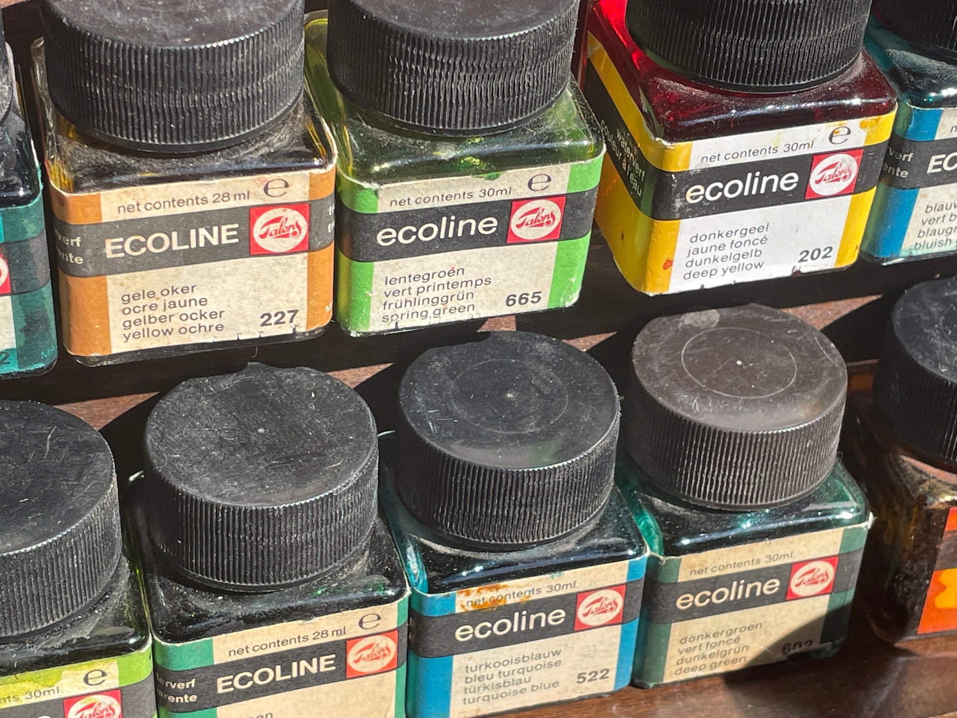 • Approx. 25 bottles of Talens Ecoline watercolour ink (assorted colours)