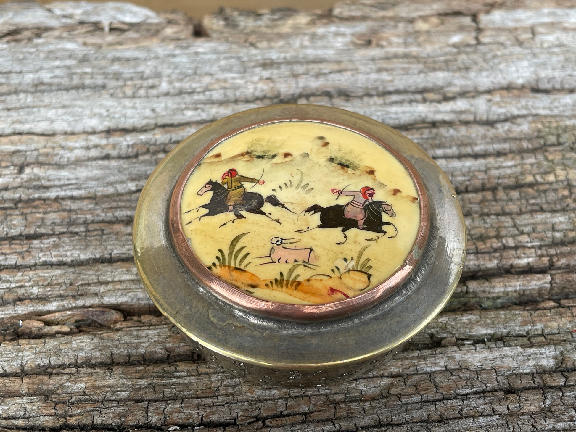 Vintage brass and ceramic powder box, pill box with Persian hunter riders chasing their game, hand painted