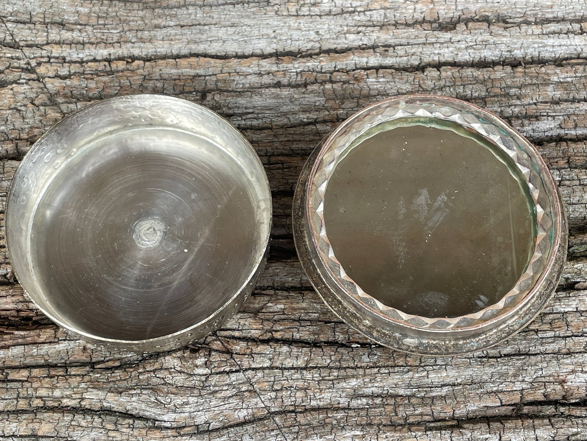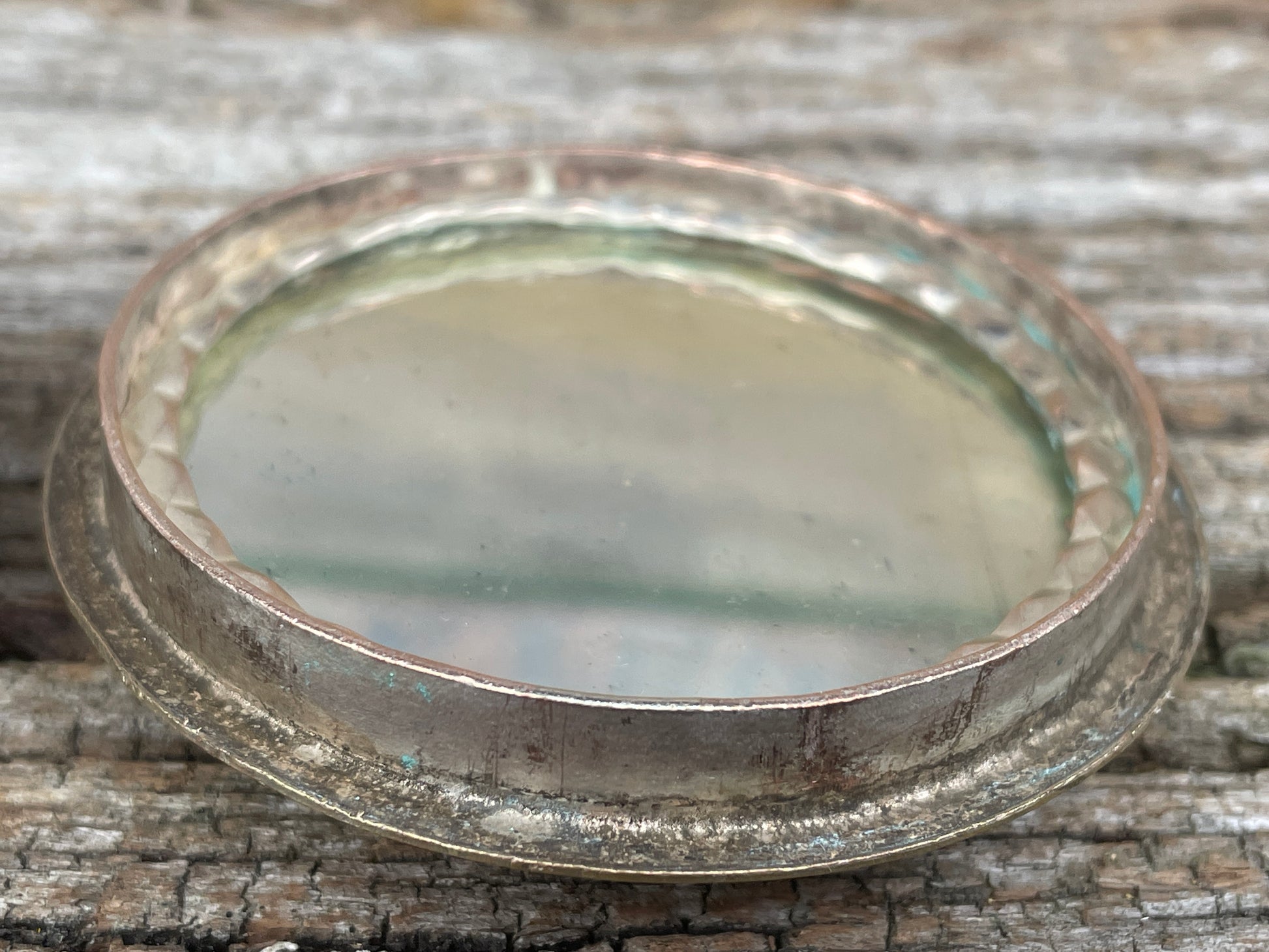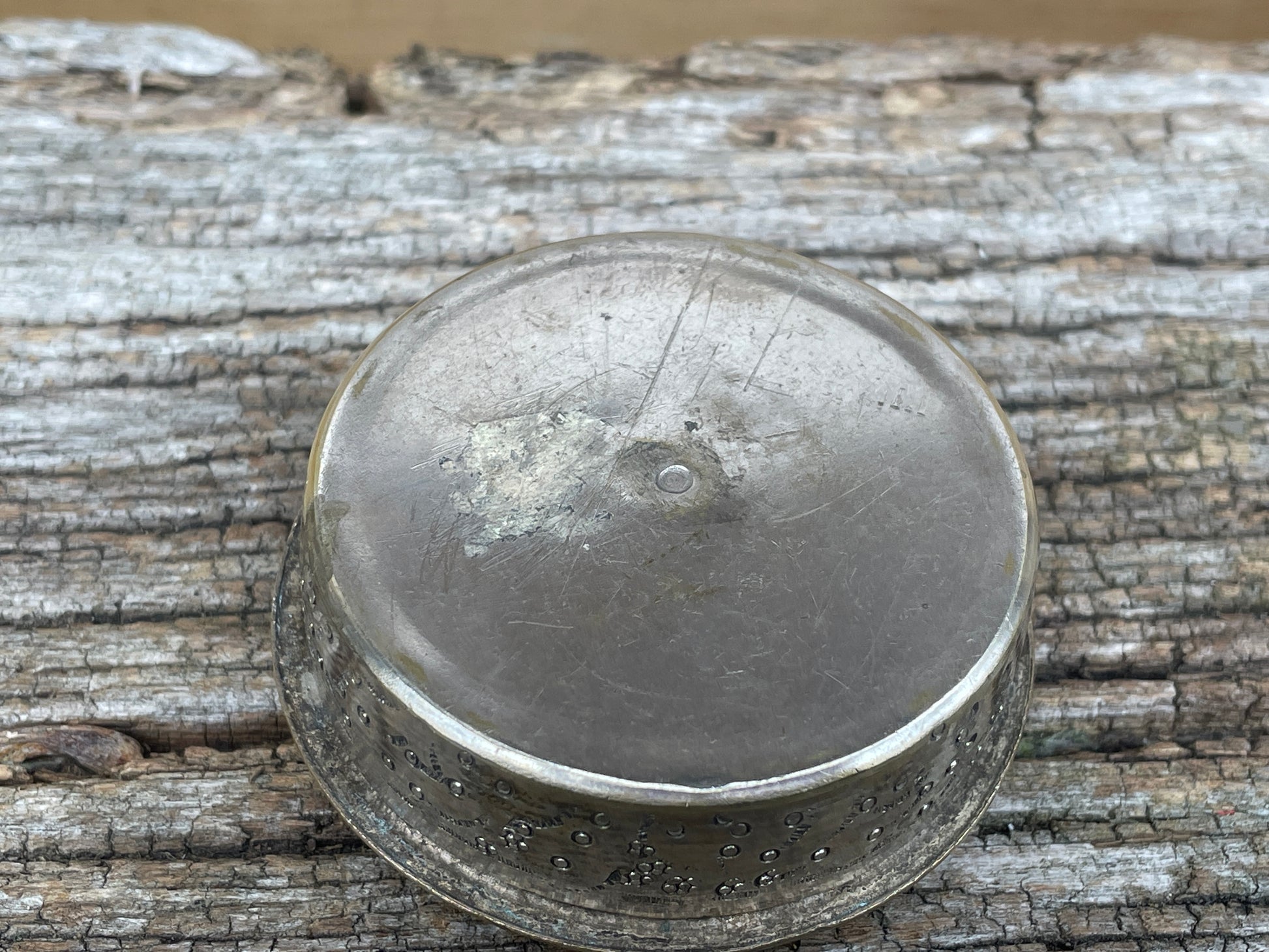 Vintage brass and ceramic mirrored powder box, pill box with Persian hunter riders chasing their game, hand painted -19th Century