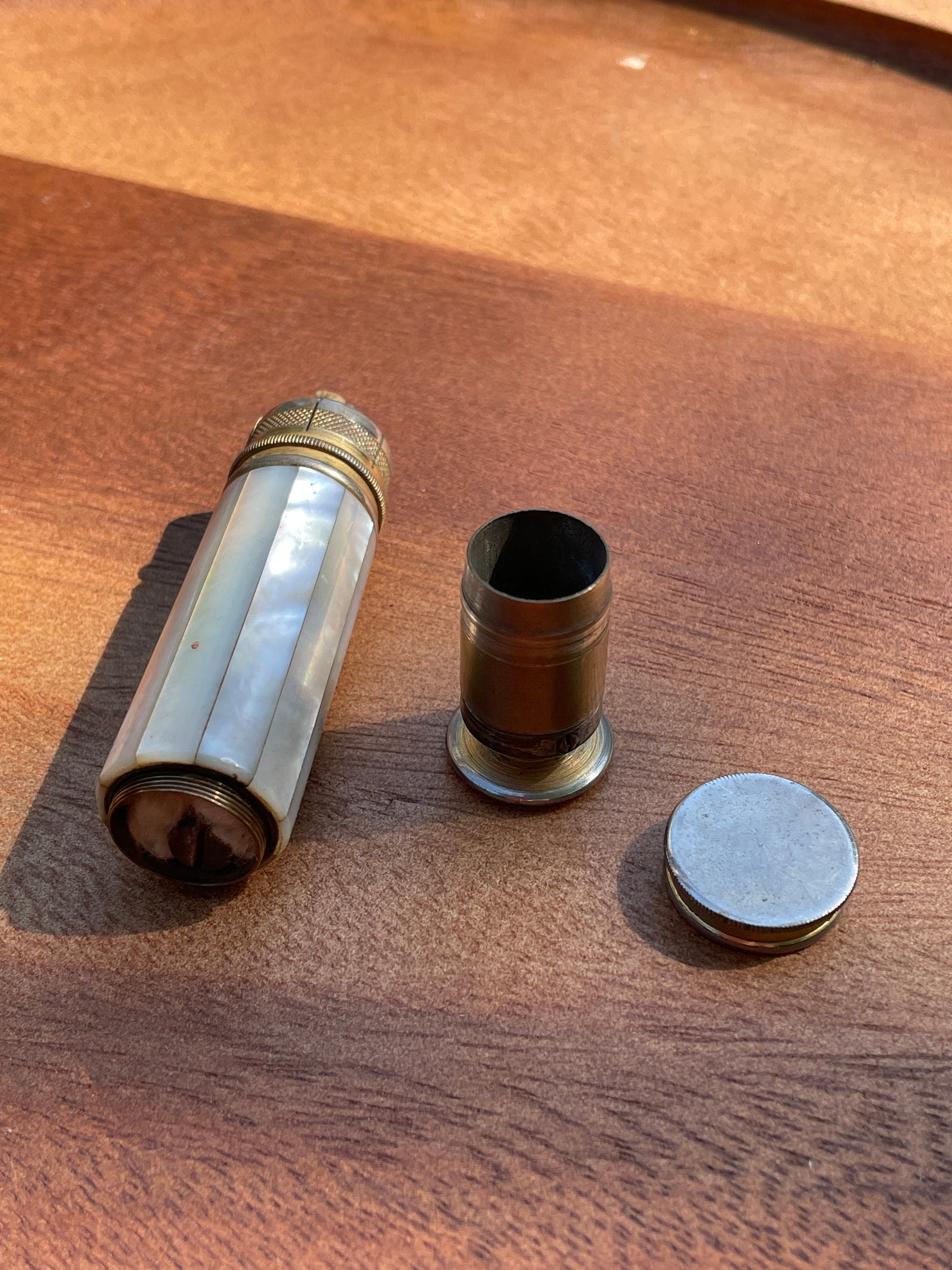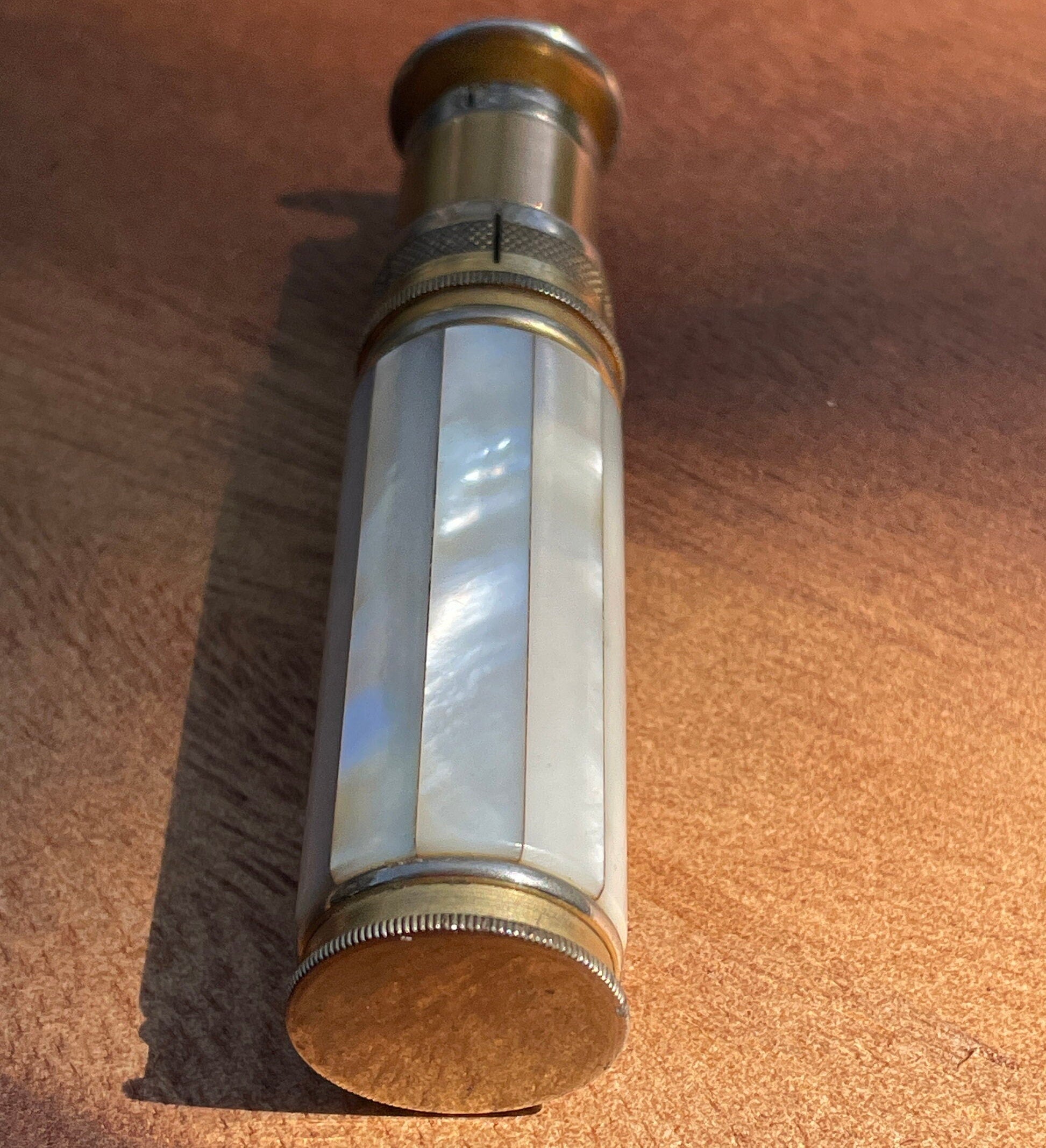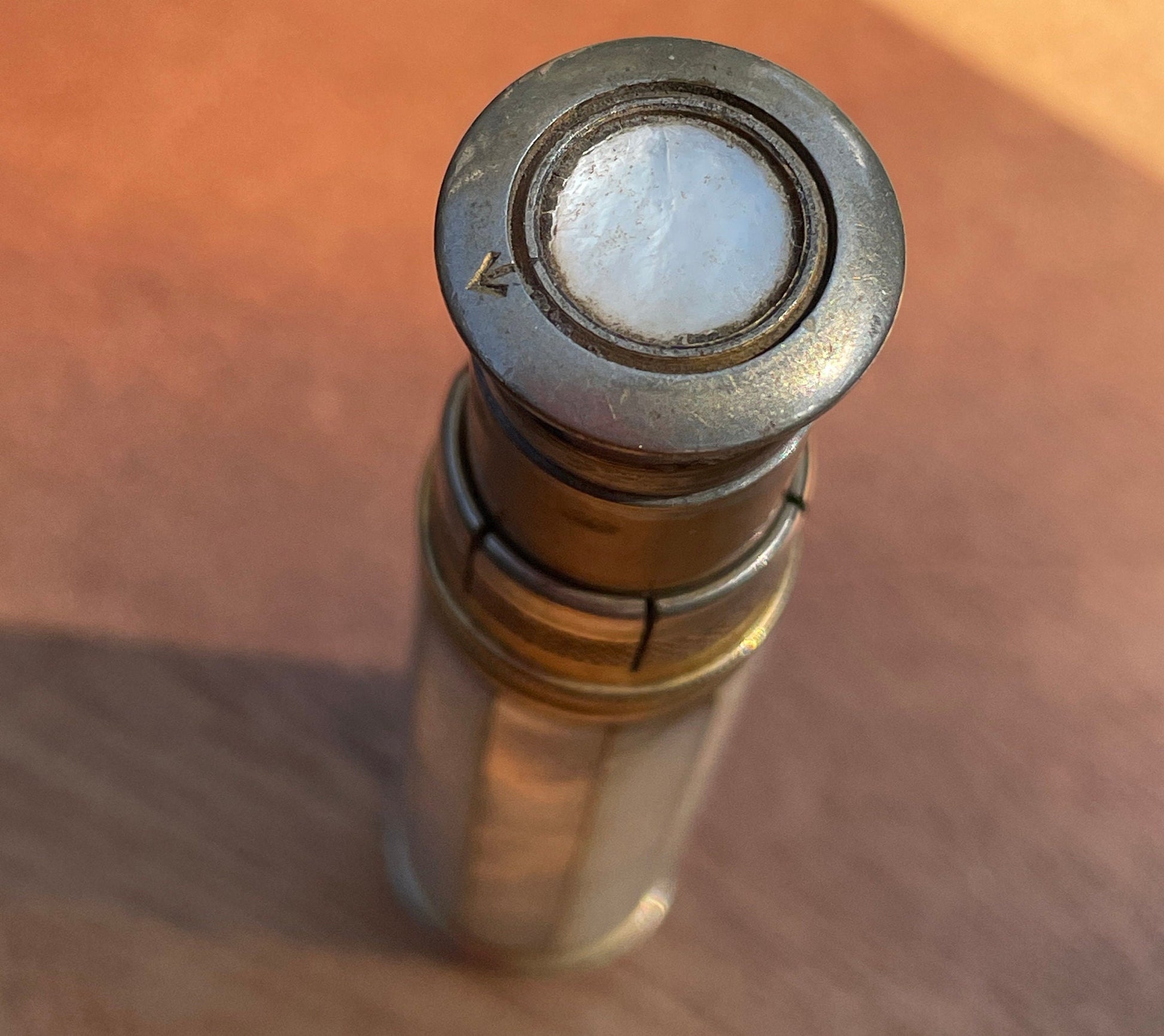 Vintage British army gilt metal and mother of pearl lighter with broad arrow ordnance mark 8.5 cm long