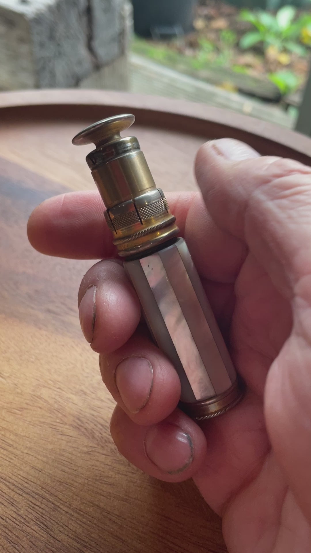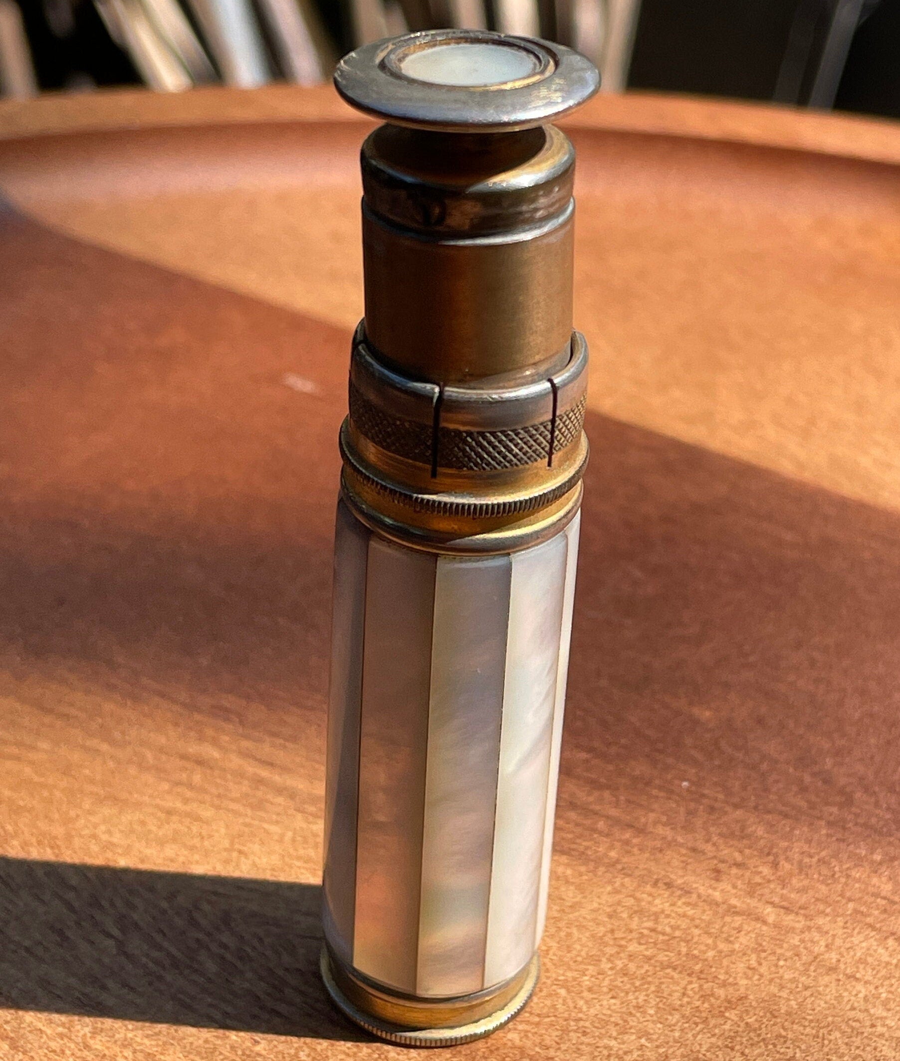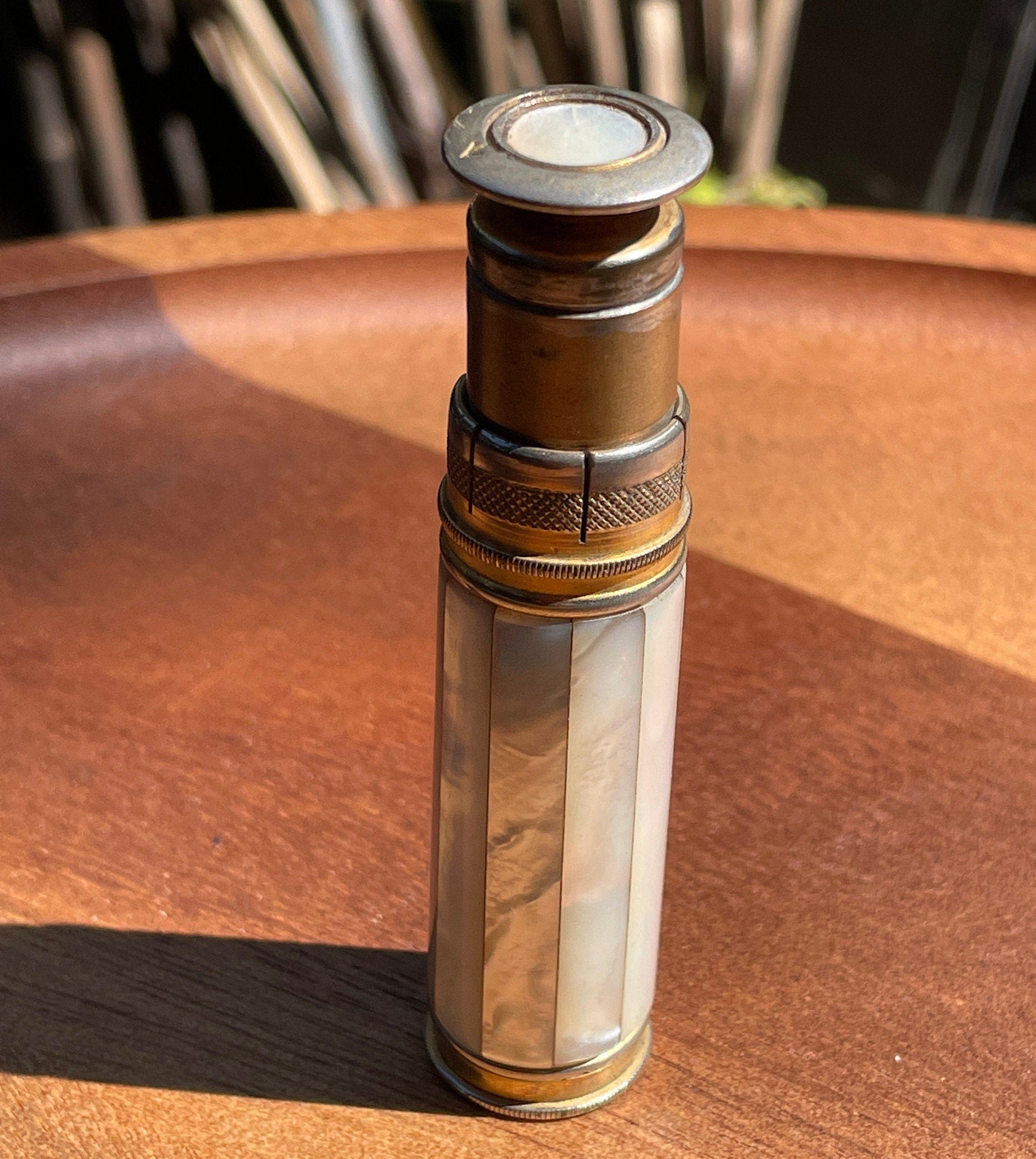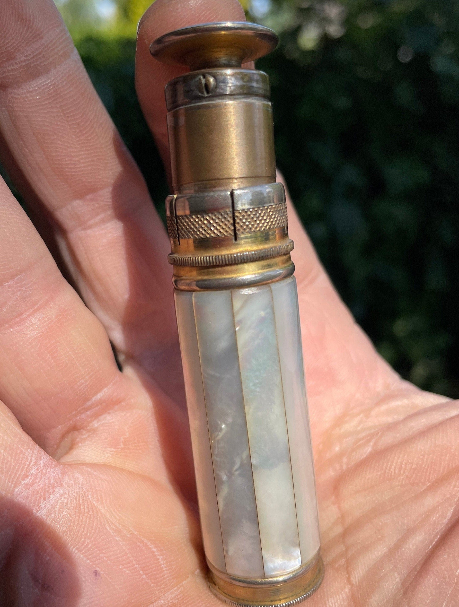 Vintage British army gilt metal and mother of pearl lighter with broad arrow ordnance mark 8.5 cm long