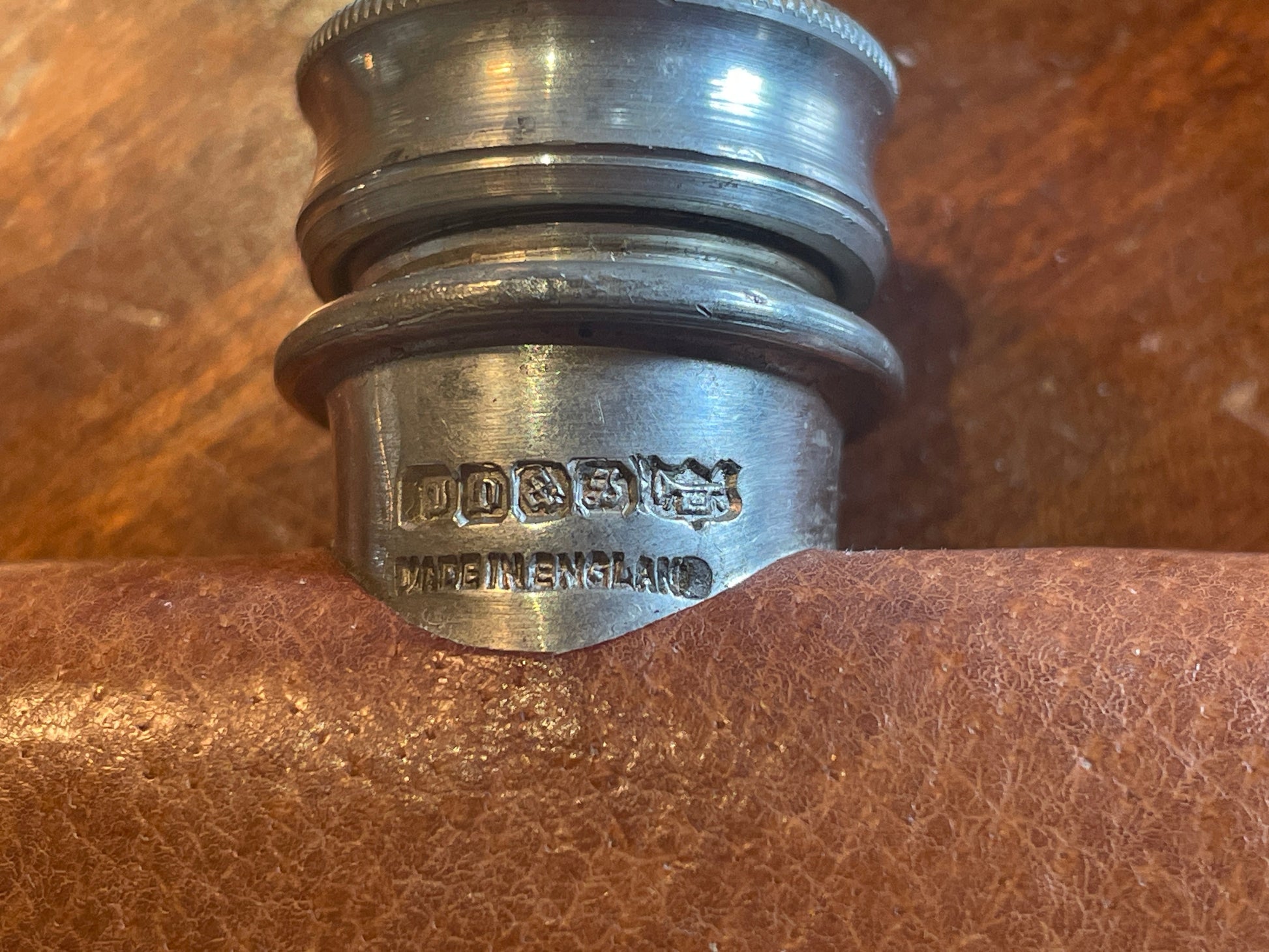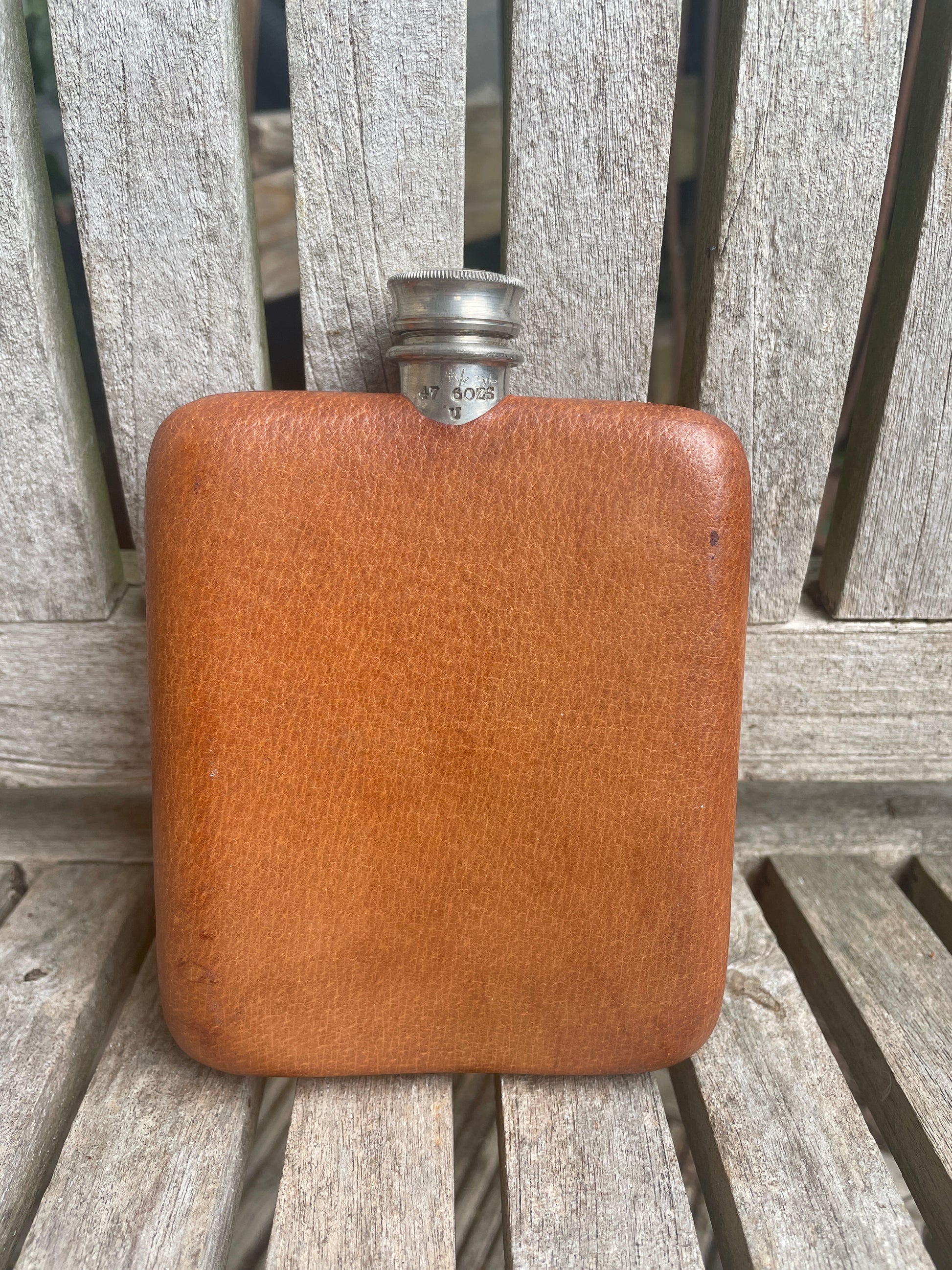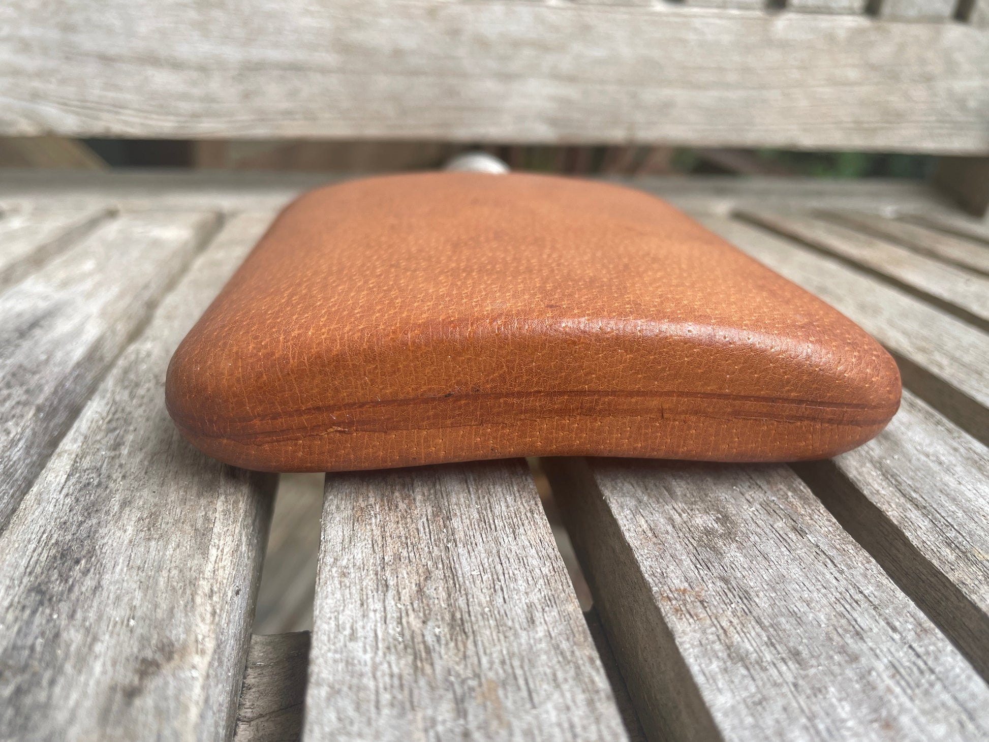 A classic and well-made vintage English hip flask by James Dixon & Sons of Sheffield, dating from the first half of the 20th century. The flask is clad in rich tan leather and fitted with a screw cap stamped “English Electroplate” and marked with the maker’s mark J D & S alongside their iconic trumpet trademark.