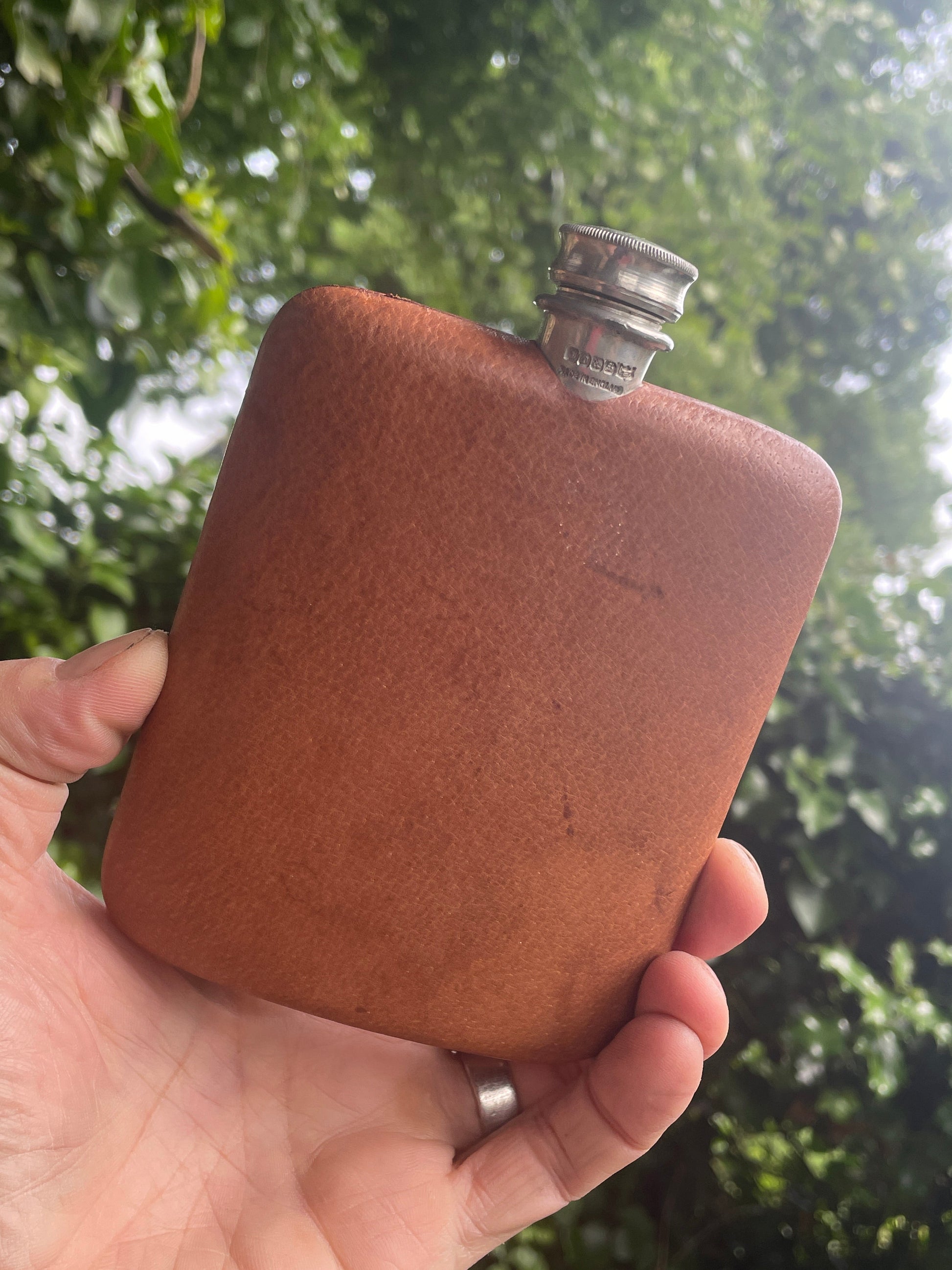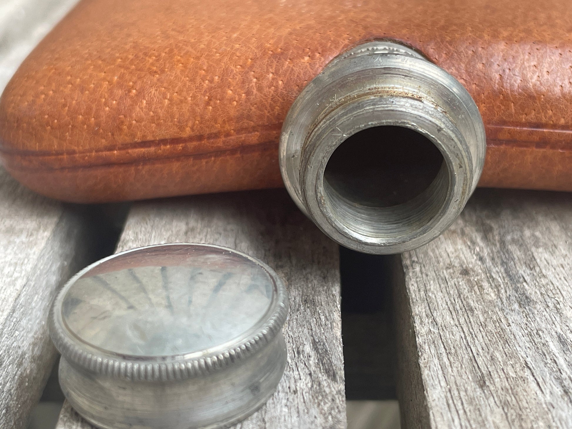 Vintage English Hip Flask – James Dixon & Sons – Electroplated Cap – Leather Clad – Sheffield – 264g – c.1920s–40s