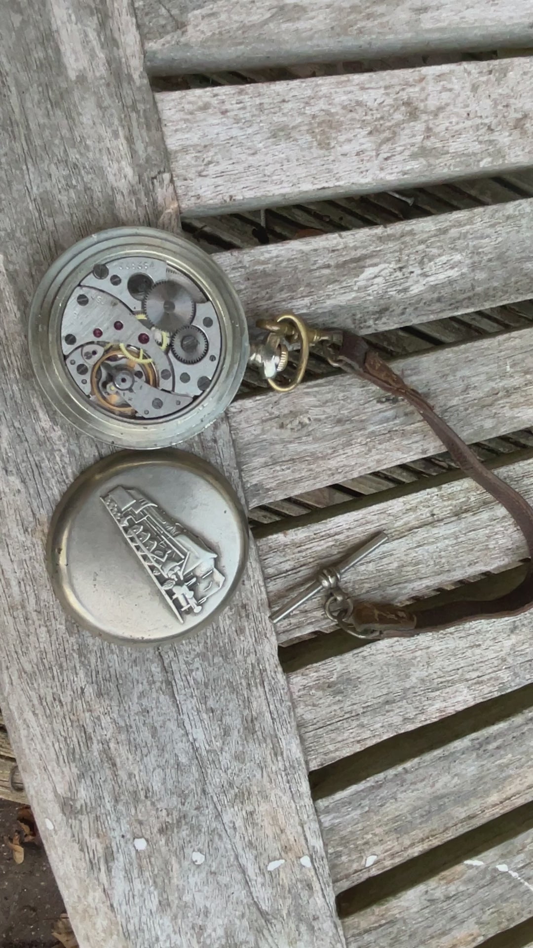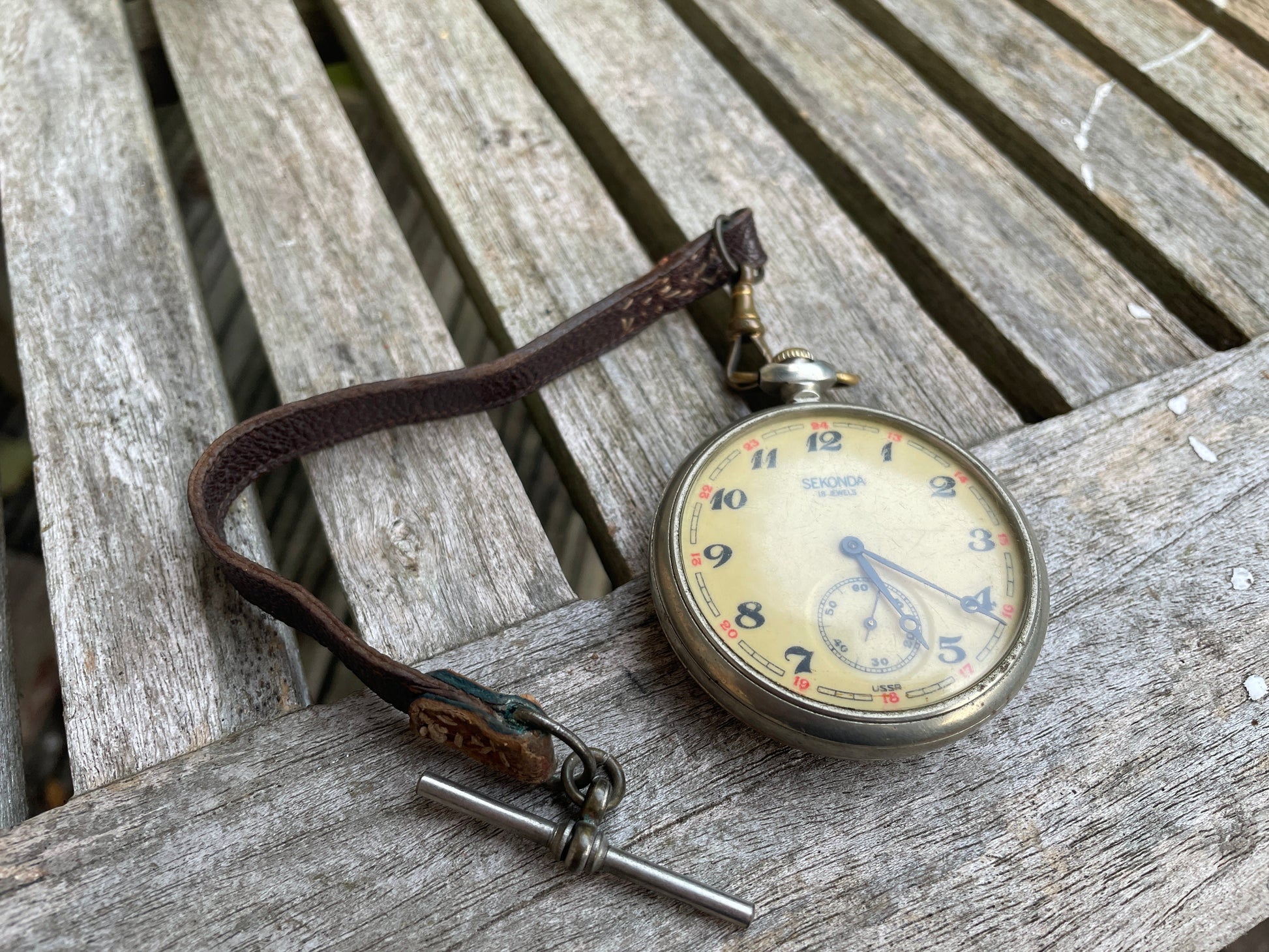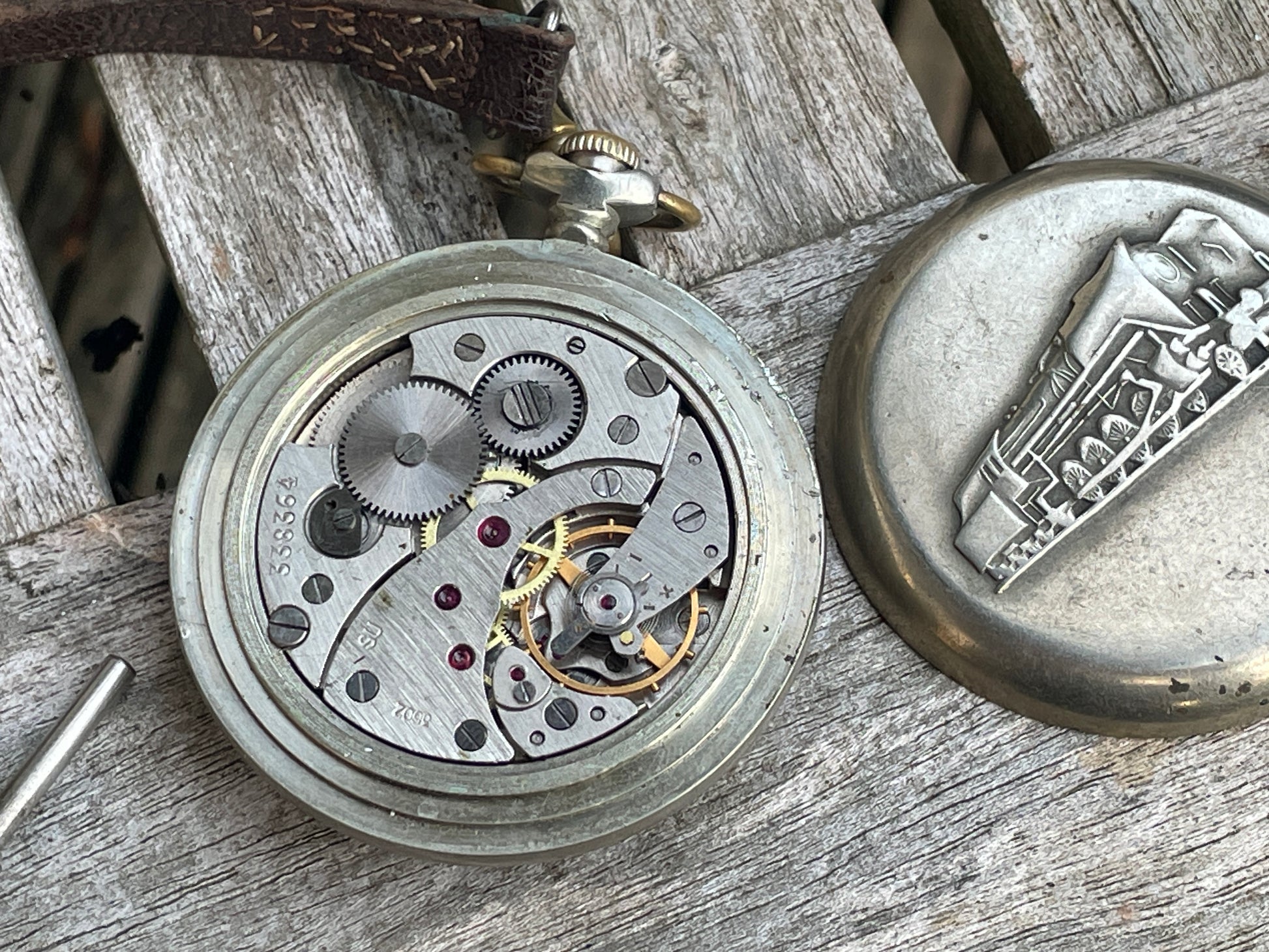 338364 - SU -3502 inscribed on movement - manual wind - 5cm diameter - original leather and brass pocket strap with T-bar - as you can see we have had the back off and it ticks away merrily