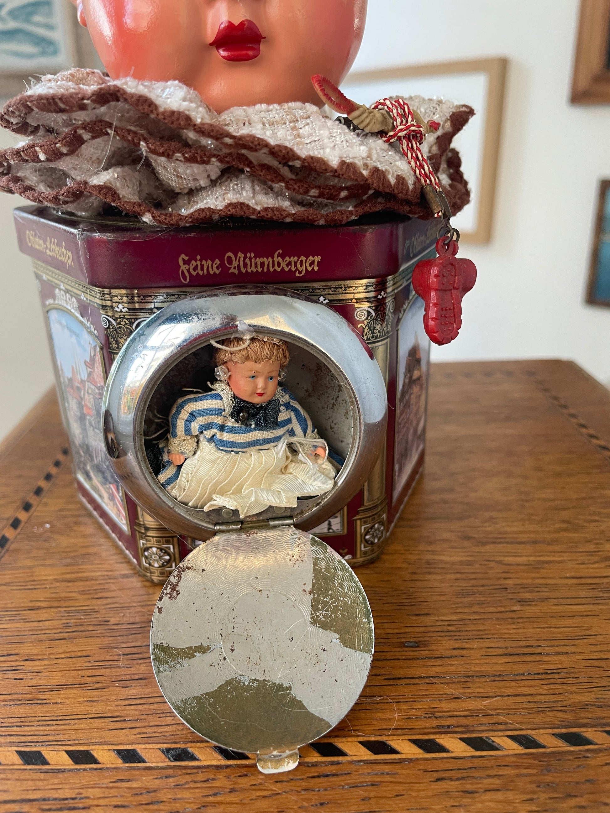 A wonderfully eccentric vintage curiosity composed of a hexagonal “Feine Nürnberger” printed tin paired with a detachable celluloid or hard-plastic doll bust, dressed in layered lace and ribbon trim. At the front of the tin sits a round chromed aperture with a hinged cover; when opened, it reveals a tiny seated miniature doll dressed in a blue-and-white outfit, nestled inside the metal chamber.