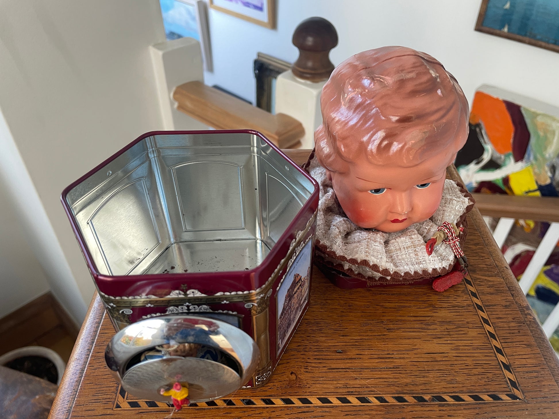 The lid—formed from the doll’s head and shoulders—is removable, converting the piece into a storage tin with an unexpected decorative twist. Likely assembled as a mid-century novelty gift or souvenir piece, this unusual combination of confectionery tin, doll components and miniature tableau is highly collectible for those who love the charming, surreal and offbeat.
