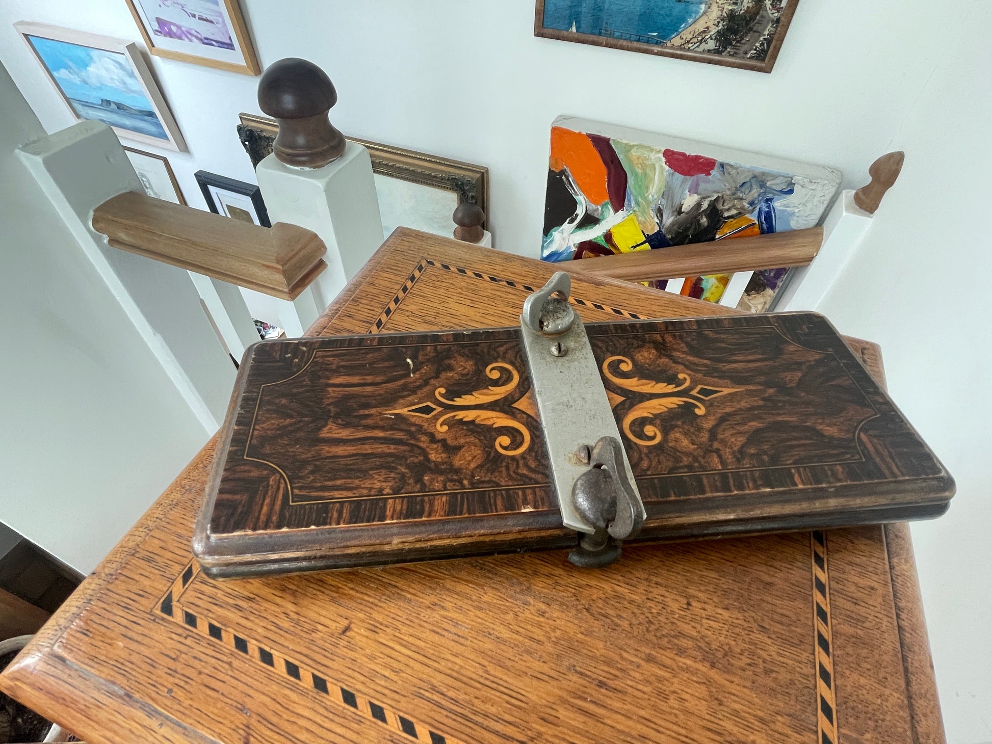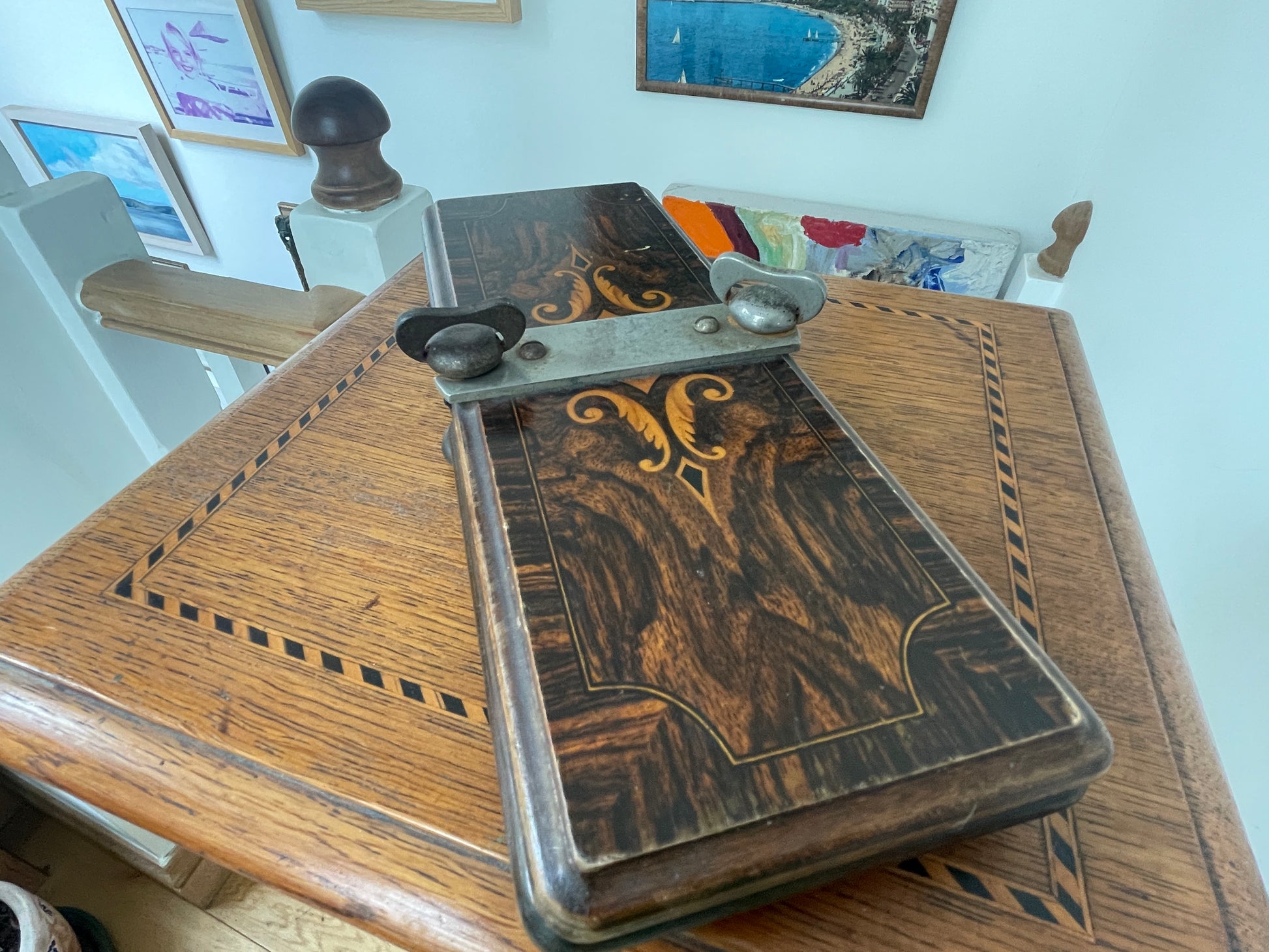 This handsome gentleman’s accessory is made from veneered wood with decorative inlay, fitted with a strong steel clamp mechanism to hold ties neatly in place. The reverse retains the original Hepworths branded badge and a plate stamped with British Patent Number 327104-30, referencing improvements in fastening design of the period.
