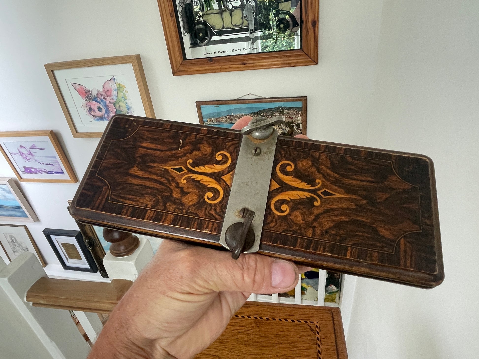 Condition: Good vintage condition with surface wear to wood and patina to fittings consistent with age. Mechanism sound. - needs a clean and polish - a little corrosion to the chromed fixings