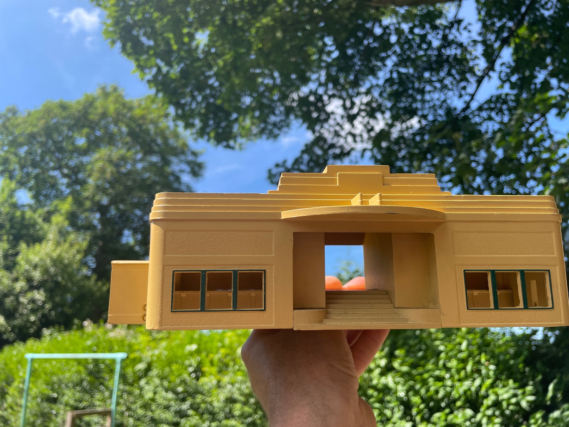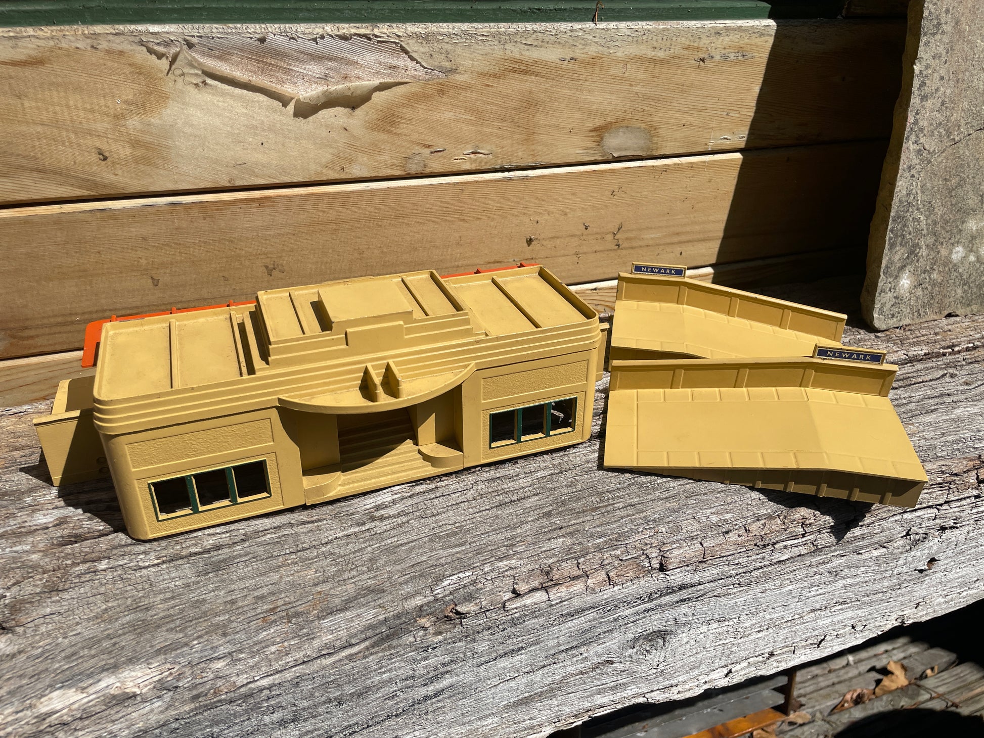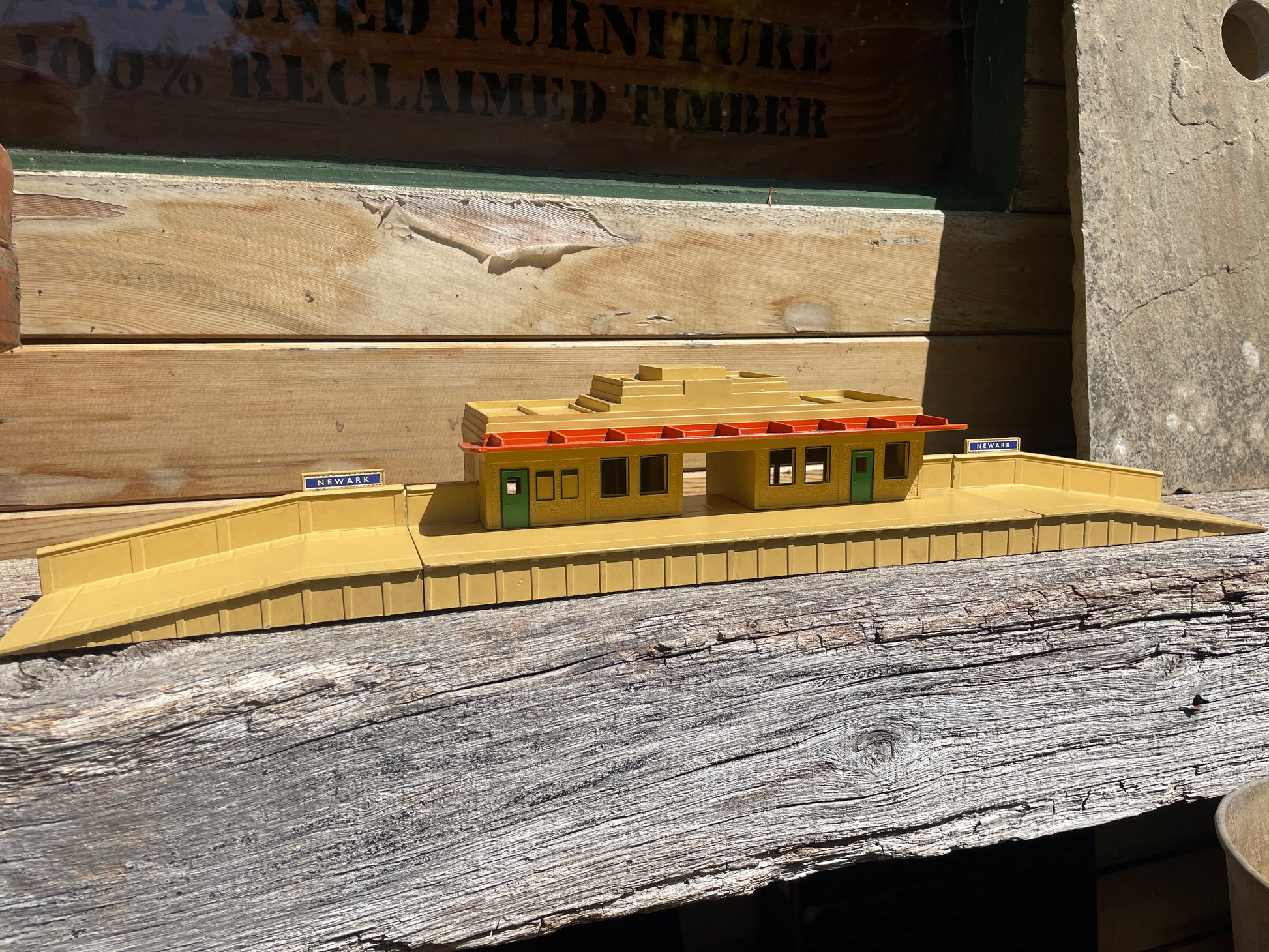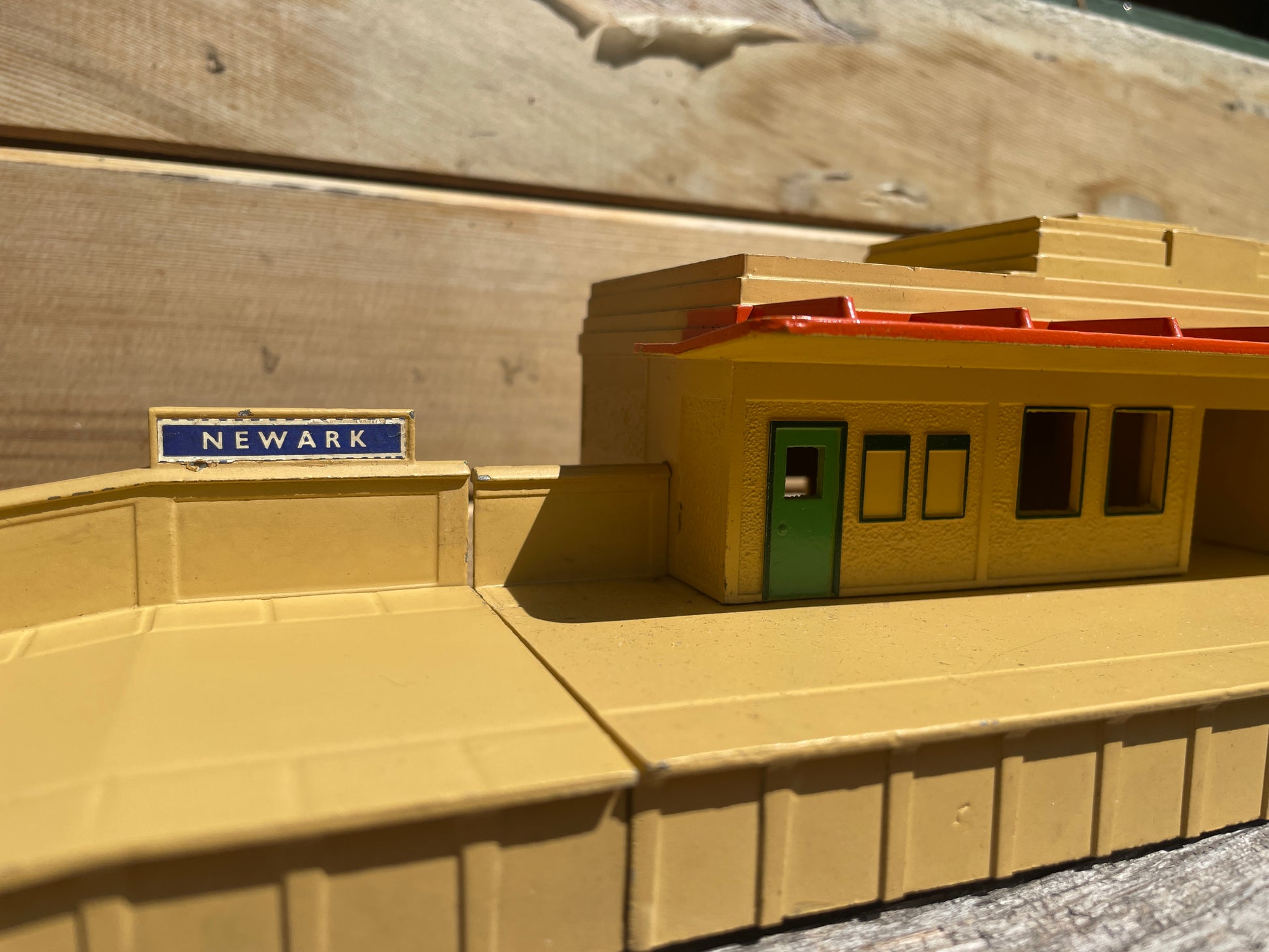 Complete with matching side platforms and original Newark station signs, this iconic plastic station features Art Deco styling, a two-tone roof, and textured detail throughout.