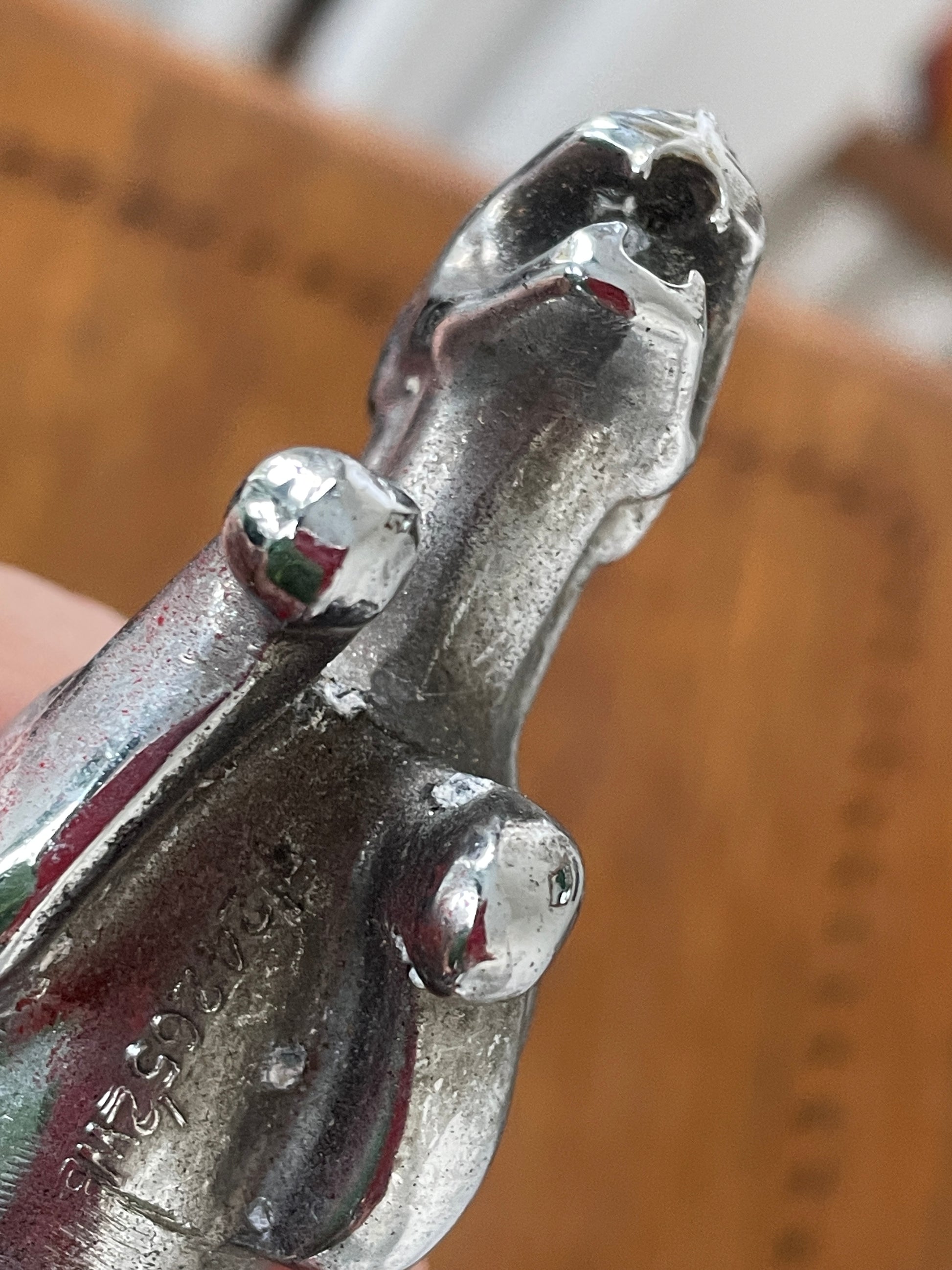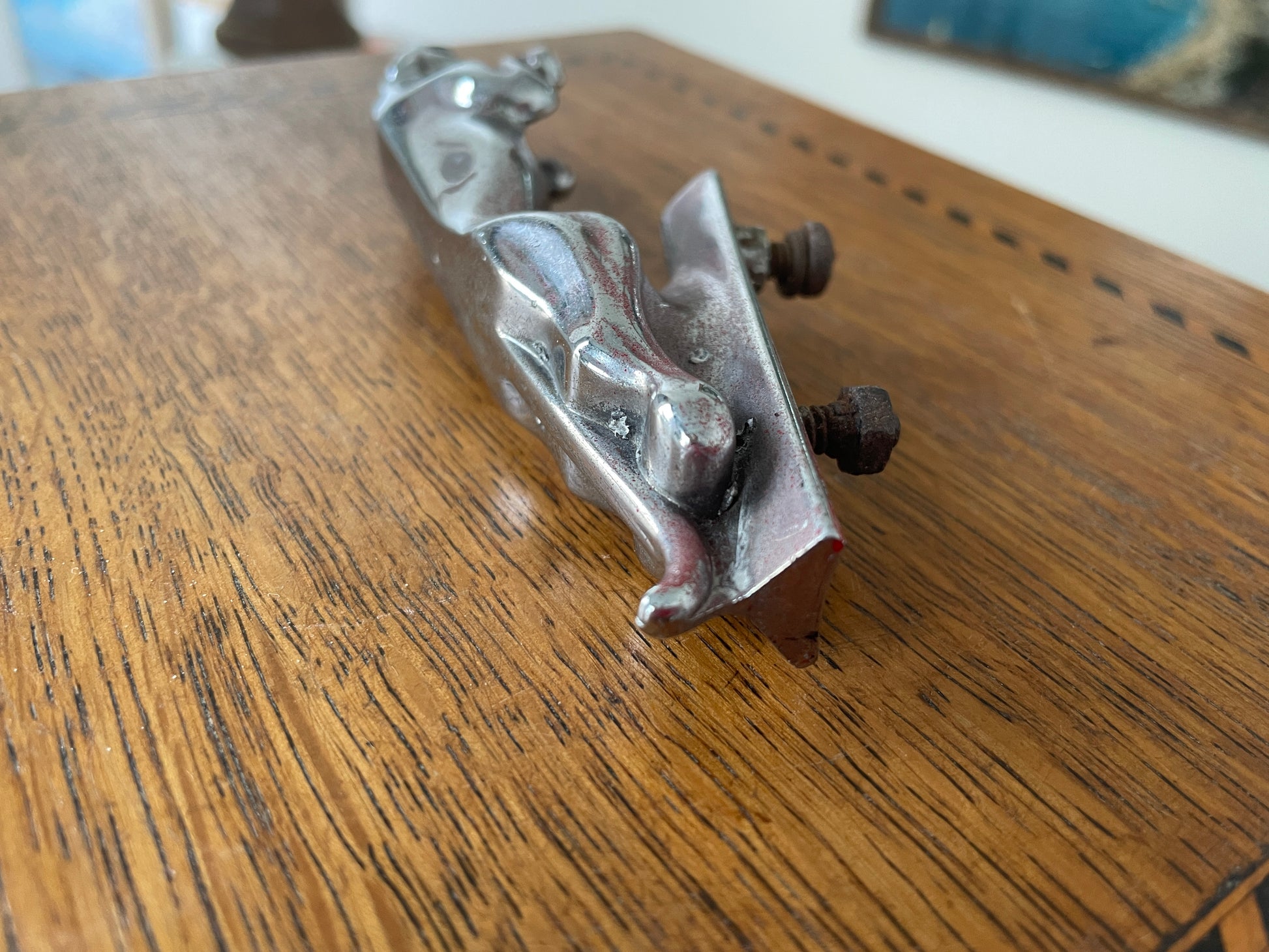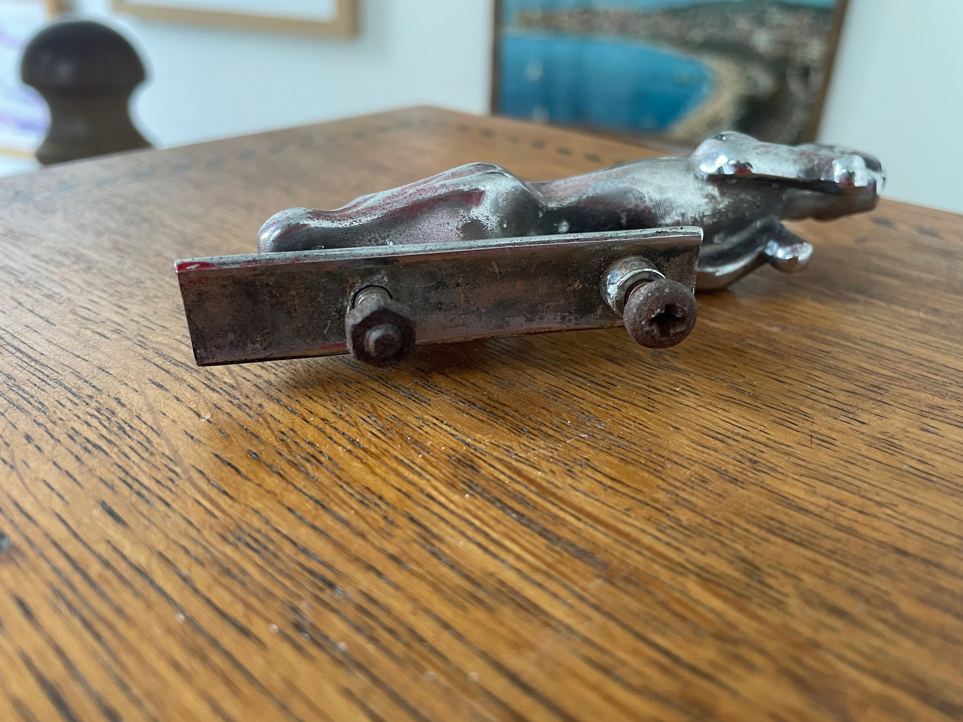 The surface shows honest wear from age and use, including light pitting and spotting to the chrome, with corrosion visible to the fixing bolts. Despite this, the detailing remains crisp and the piece displays extremely well as a standalone object.
