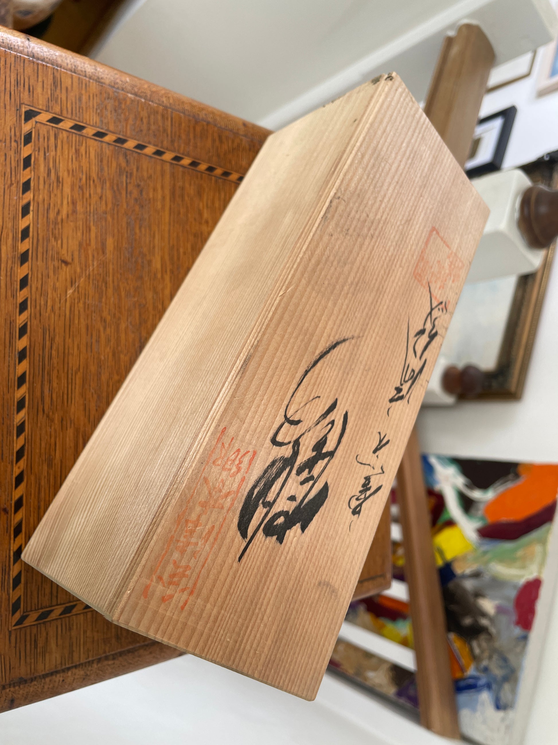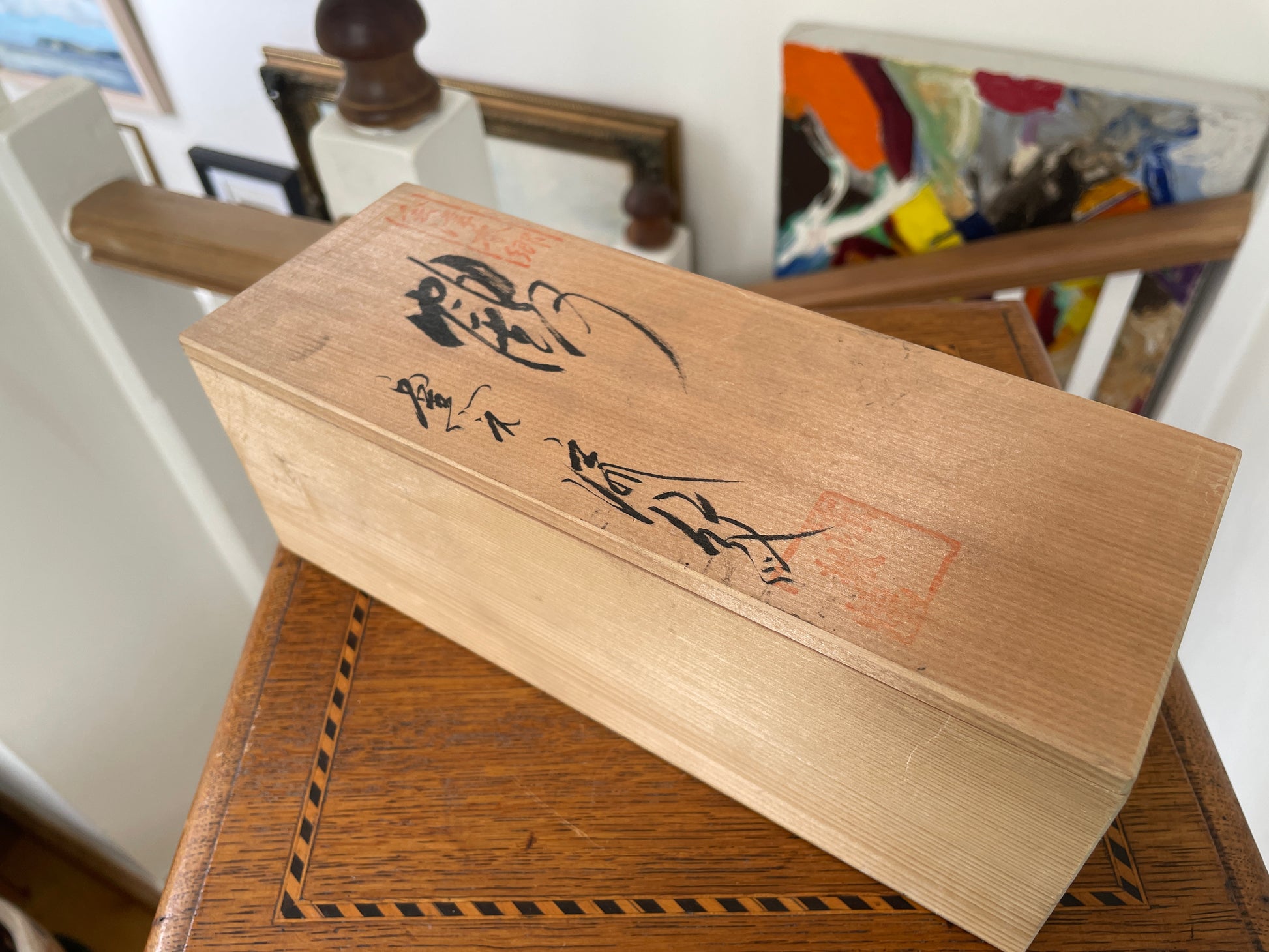 The vase measures 19.5 cm in height and comes complete with its original kiri (paulownia wood) presentation box, inscribed with calligraphy and seal marks. These signed wooden boxes (tomobako) are typically reserved for high-quality works and add significant provenance and collectability.
