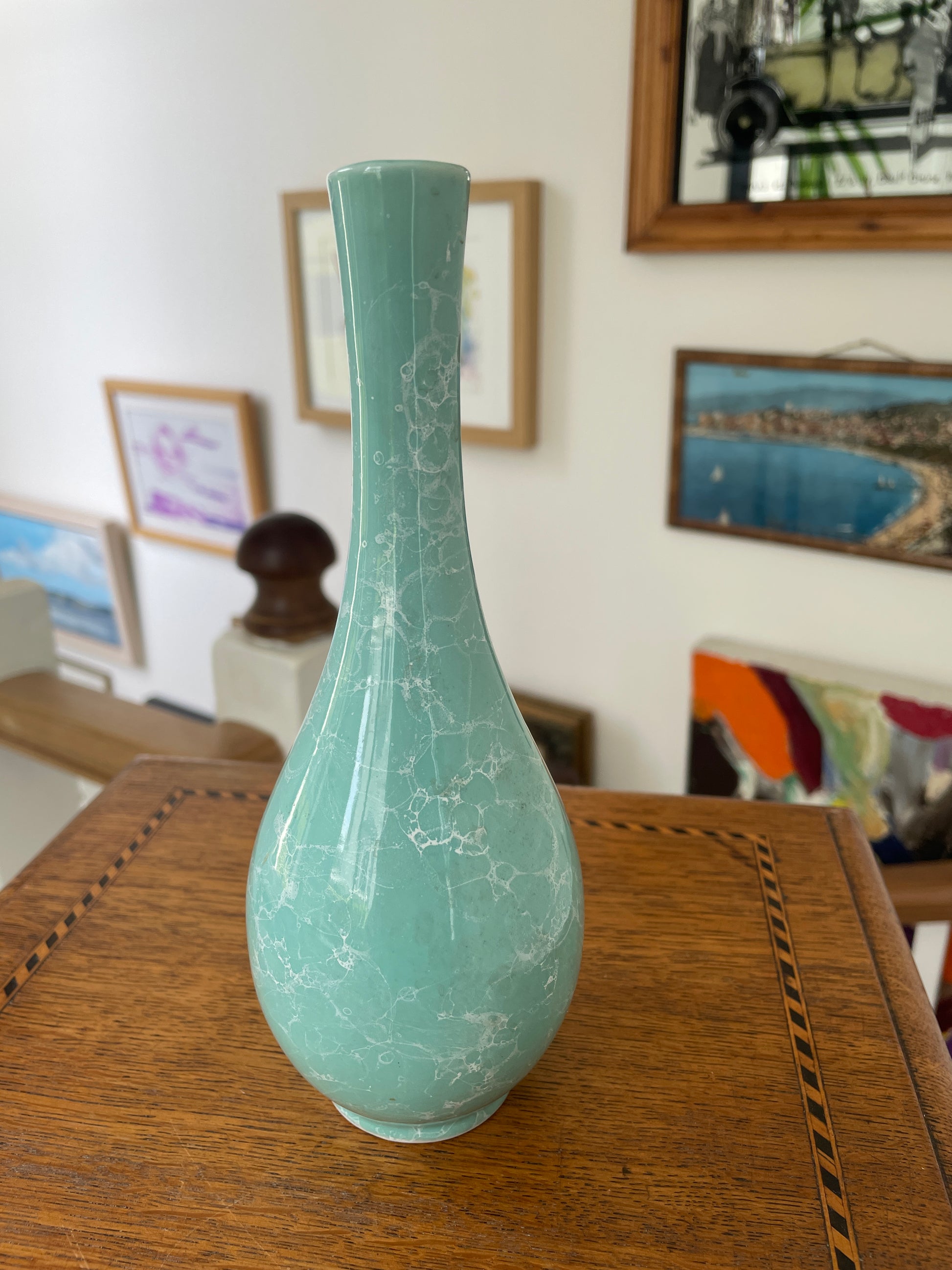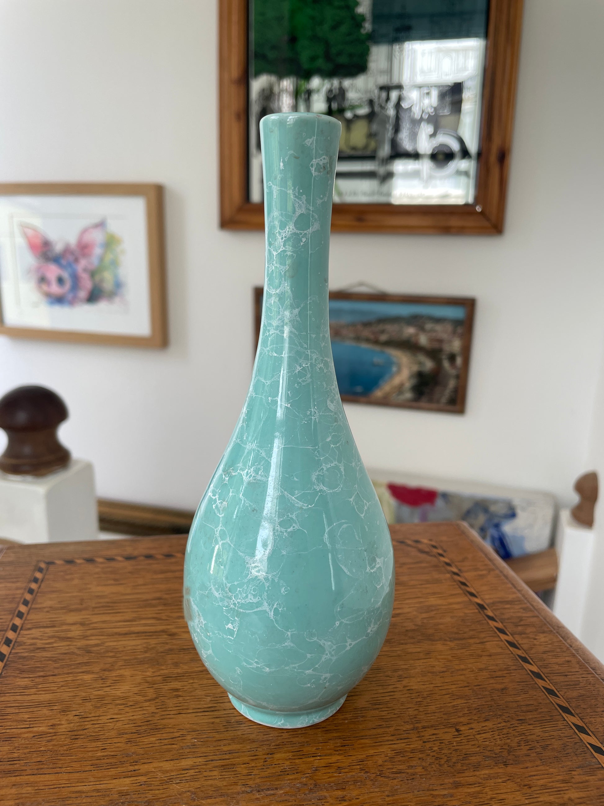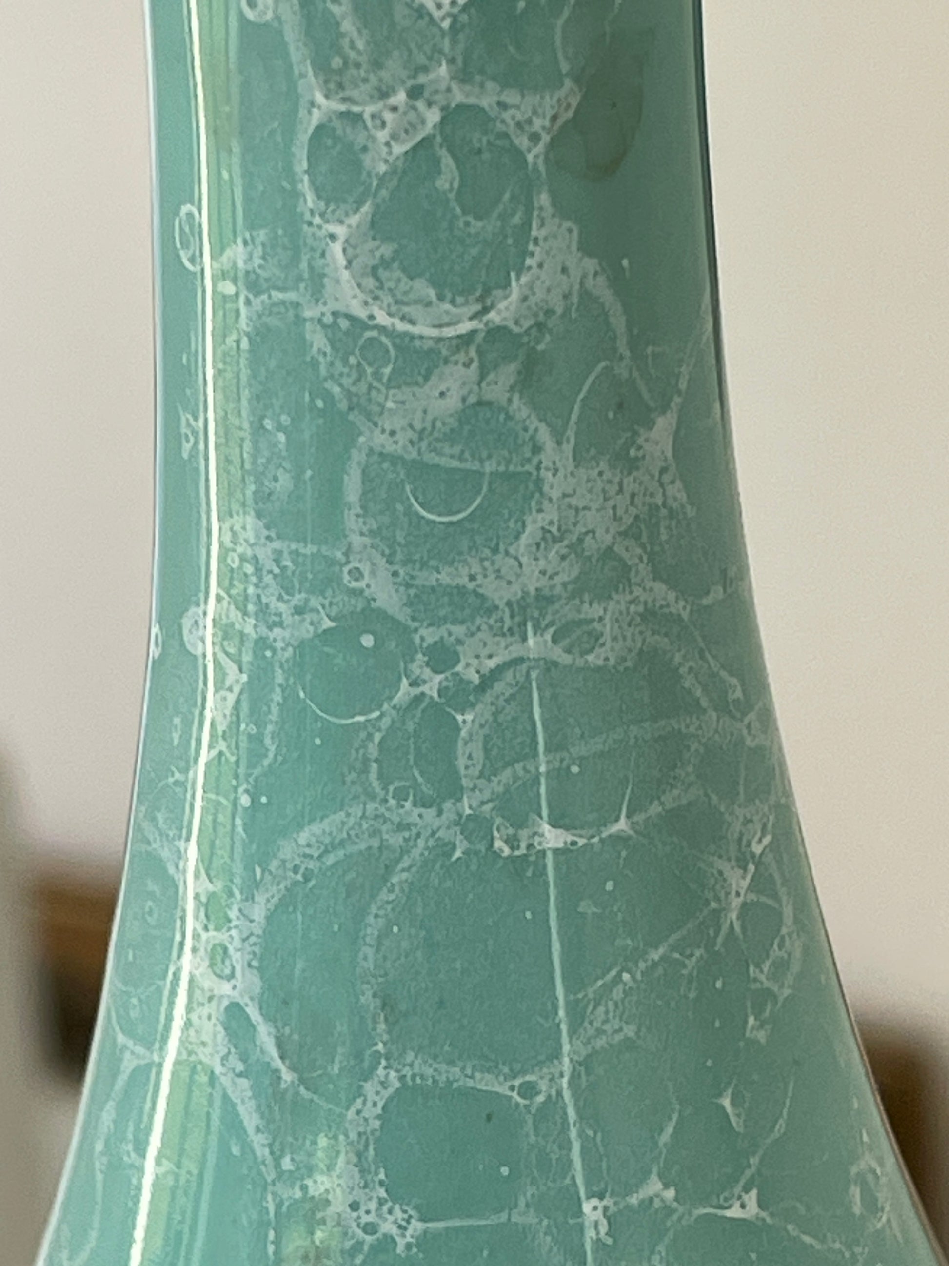 The surface displays an intricate marbled pattern created during the firing process, giving the piece a beautiful depth of colour and texture. The pale turquoise-green glaze shimmers subtly under the light, making this vase a striking display object.