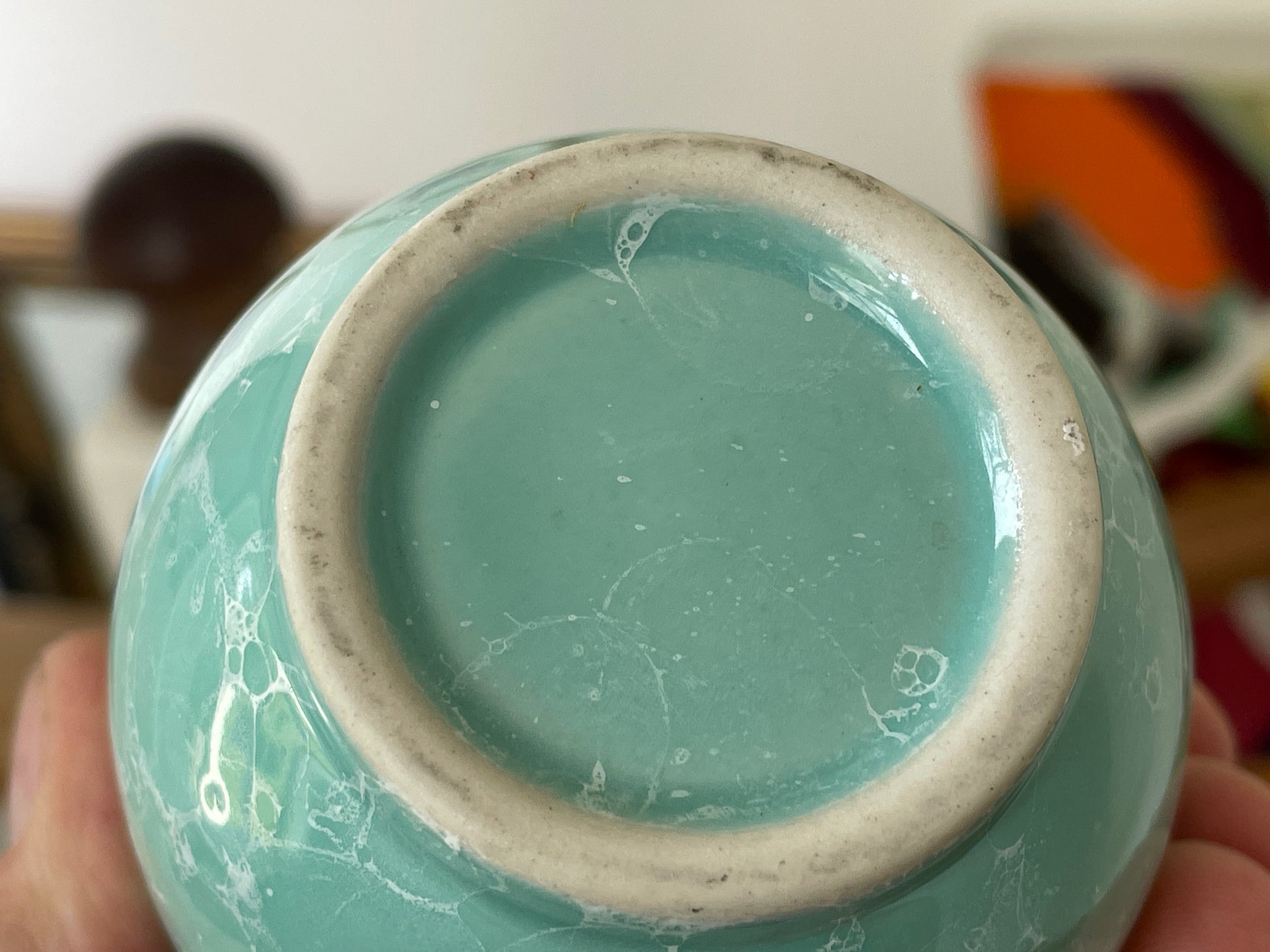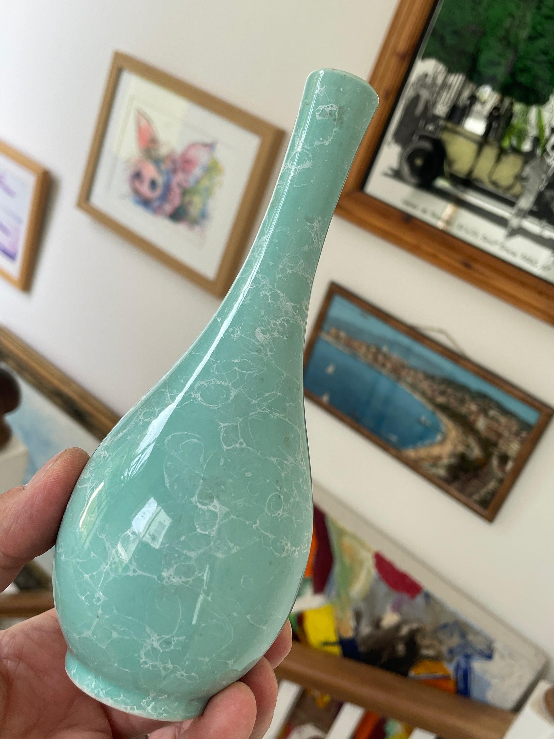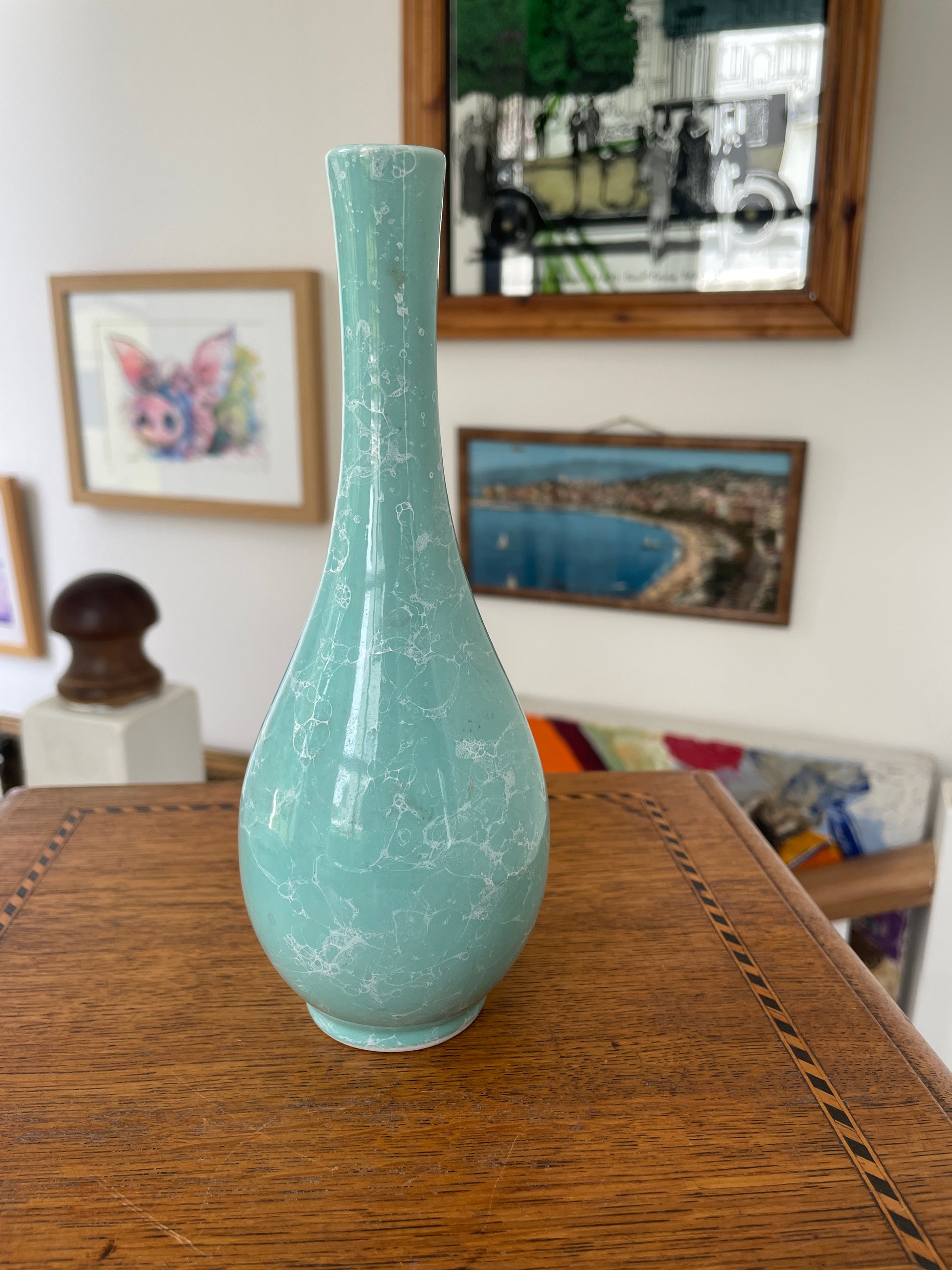 The surface displays an intricate marbled pattern created during the firing process, giving the piece a beautiful depth of colour and texture. The pale turquoise-green glaze shimmers subtly under the light, making this vase a striking display object.