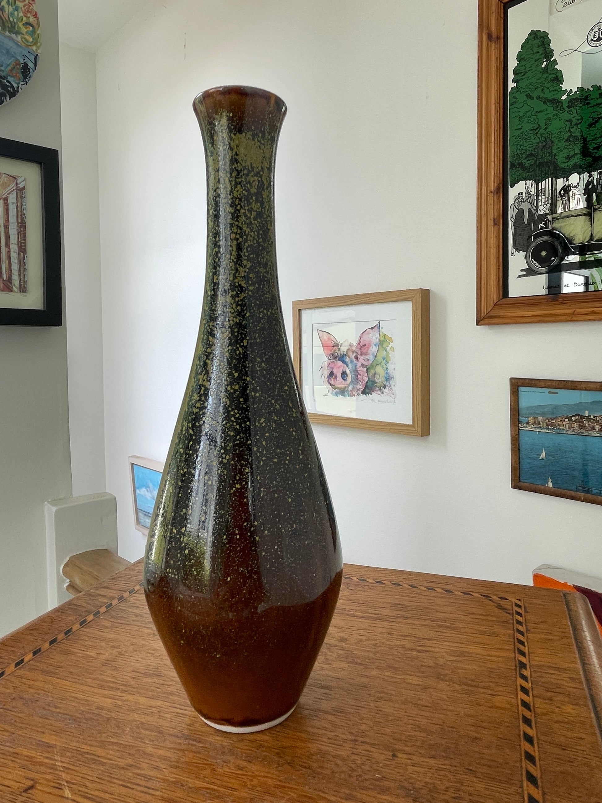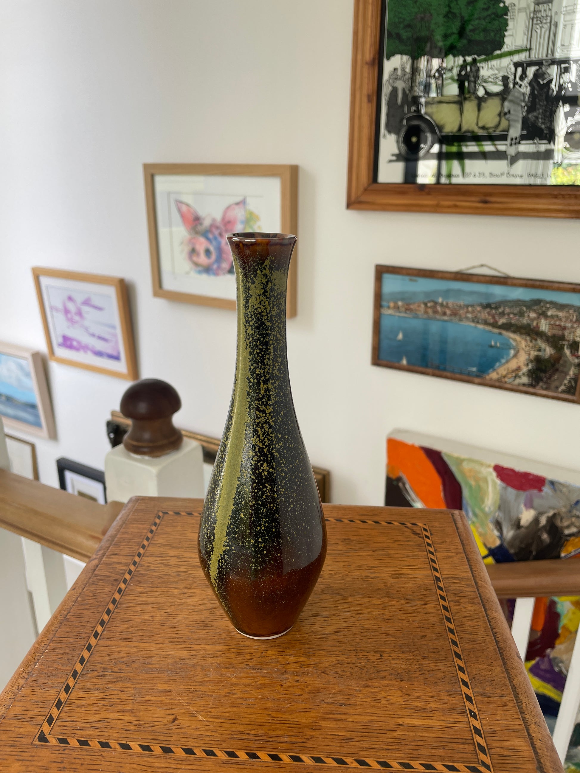 This hand-thrown vase features a rich drip glaze in earthy brown with speckled green accents, a style associated with mid-20th century Japanese ceramics influenced by the Mingei folk craft movement.
