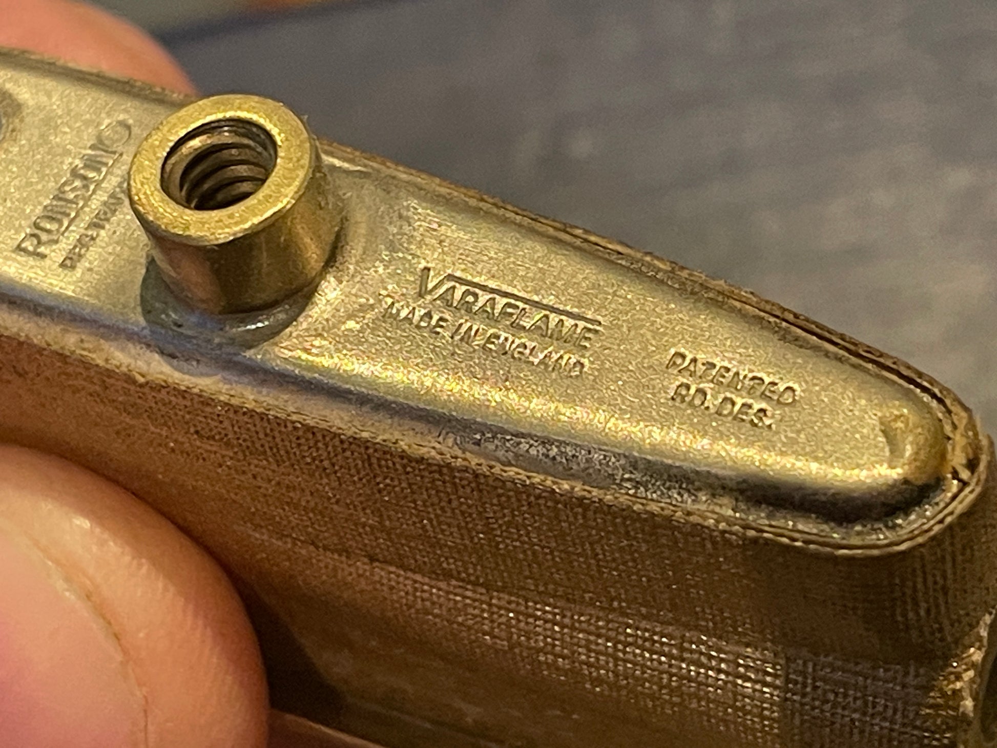 The underside is clearly stamped “Varaflame – Made in U.S.A.” along with Ronson patent and design markings. The lighter is presented in its original Ronson box, with printed interior and satin lining, which adds to its collectability.