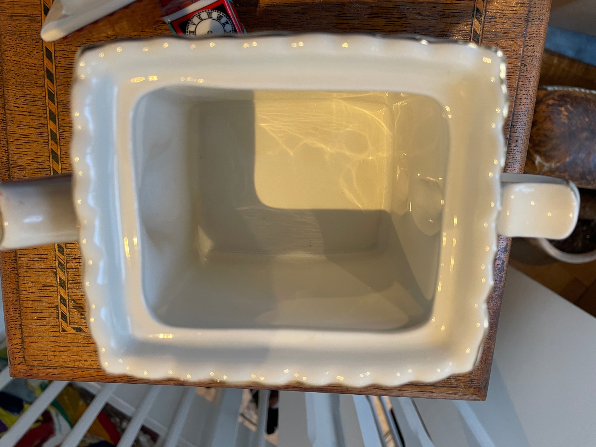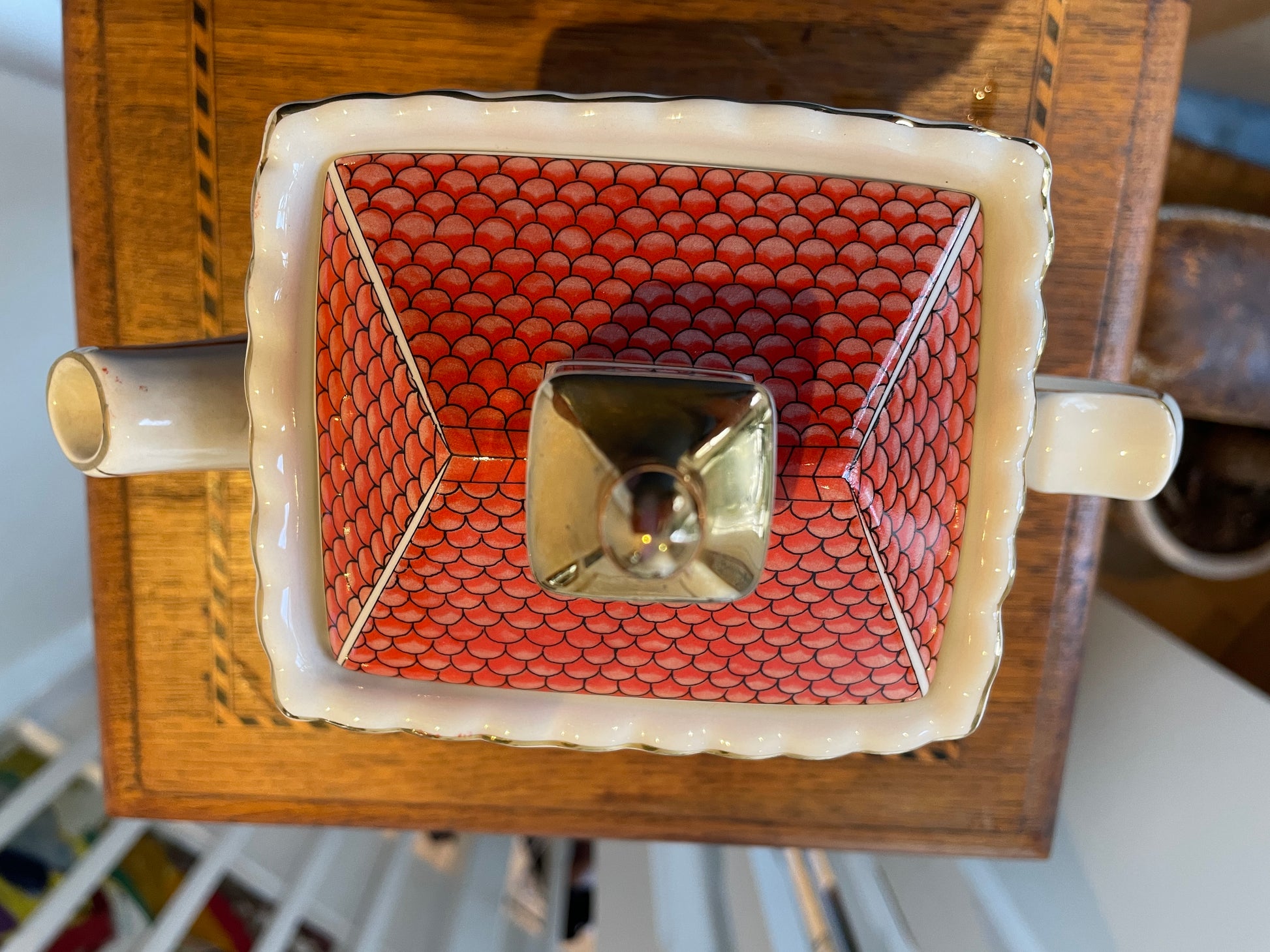 The teapot has a square form with shaped rim and measures approximately 20cm across at its widest point. A colourful display item from a well-known Sadler collector’s range.