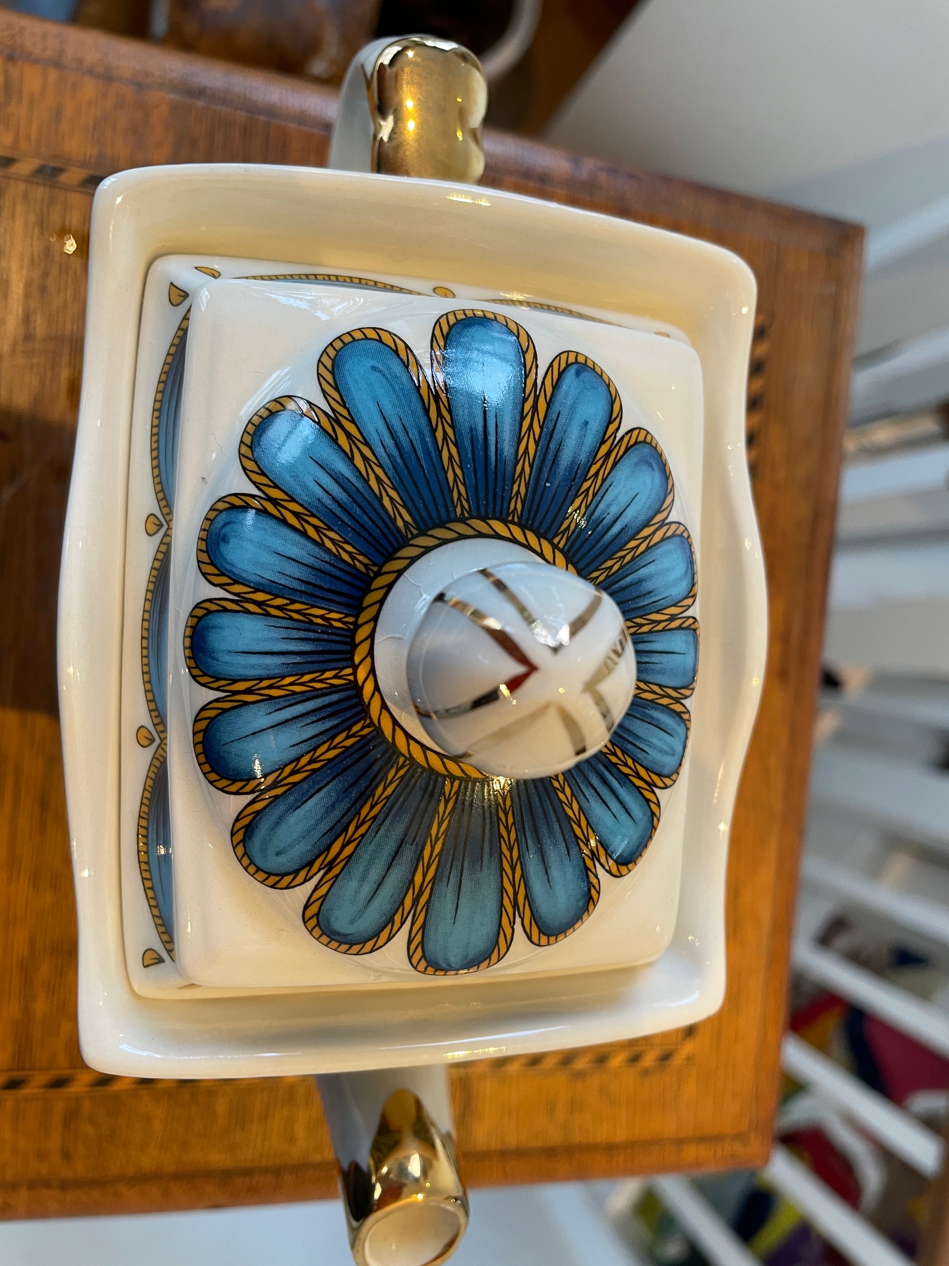 The lid is decorated with theatrical motifs and gilt detailing, and the top finial is also gilt. The base carries the Sadler mark, pattern number 4444 and registered design number 2010603.