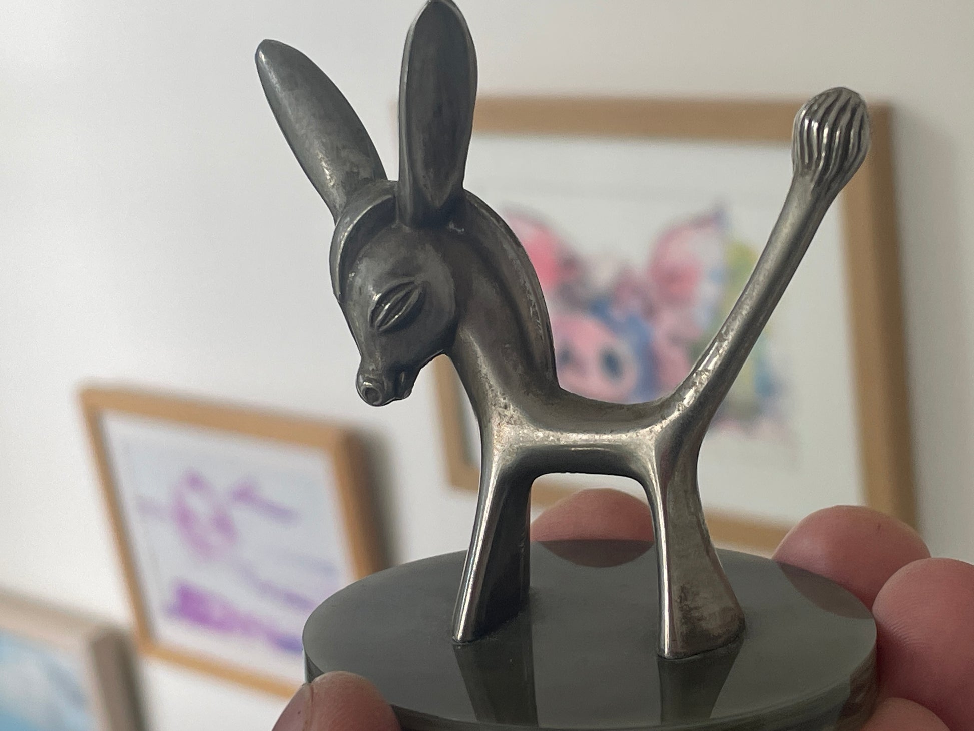 A charming mid-century ring holder by Seba Products, dating from the 1950s–60s. This piece features a stylised donkey or ass figure in silver plate, mounted on a solid green onyx circular base. The upright ears and tail are designed to hold rings securely, making it both decorative and functional.