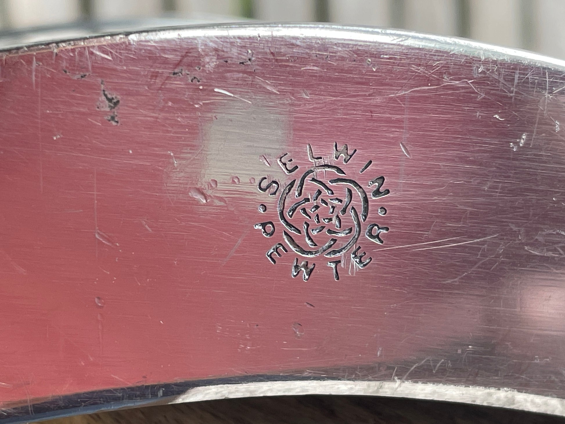 The body is decorated with hammered texturing and triple line banding, adding both style and grip. The base is clearly stamped with the Selwin Pewter rose emblem, confirming British manufacture.