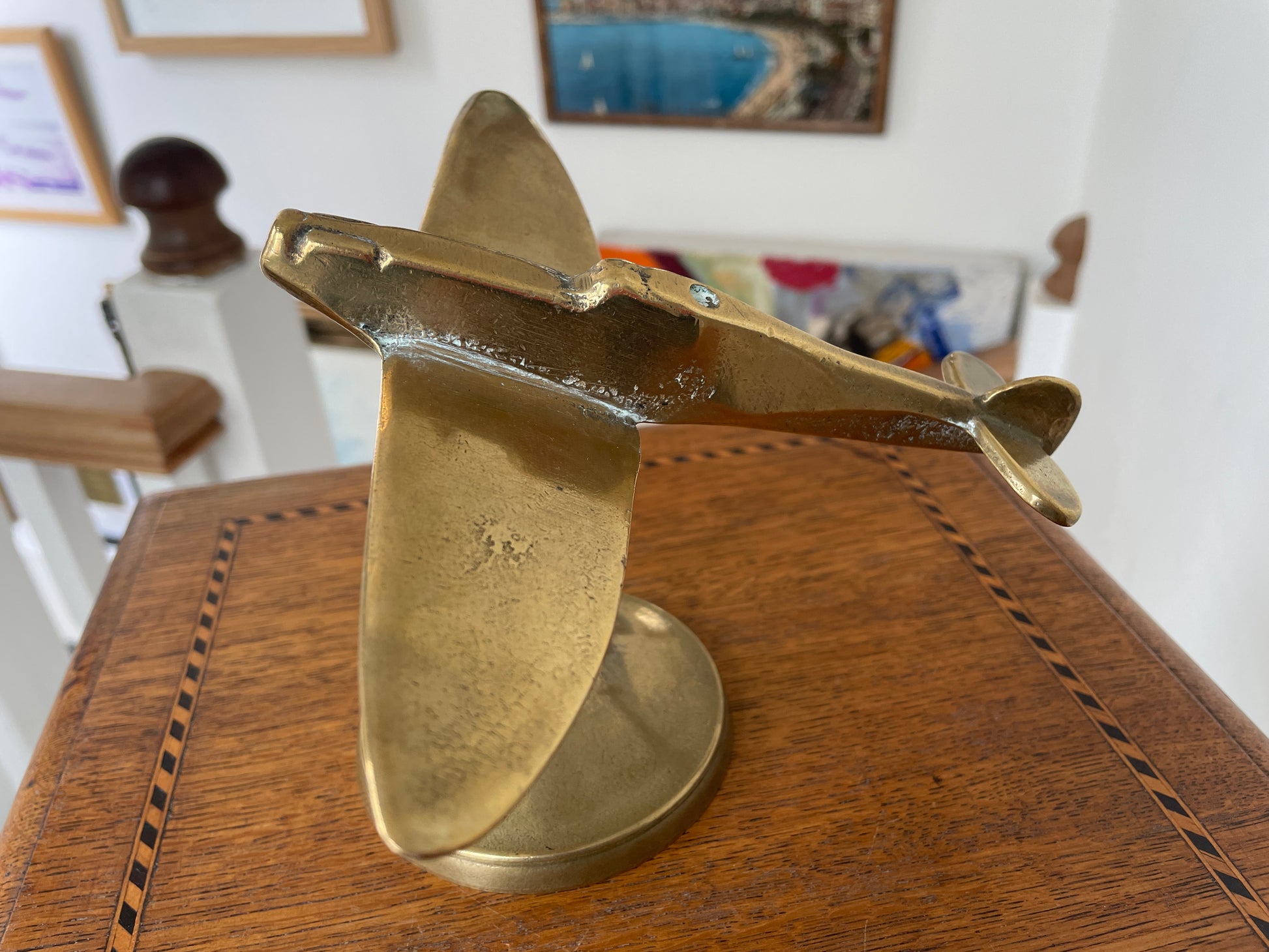 A finely cast solid brass model of the iconic Supermarine Spitfire fighter plane, mounted on its original circular base.