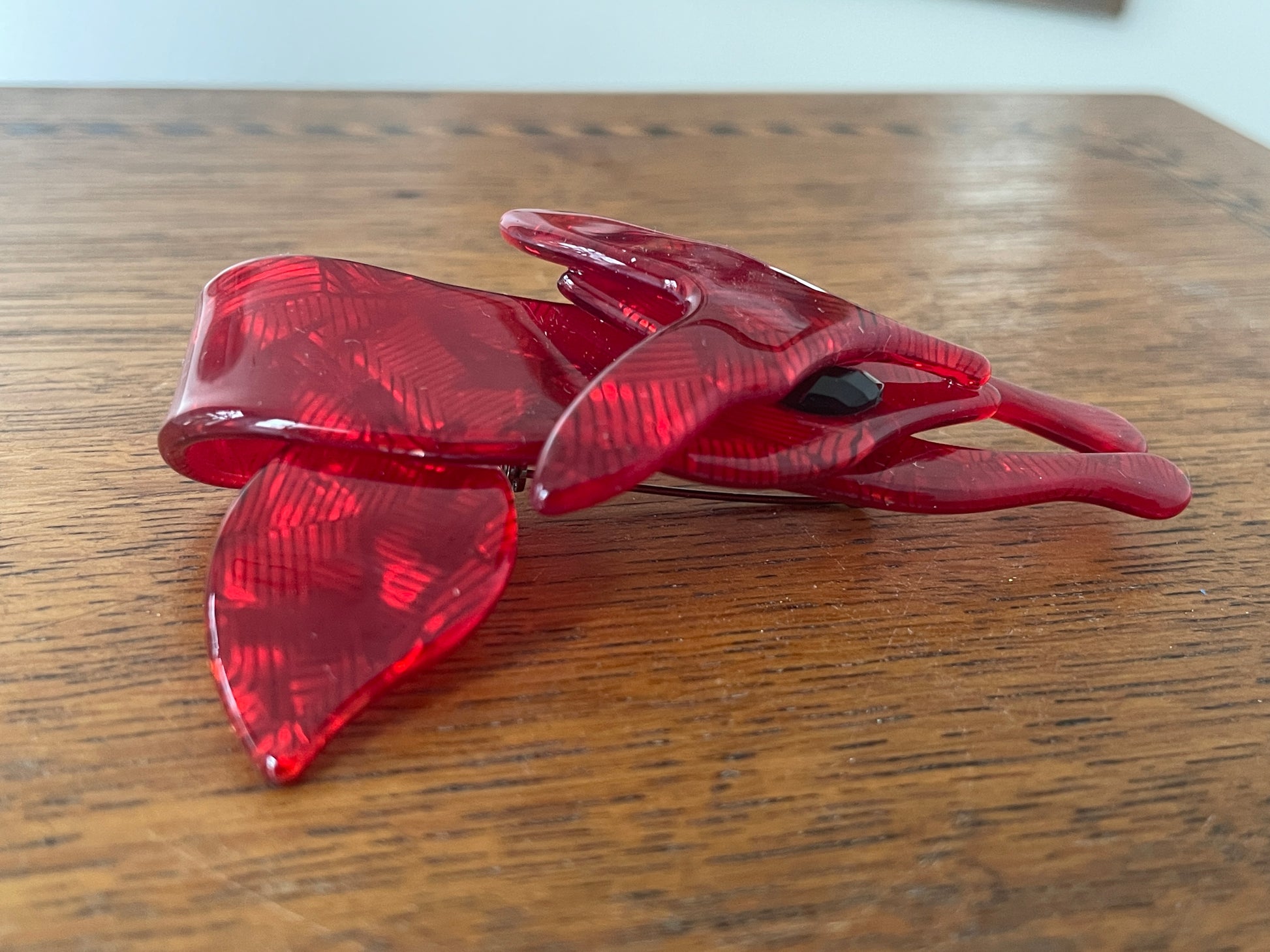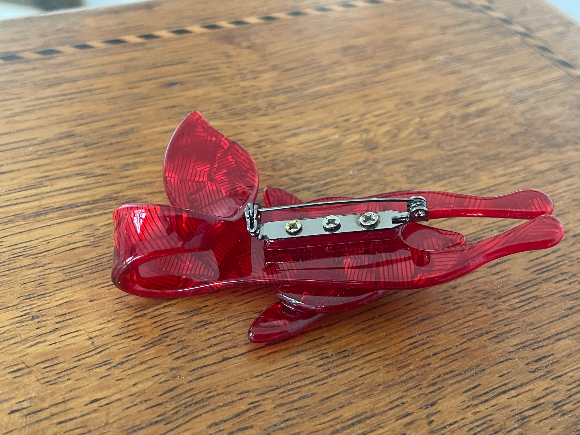 An eye-catching vintage style fox brooch crafted in glossy red plastic with a marbled, textured effect. The fox has a sleek stylised design with jet-black eyes and a curled tail, reminiscent of Art Deco and mid-century animal jewellery.