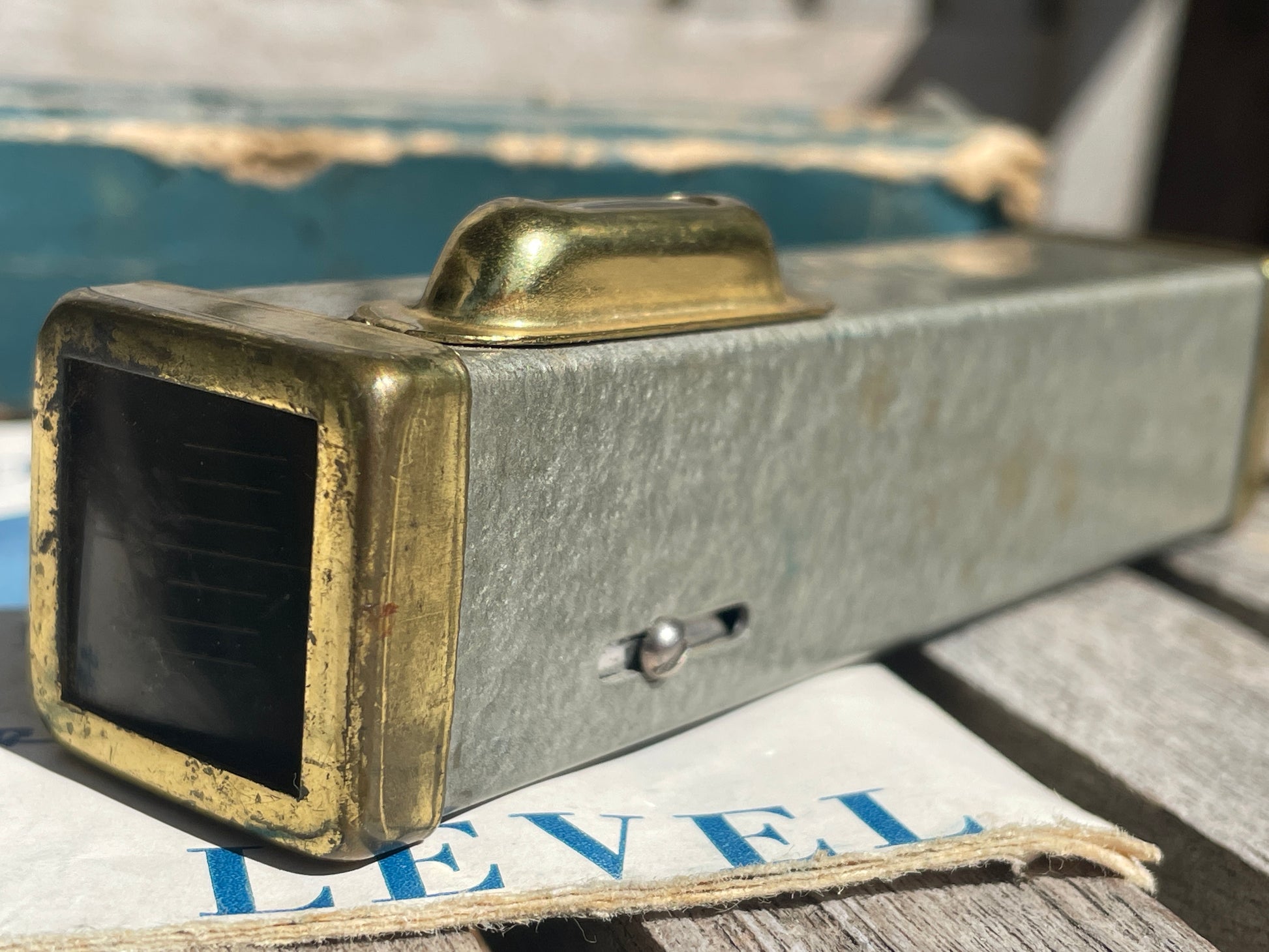 Good vintage condition. The level and optical sight appear functional. Brass shows some age-related patina; box is worn but intact. The sighting lens needs to be re-sited