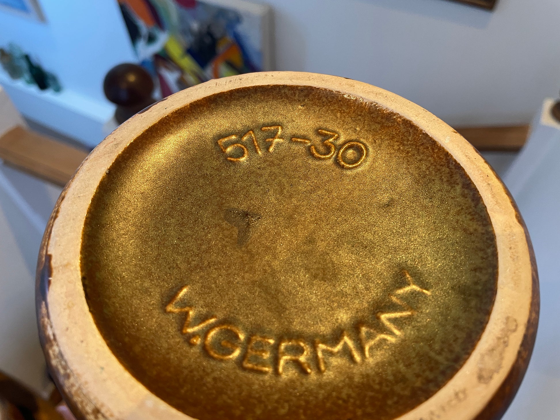 This style of glaze and form is closely associated with leading West German manufacturers such as Scheurich, Bay Keramik and Dümler & Breiden. As is common with many examples from this period, no specific maker can be definitively attributed without a factory stamp.