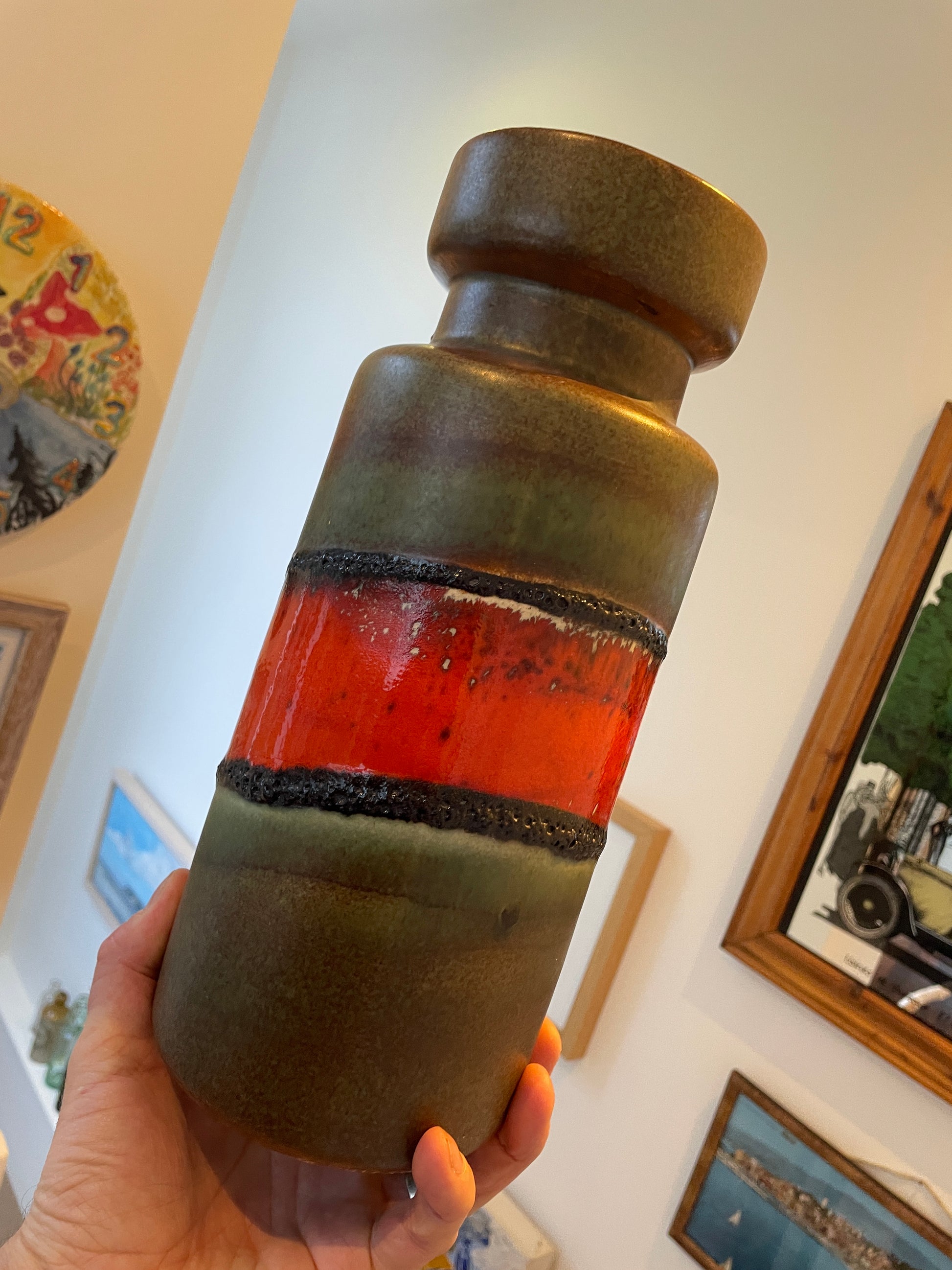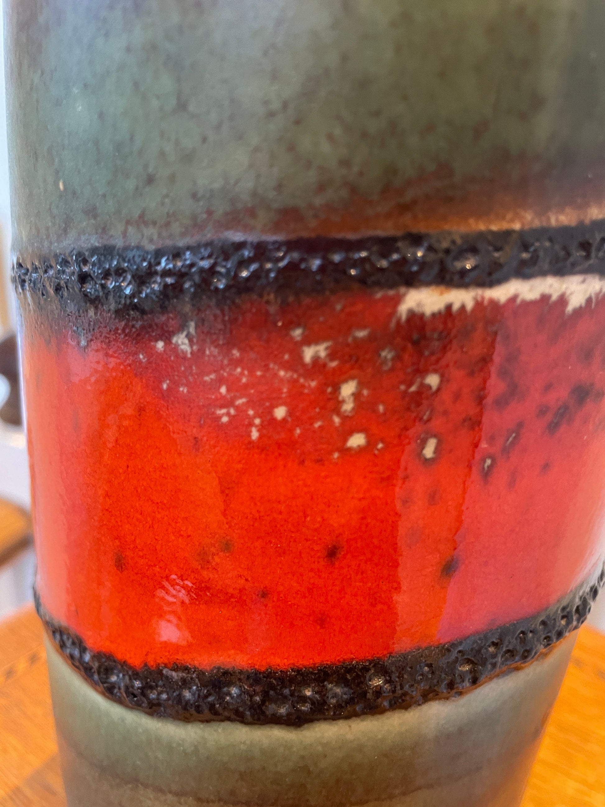 Vintage West German Fat Lava Floor Vase – Orange Lava Band & Green Glaze, 30cm Tall