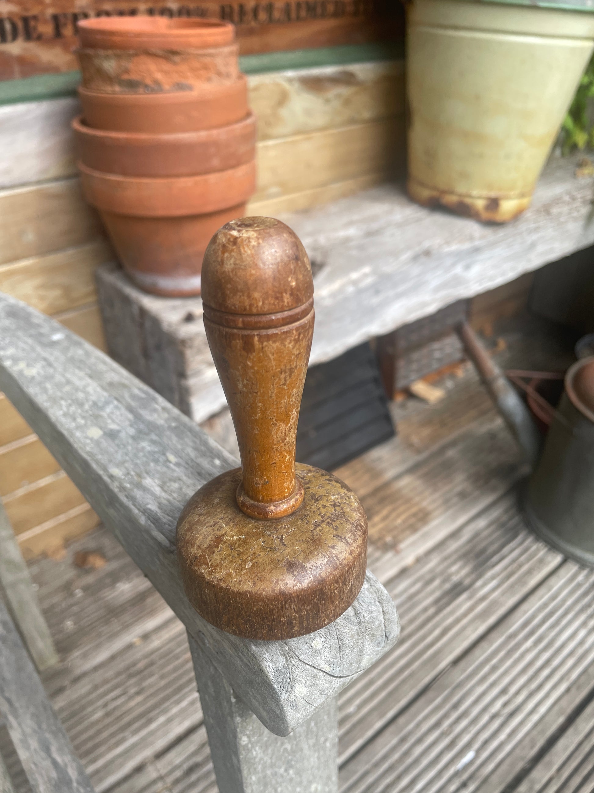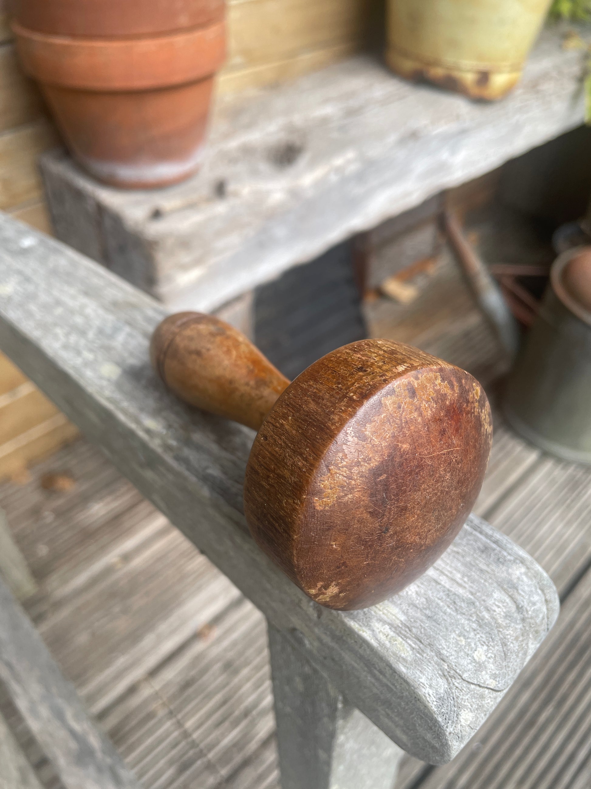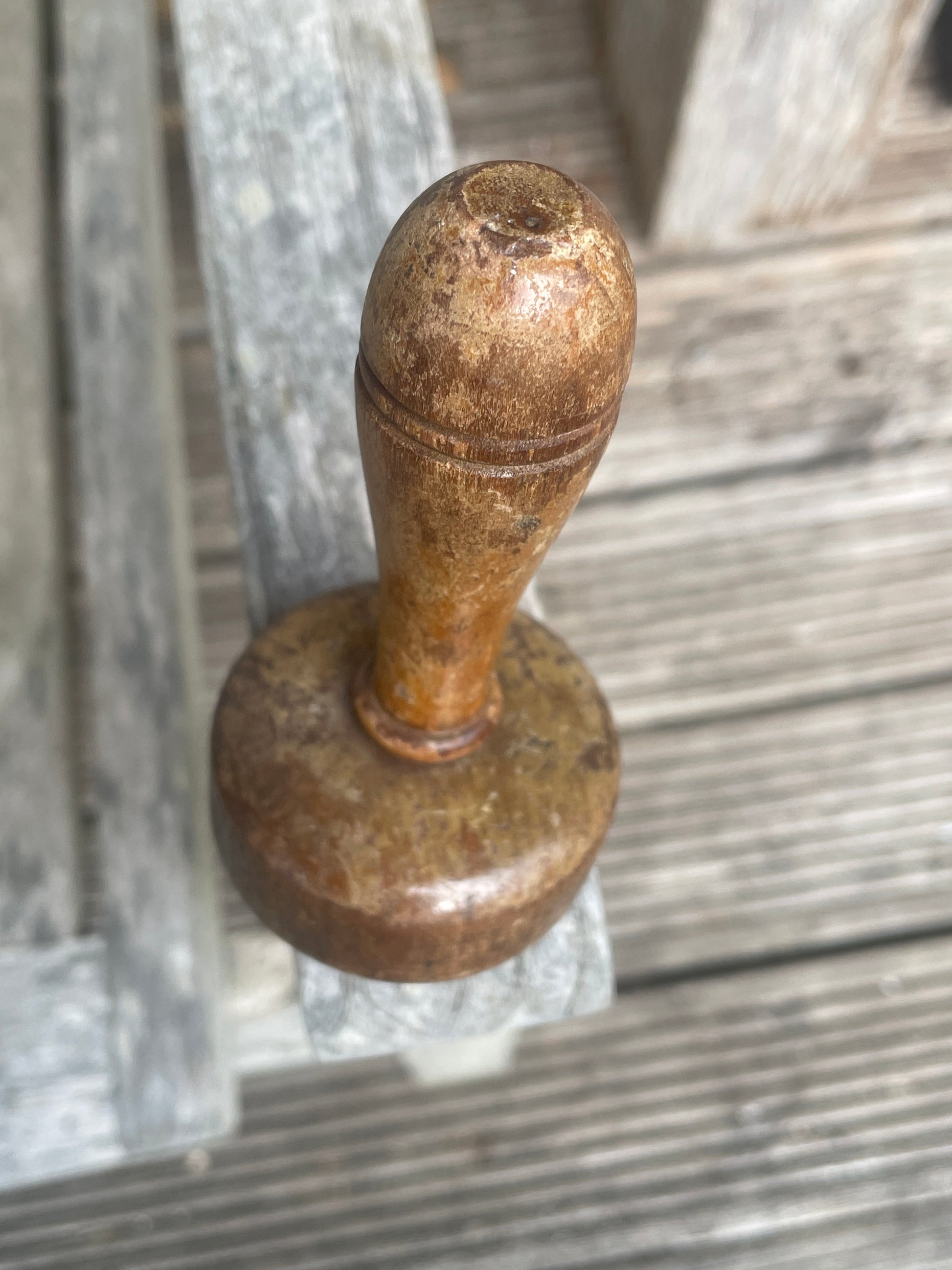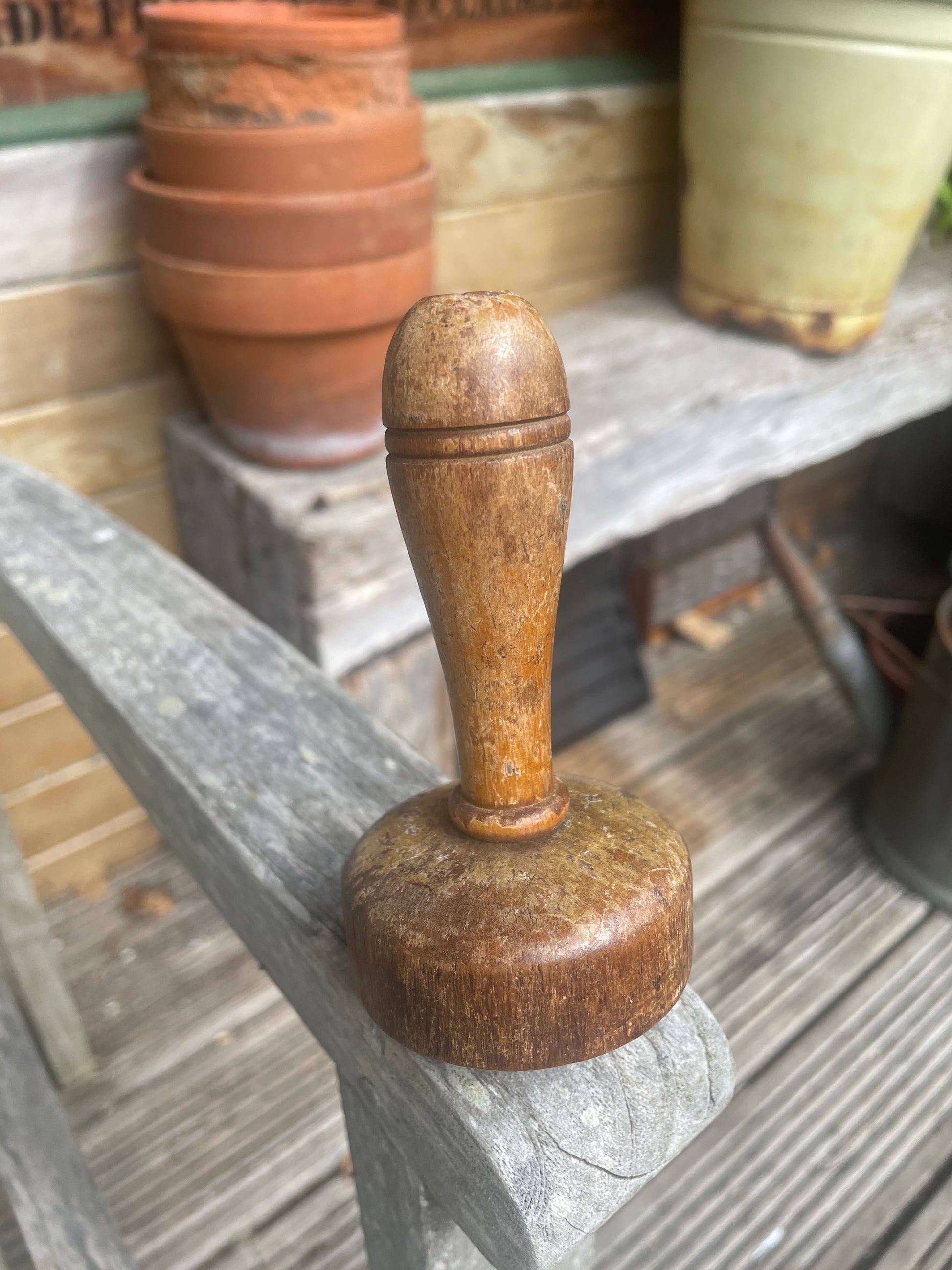 This example is turned from solid wood with a smooth, rounded top and a simple lathe-turned handle. It shows attractive signs of use and age, with a naturally worn patina, light surface marks, and scuffs that reflect decades of domestic utility.