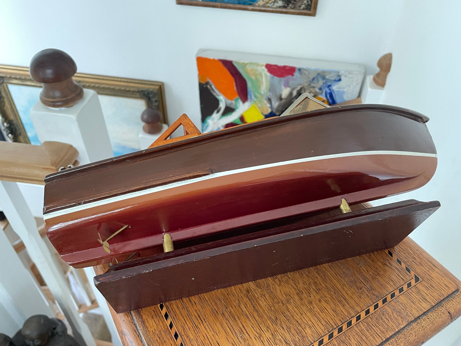 Vintage Wooden Model Speedboat on Stand – Handcrafted Mid Century Chris-Craft Style Motorboat, Varnished Display Boat with Brass Fittings