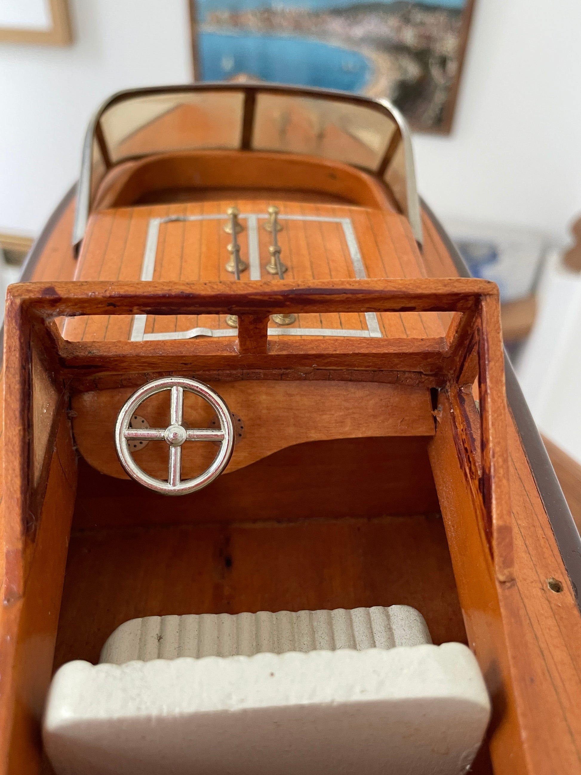Crafted in varnished mahogany and teak tones, this elegant model evokes the glamour of 1950s–60s luxury motorboats such as the Riva Aquarama and Chris-Craft runabouts. It features a curved windscreen, cream painted interior with twin seats, brass propeller, deck fittings, and steering wheel detail.